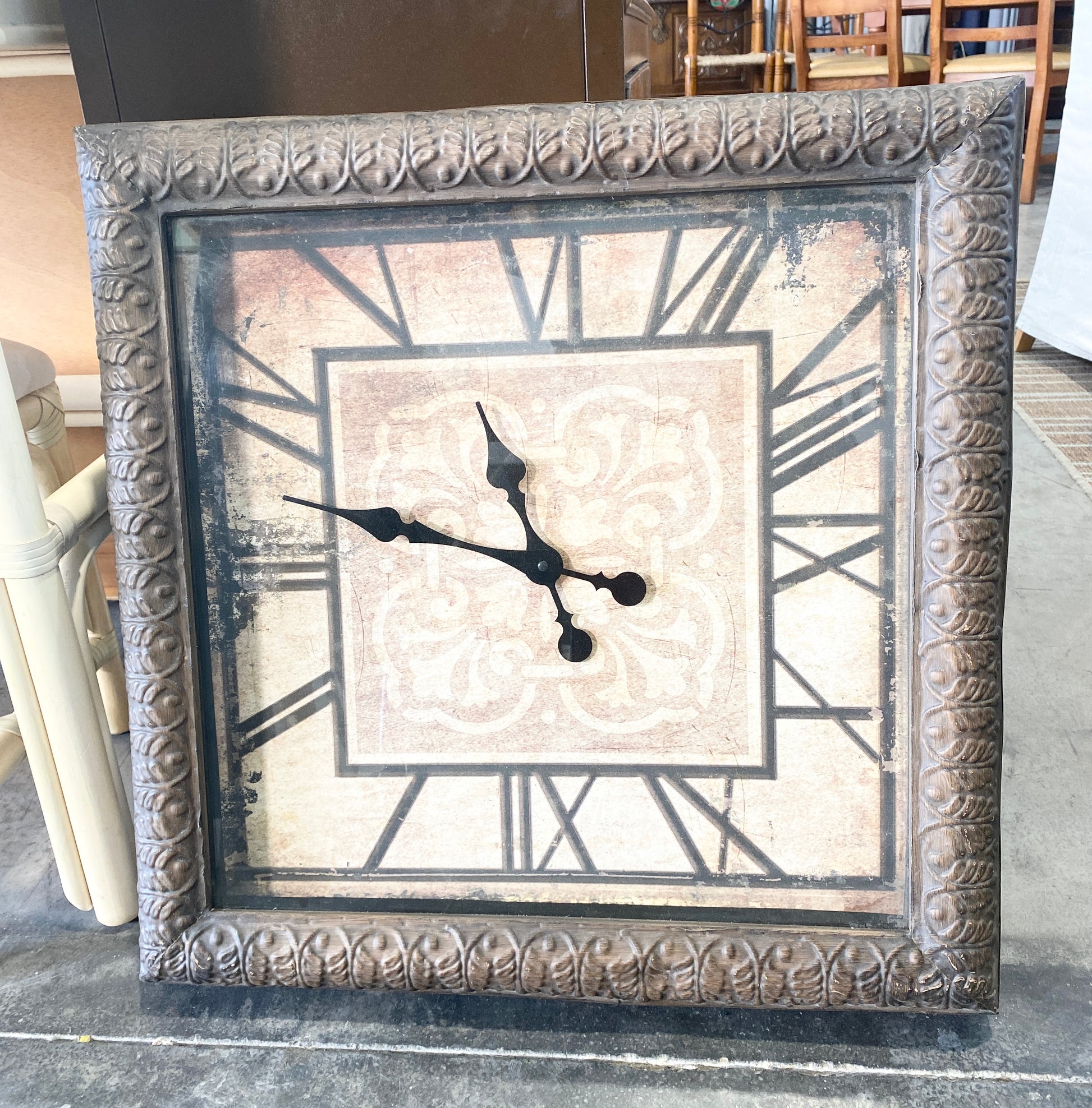 Este elegante relógio de parede vintage apresenta um grande mostrador quadrado, envolto numa moldura ornamentada.