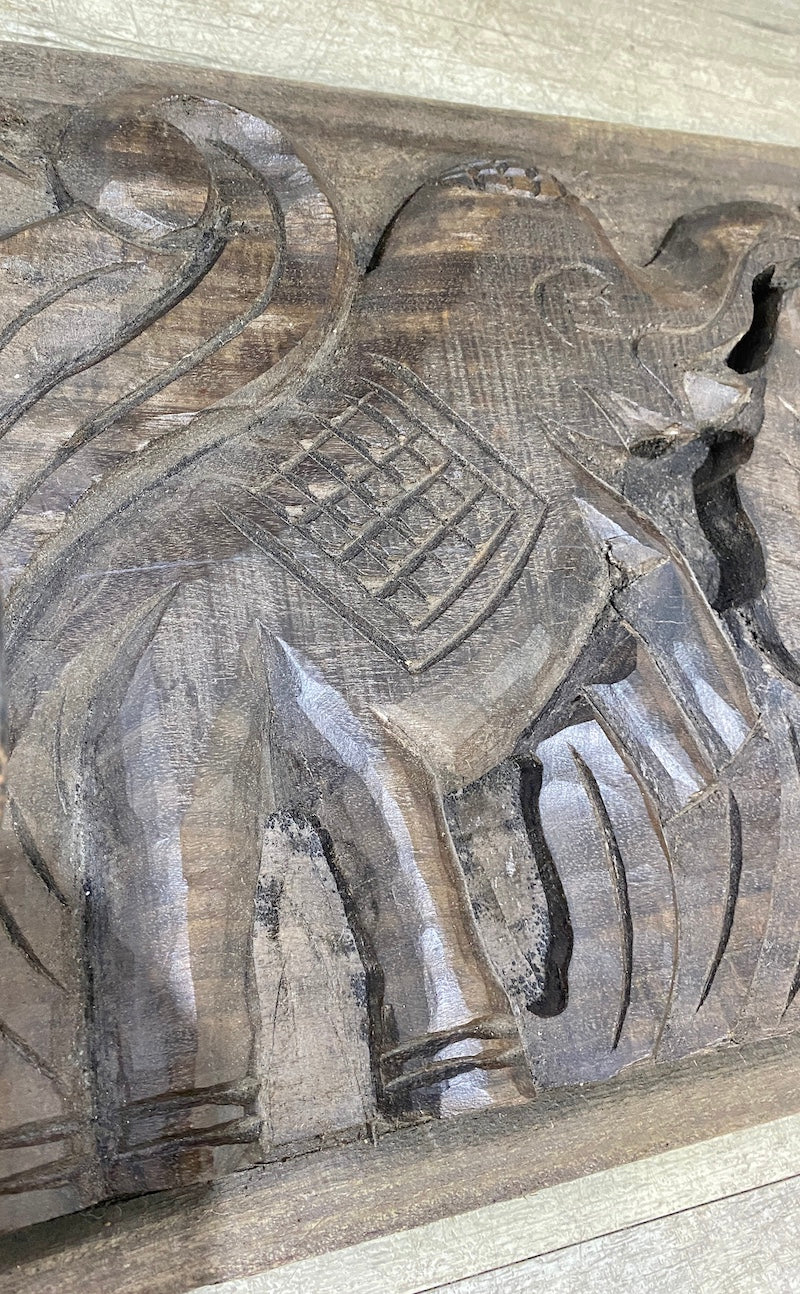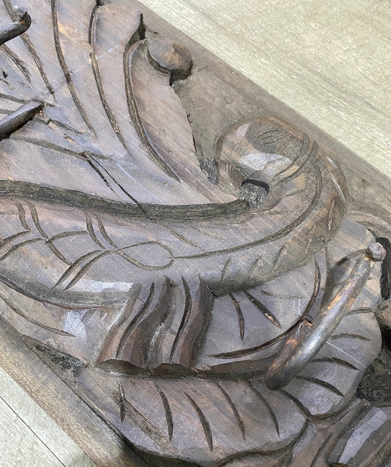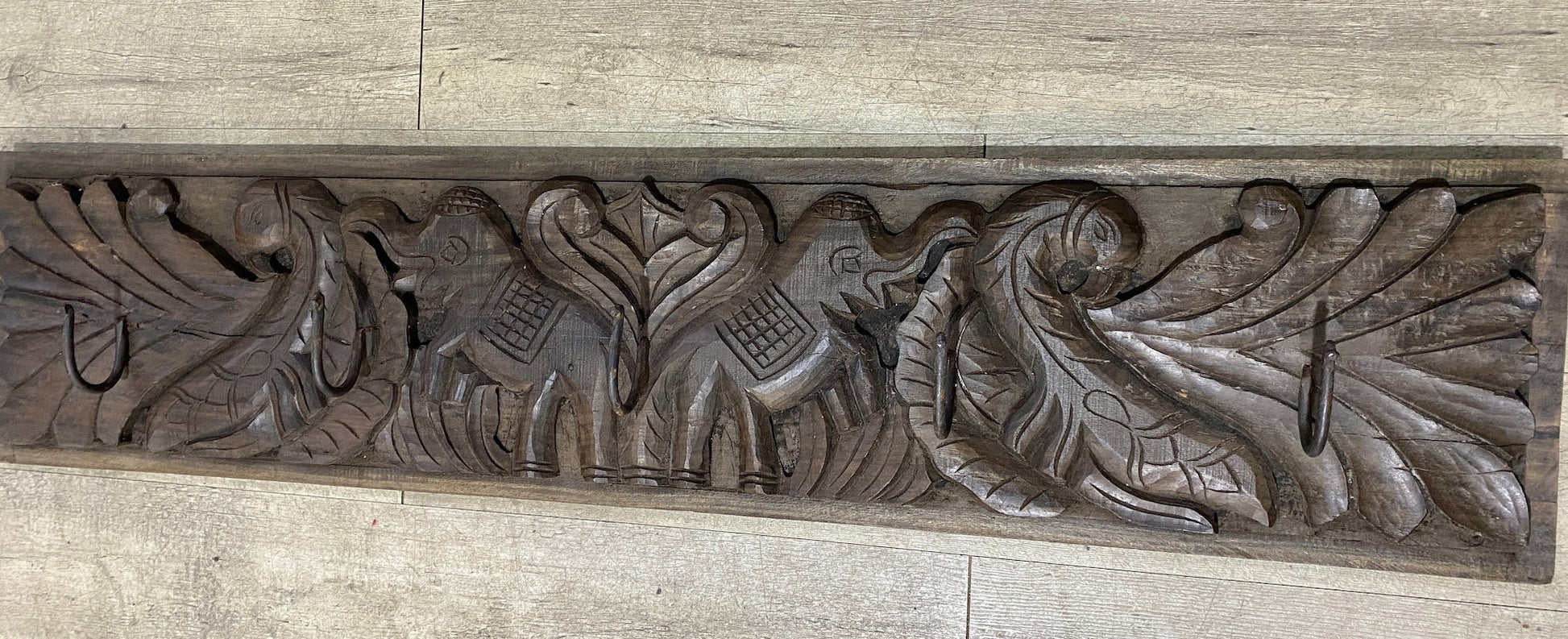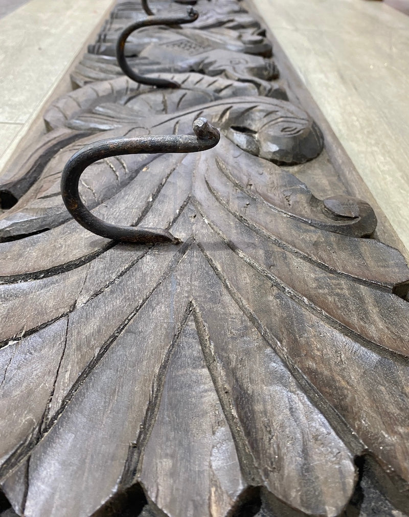 Este painel indiano habilmente esculpido teve ganchos de ferro adicionados para oferecer beleza e funcionalidade.