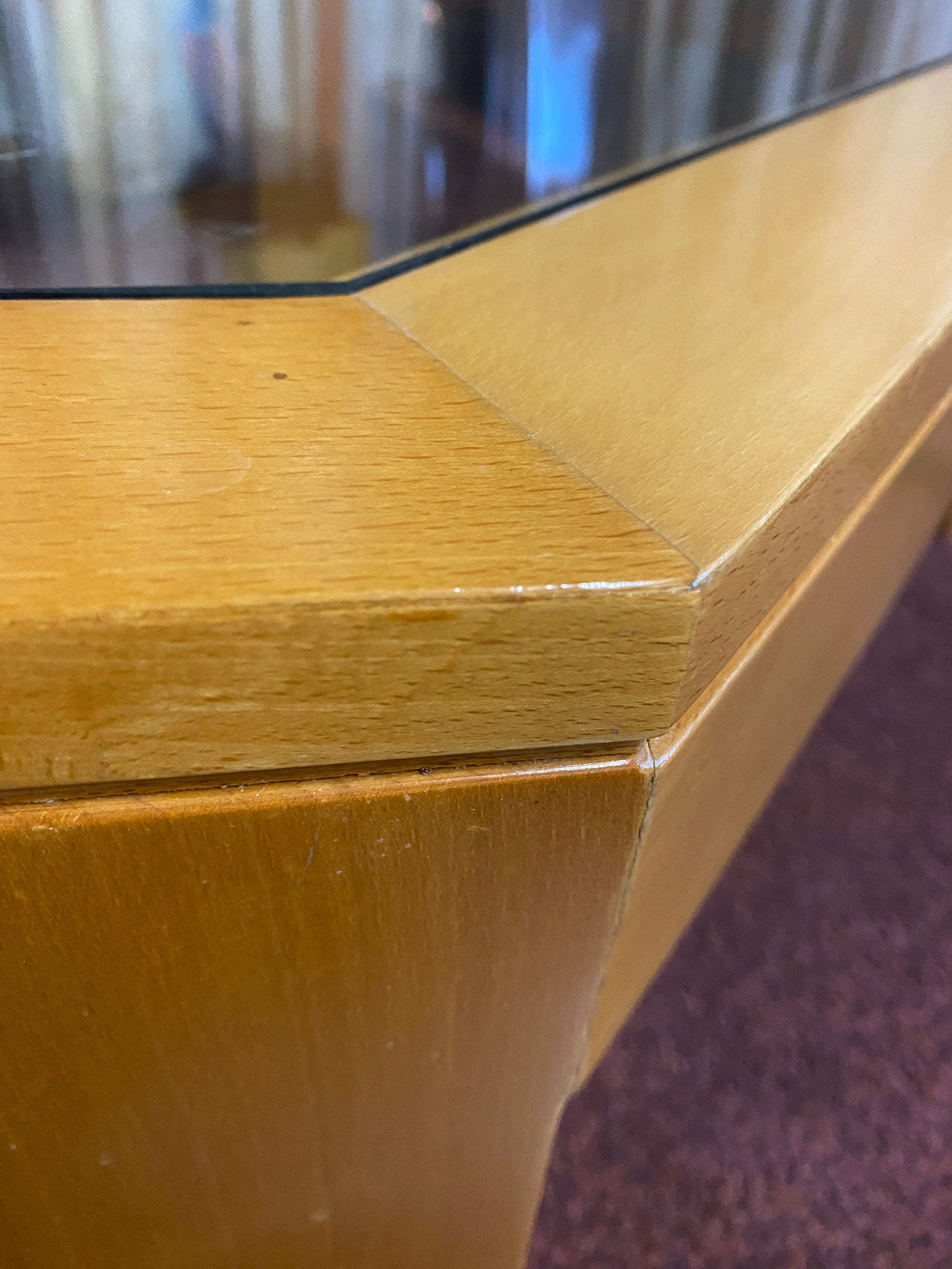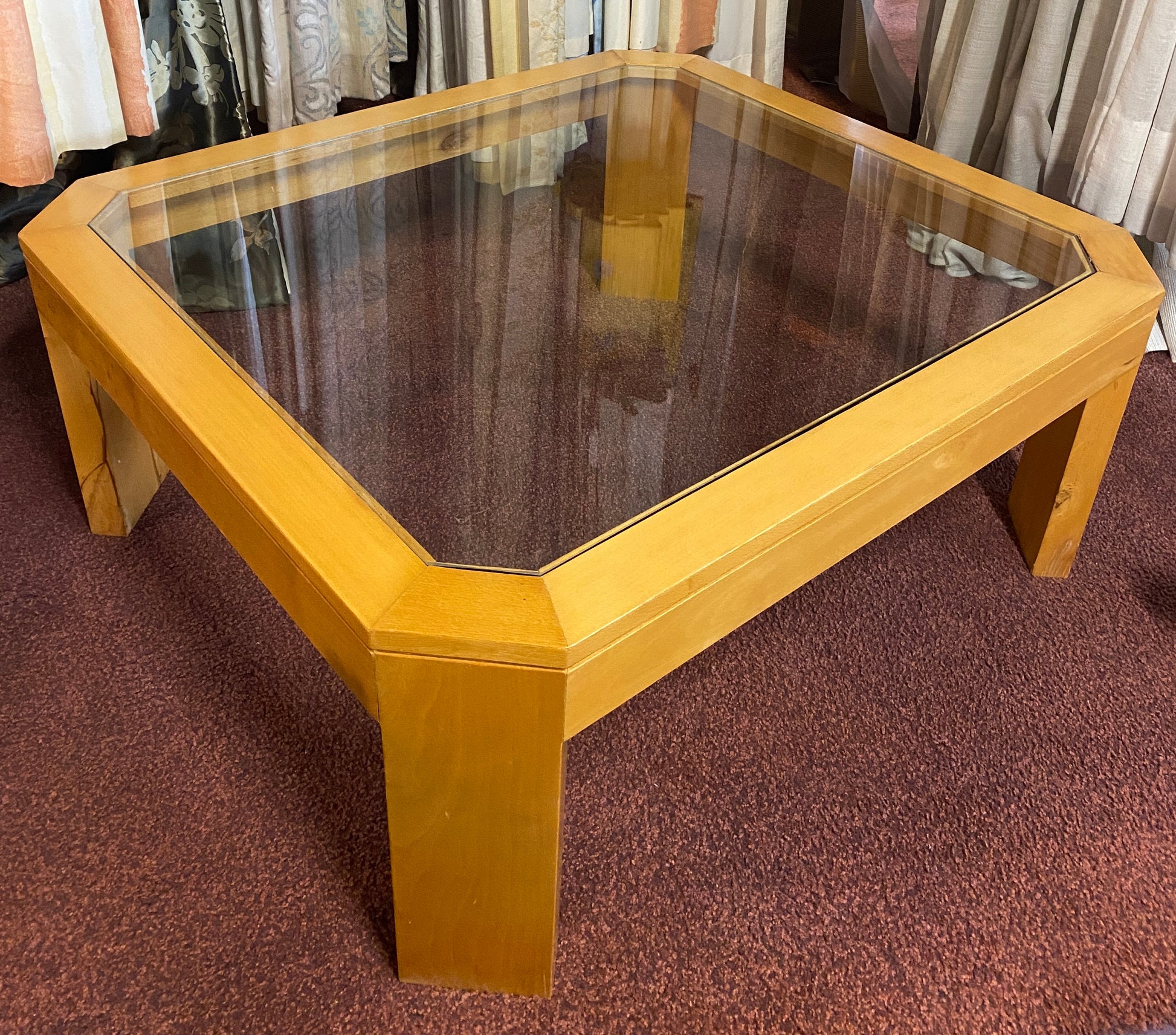 A varnished pine coffee table with a glass centre. In good condition, this table has a shallow rectangle shape with blunt corners.