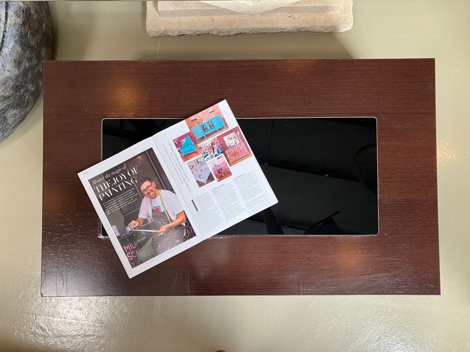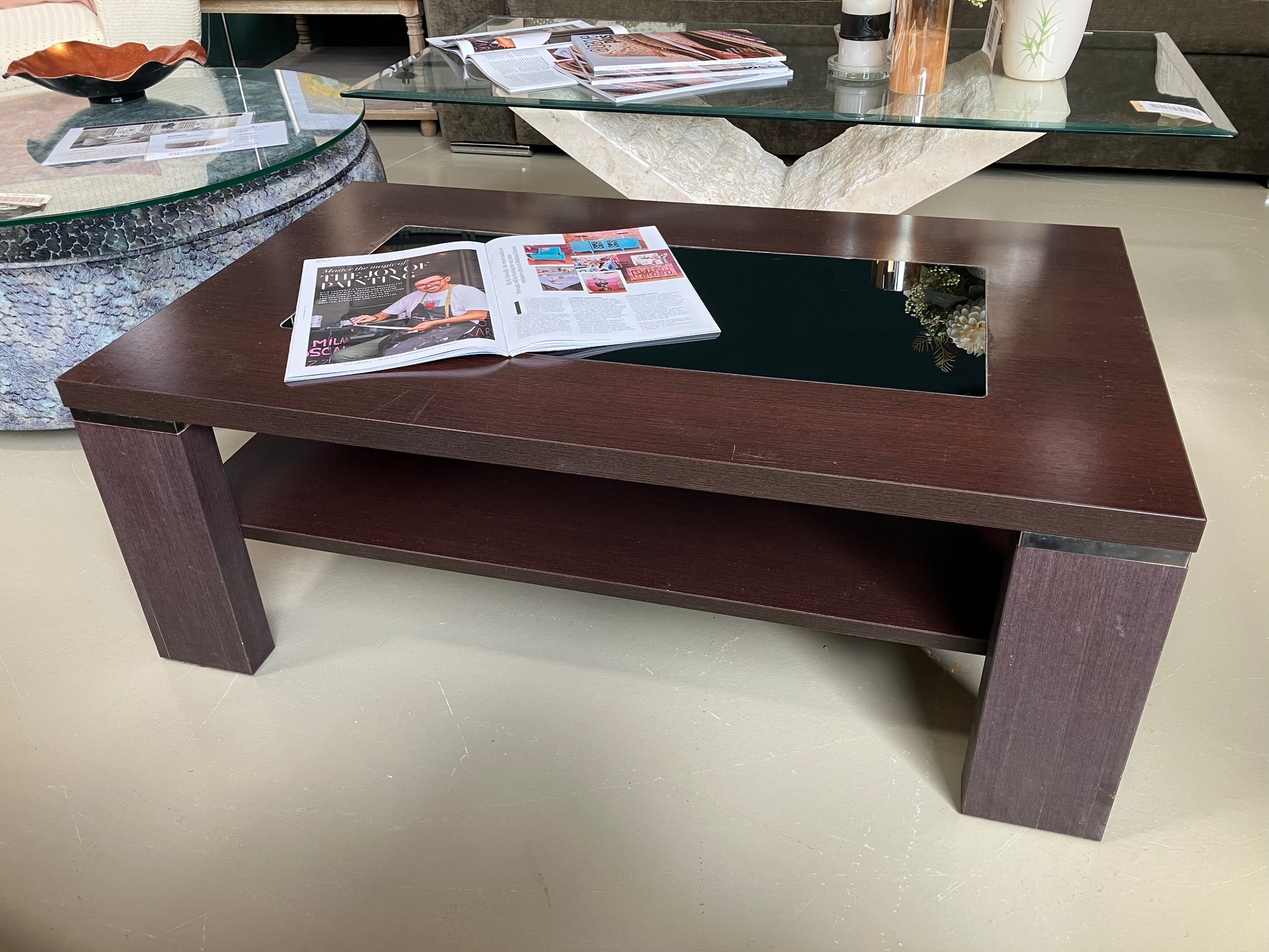 Uma mesa de centro em tom espresso ousado com centro de vidro preto brilhante — perfeita para adicionar um toque de elegância moderna à sua sala de estar.