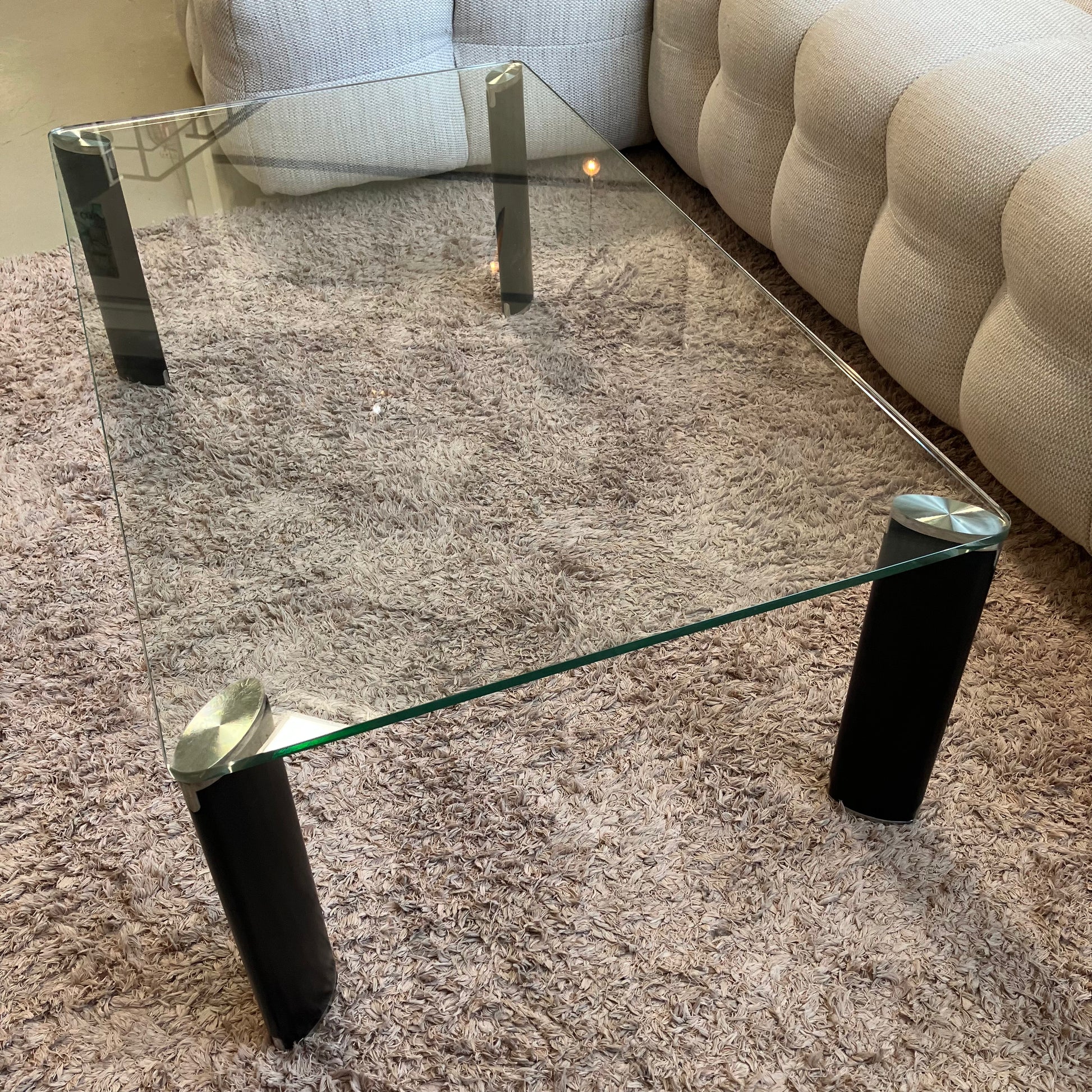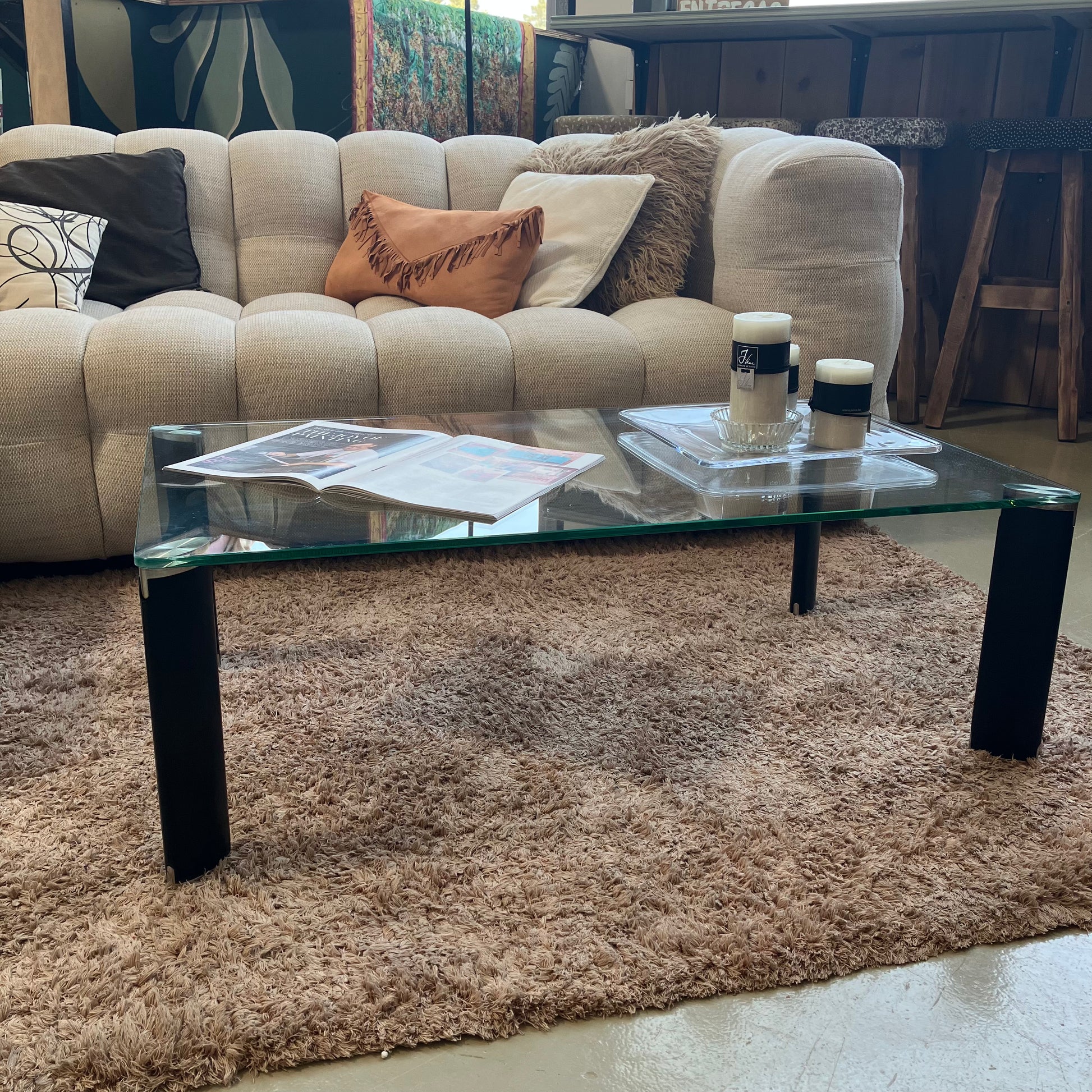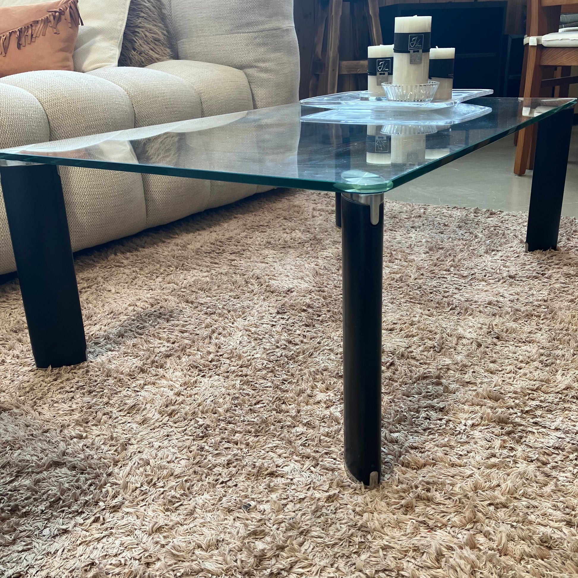 Contemporary coffee table with clear glass top supported by sturdy black cylindrical legs.