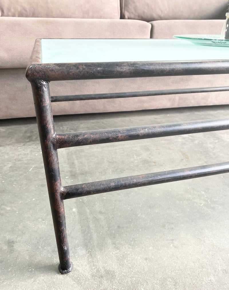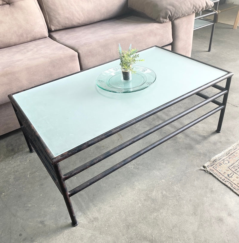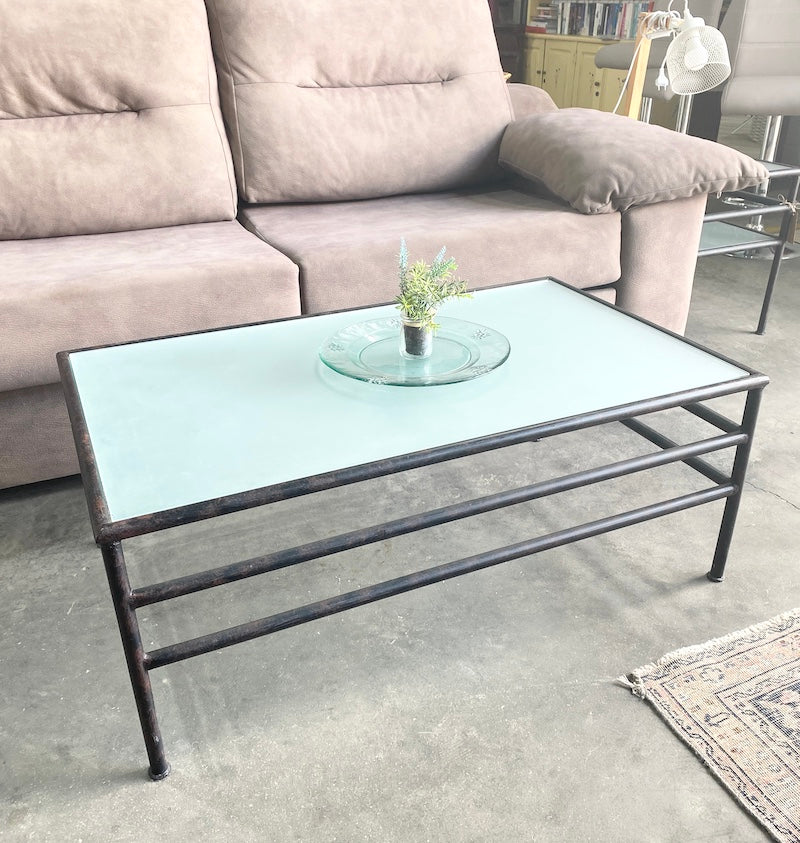 Uma mesa de centro retangular com estrutura em ferro forjado e tampo em vidro fosco.