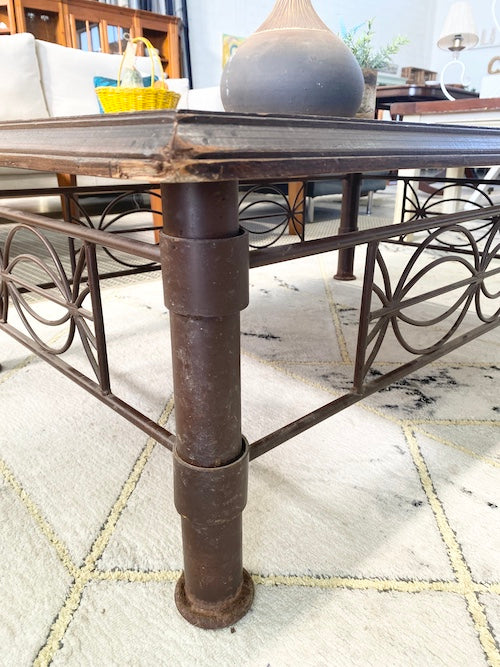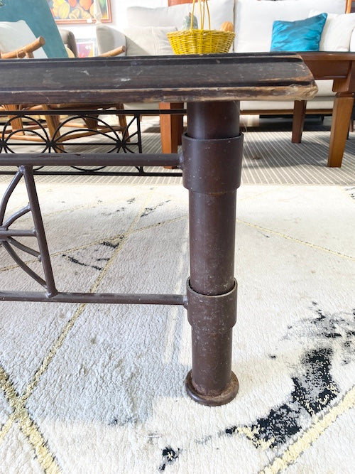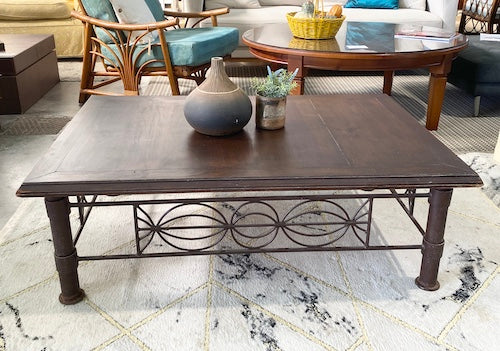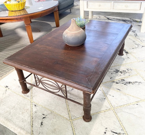 This striking coffee table blends rustic charm with industrial flair. The solid dark wood top provides a good surface for everyday use, while the sturdy metal leg casing with geometric detailing adds, strength and character.
