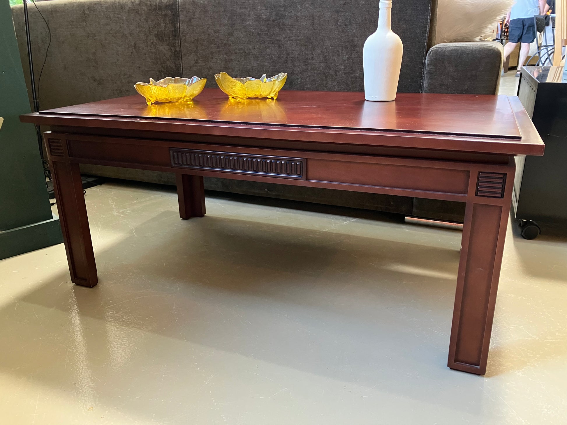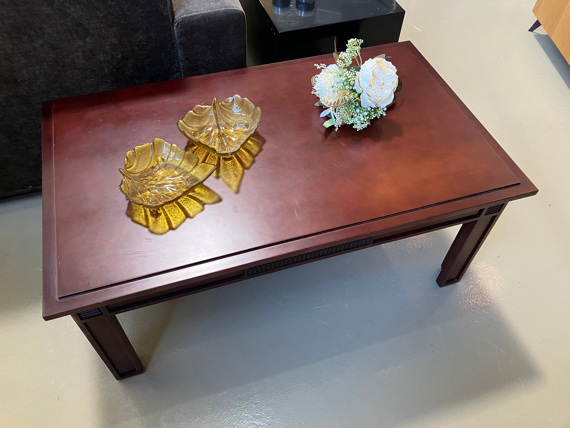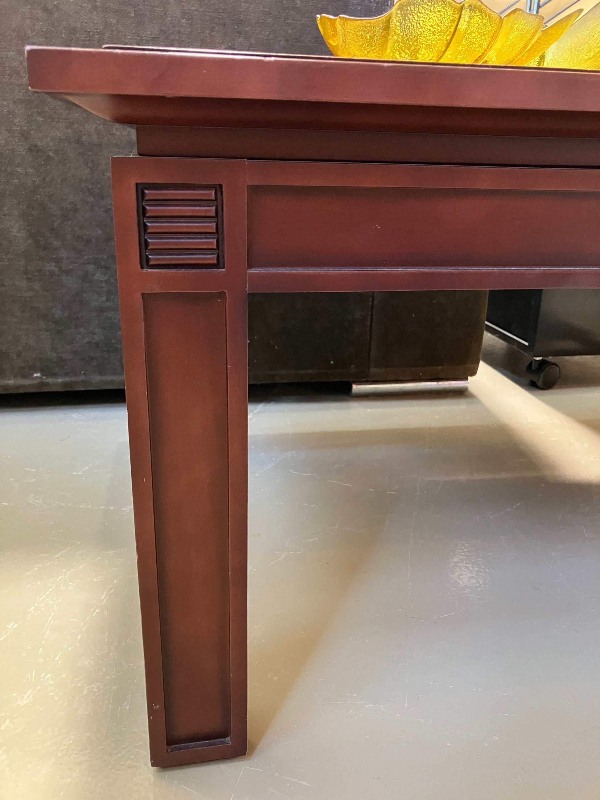 Uma mesa de centro robusta com um acabamento avermelhado intenso e detalhes de linhas simples e intrincadas. Perfeita para uma sala de estar ou sala de estar, oferece um amplo espaço de superfície para bebidas, decoração ou material de leitura.