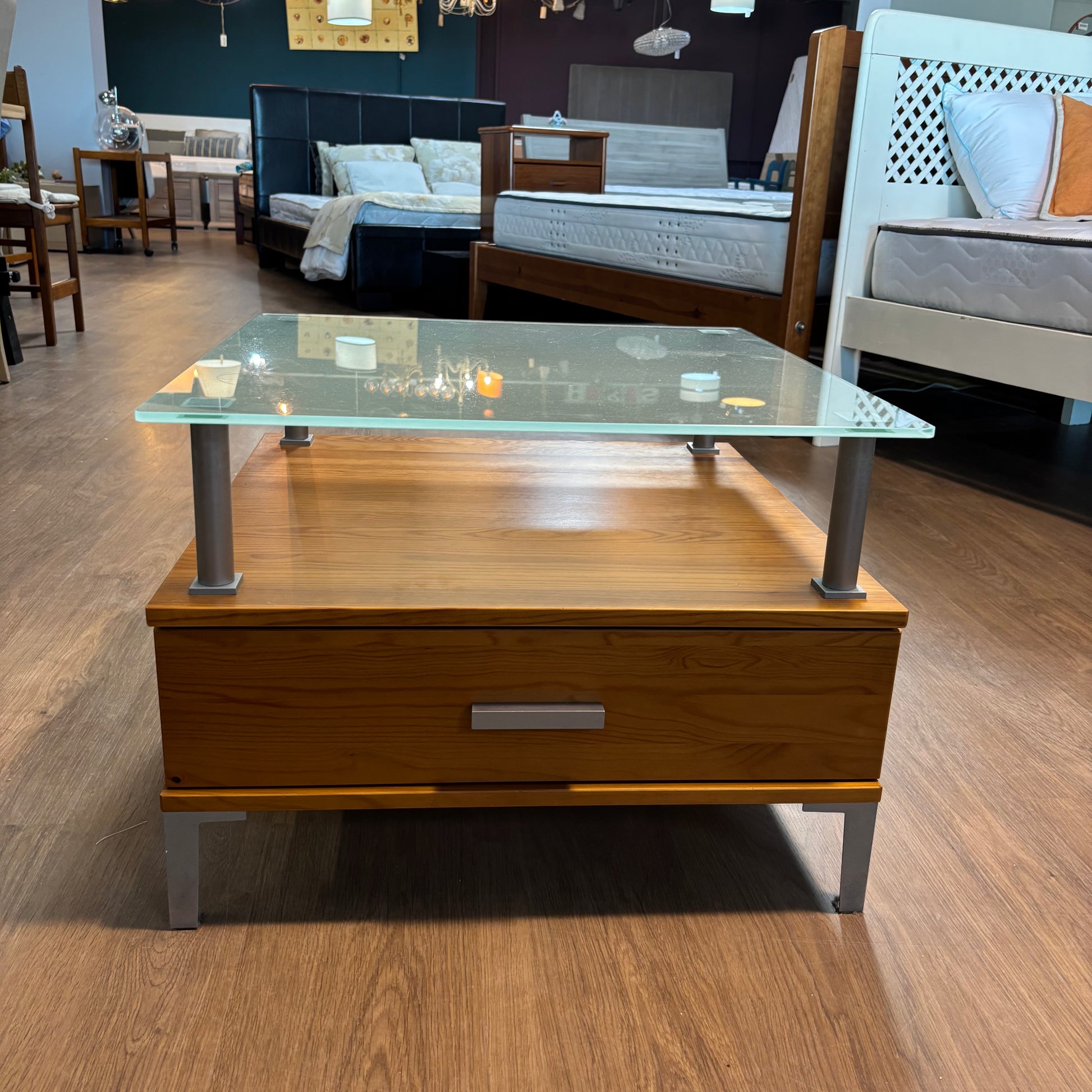 Mesa de centro com tampo em vidro, base em madeira maciça e duas gavetas. Linhas simples, estrutura robusta e ideal para qualquer sala de estar.