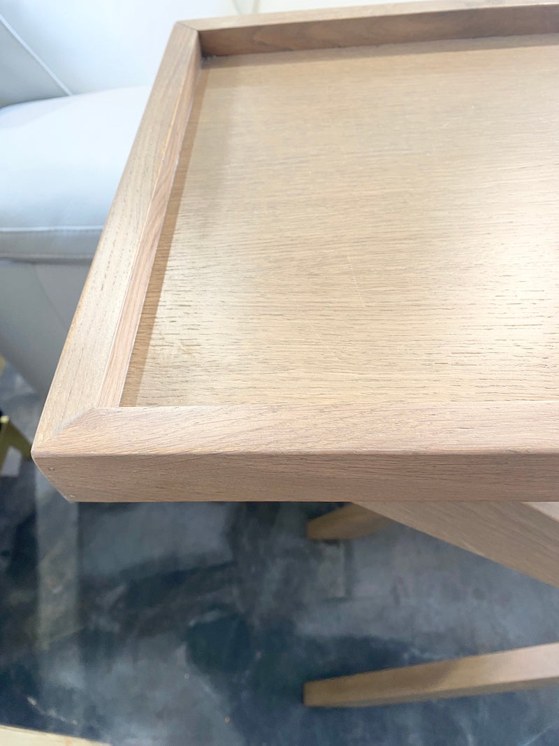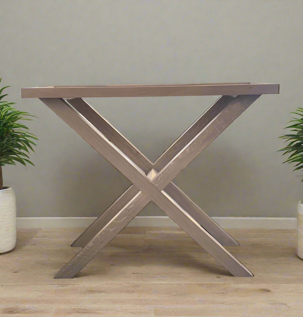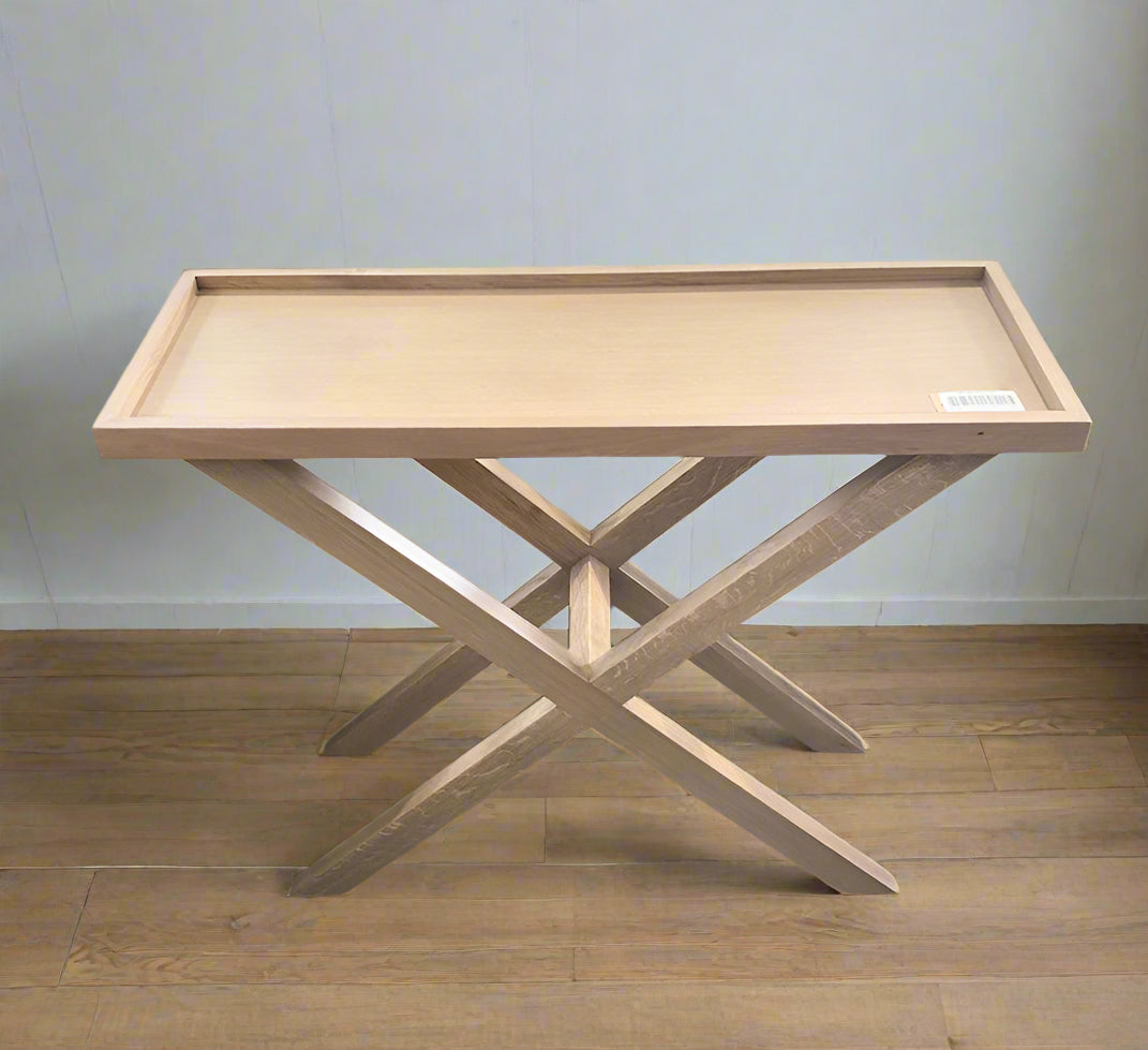 Uma consola de madeira feita à mão e à medida, com um design simples de pernas cruzadas e tampo em forma de bandeja.
