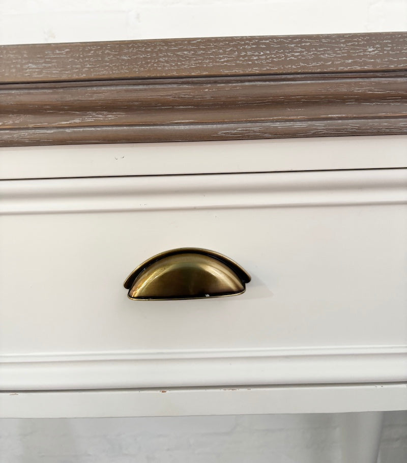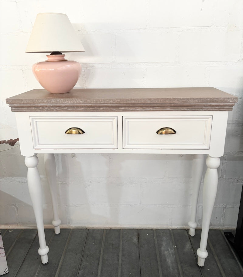 Uma consola branca, fina e em madeira maciça, que se encaixaria perfeitamente numa casa contemporânea com estilo campestre. Possui duas gavetas com puxadores em tom de latão que lhe conferem um acabamento encantador. O tampo tem um acabamento encerado num tom natural de cal.