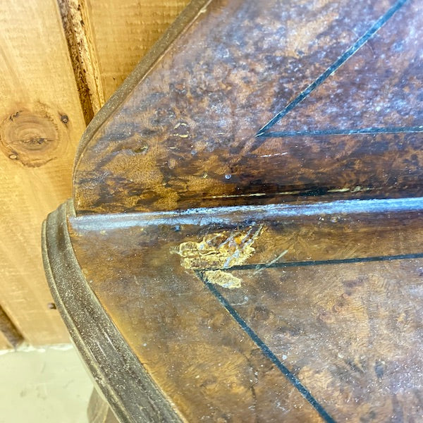 Esta bonita mesa consola vintage apresenta um tampo folheado a nogueira com belos detalhes, realçando a riqueza dos veios naturais e a profundidade da madeira. A sua elegante frente serpentina, suportes esculpidos e prateleira inferior acrescentam muito carácter.
