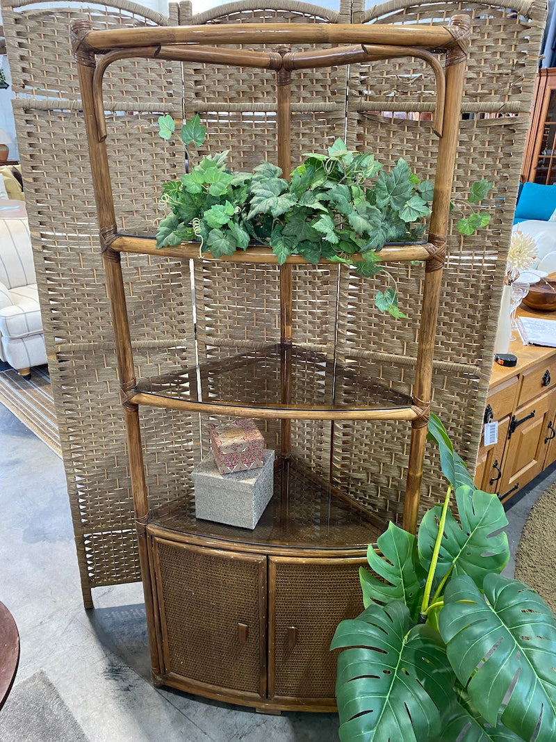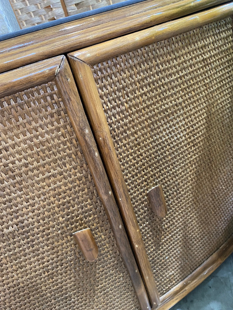 Um móvel de canto em bambu com duas prateleiras em vidro ligeiramente fumado. O armário de duas portas tem belos detalhes em rattan. Use-o tal como está ou pinte-o com a cor da sua preferência.