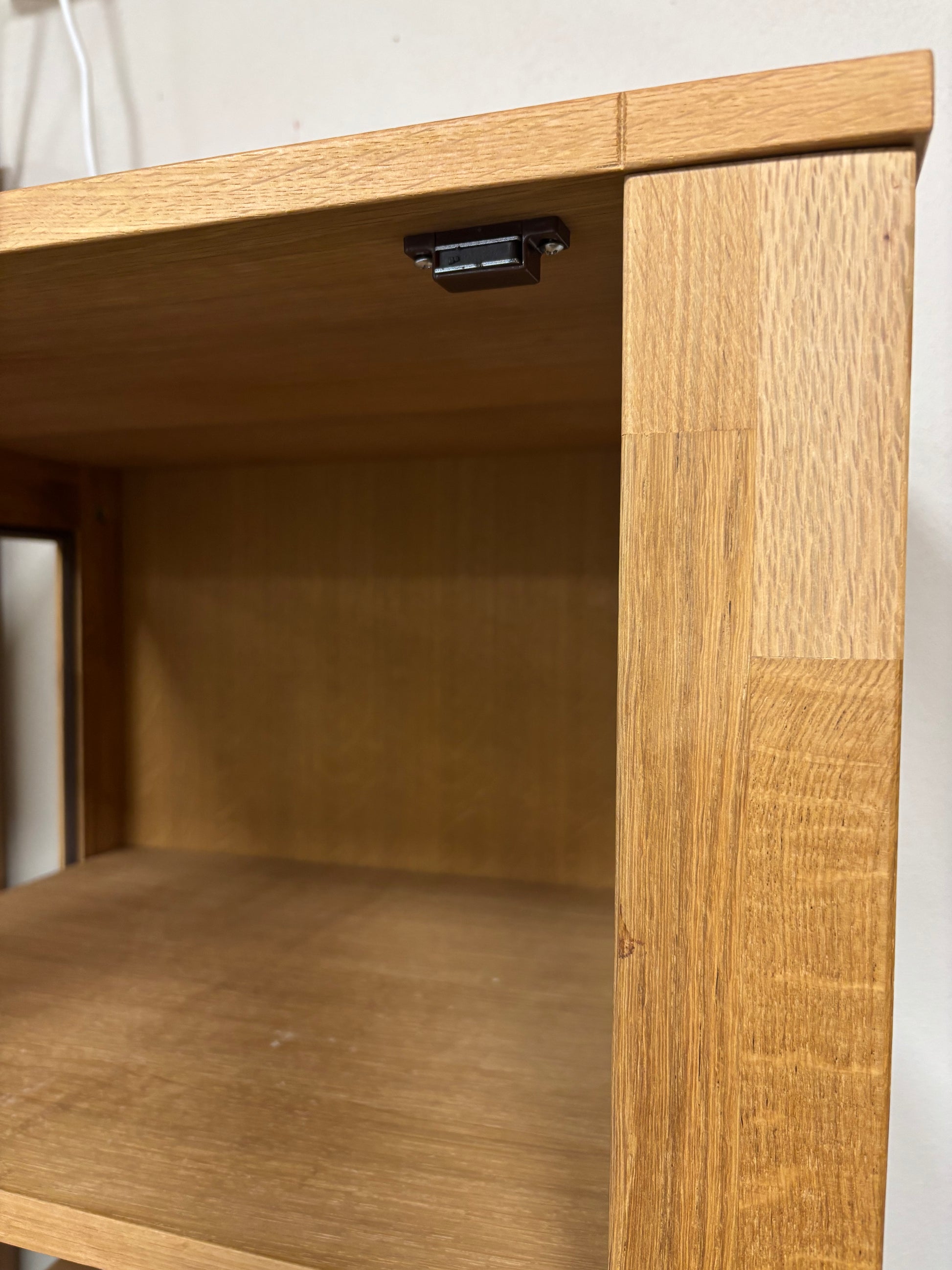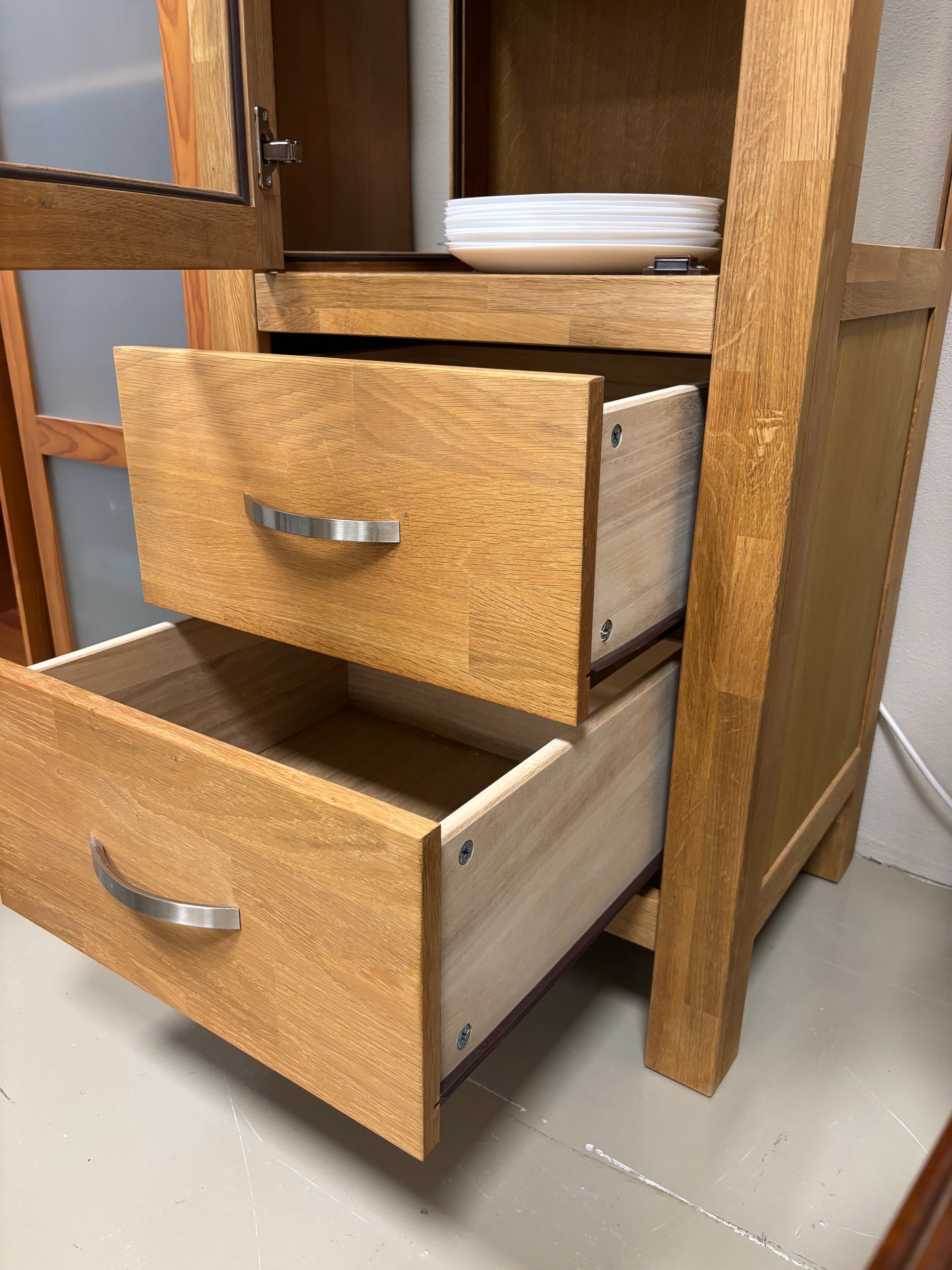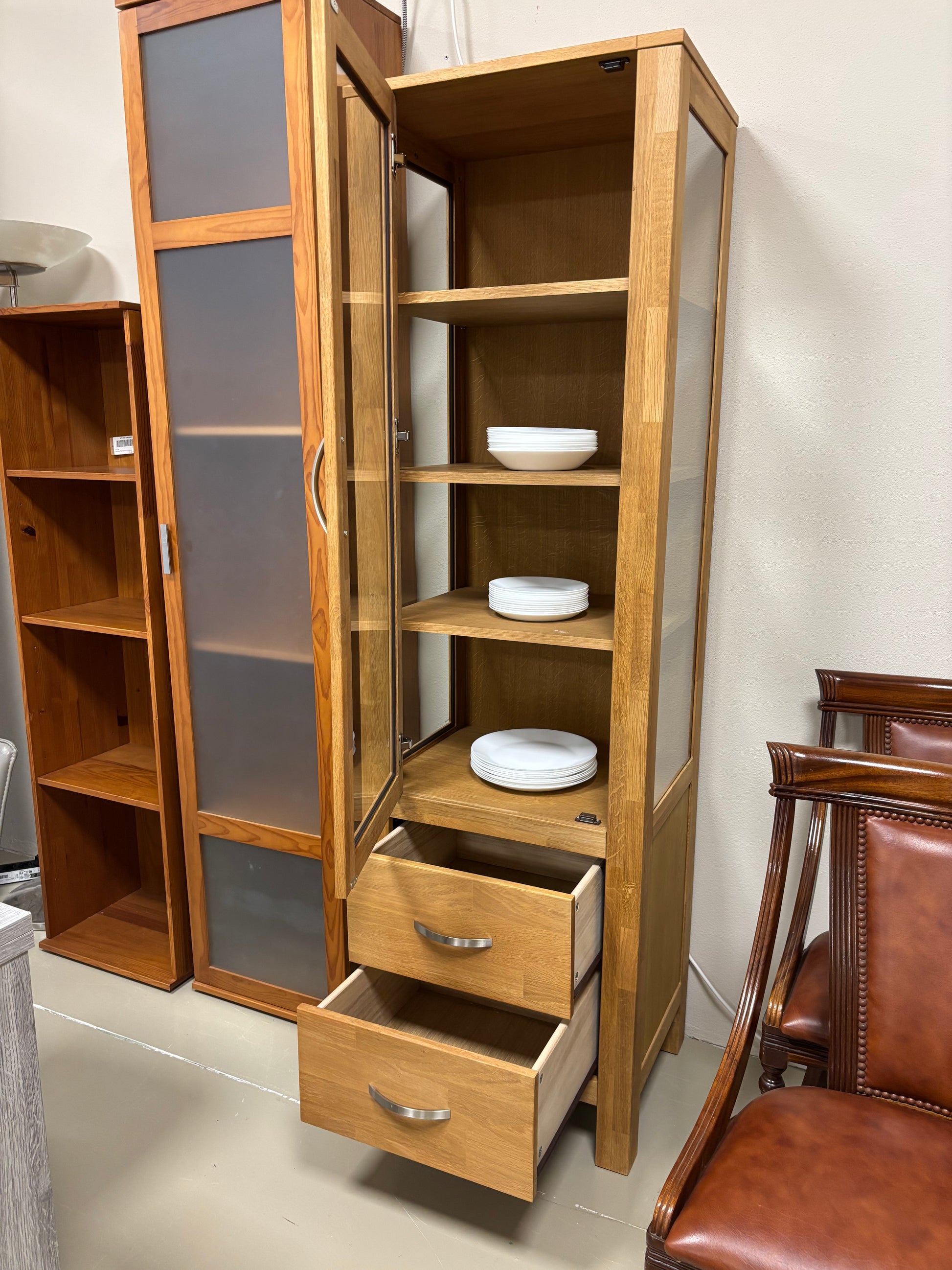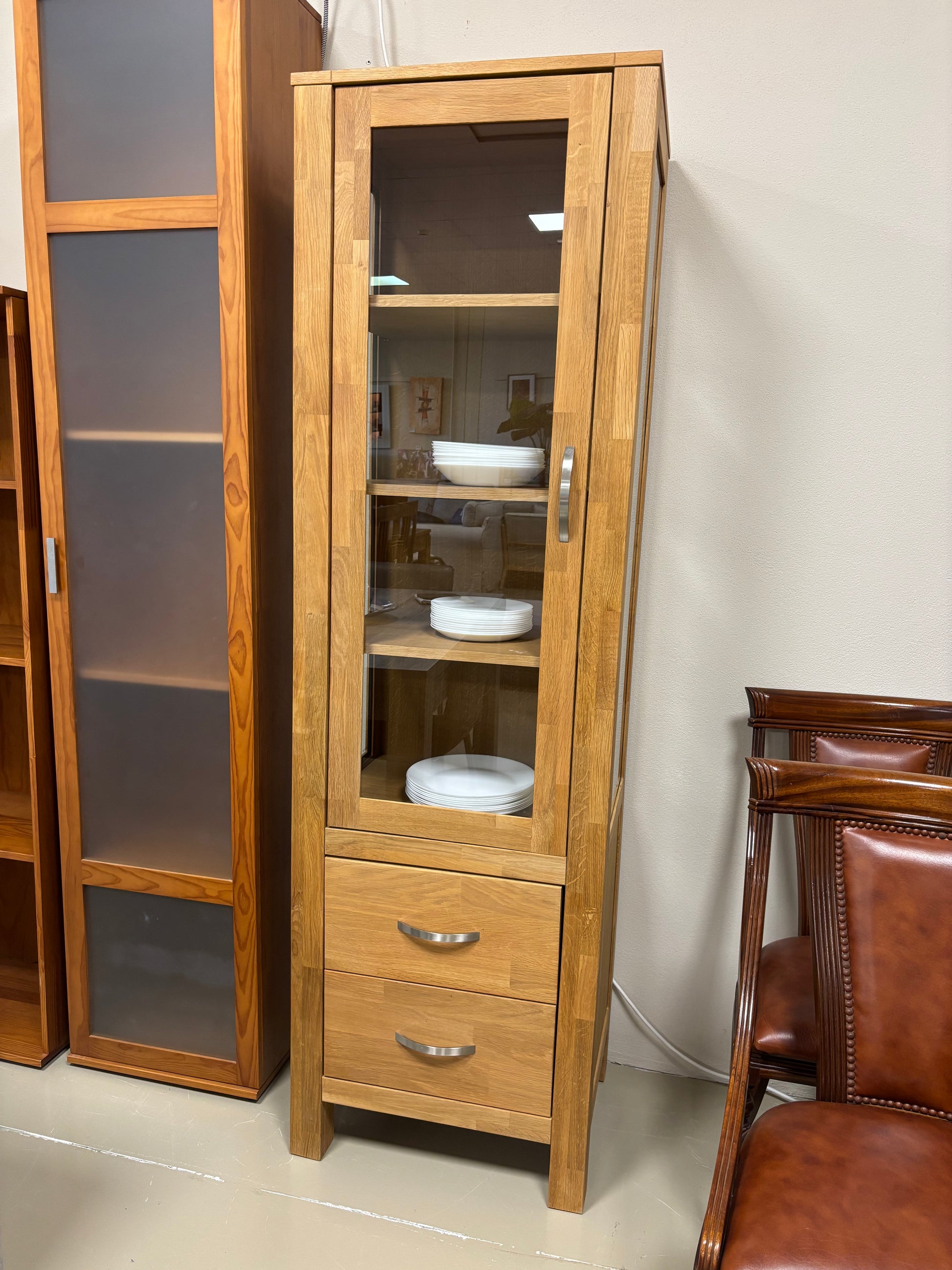 Elegante armário alto com frente em vidro, prateleiras ajustáveis e duas gavetas inferiores, perfeito para combinar arrumação e exposição em qualquer divisão.