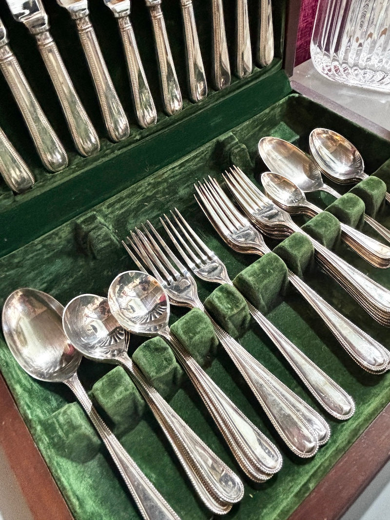 Esta caixa de madeira contém um conjunto completo de talheres banhados a prata.