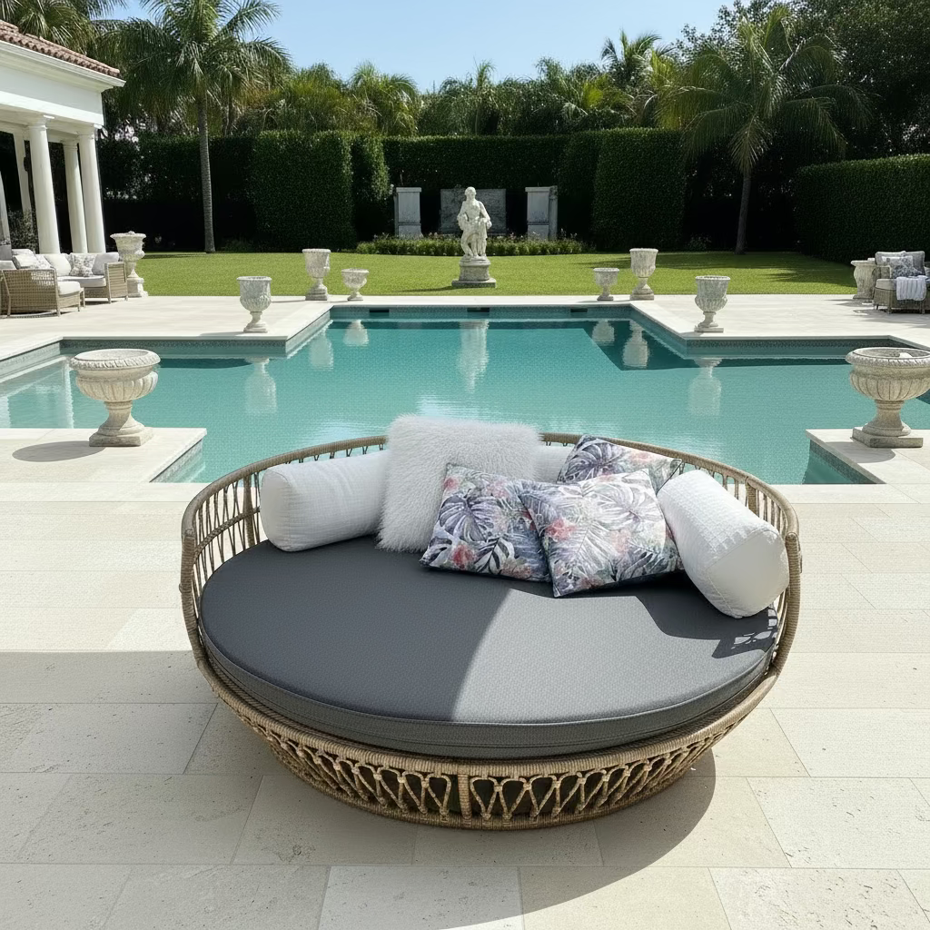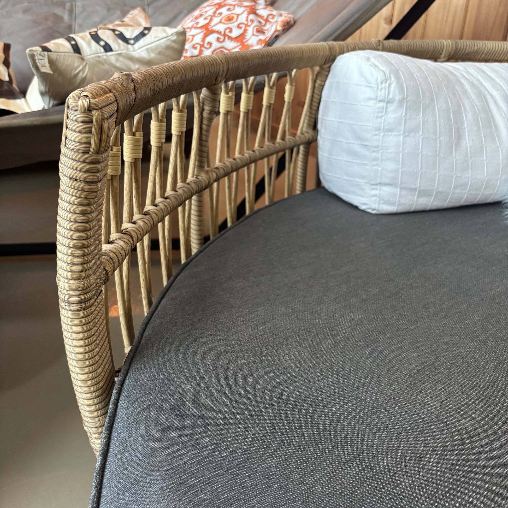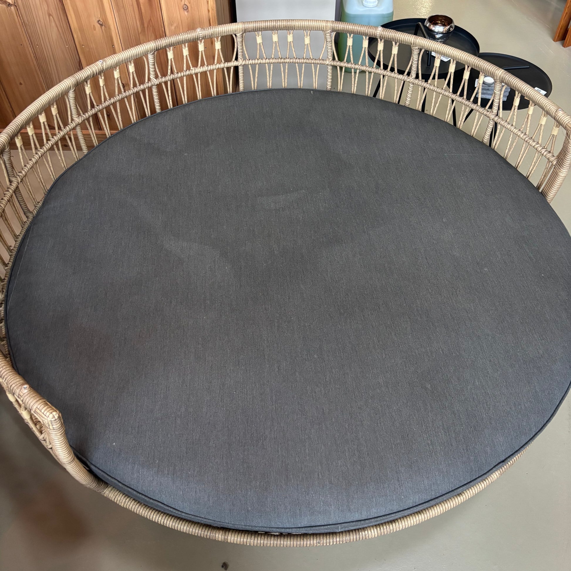 Elegante espreguiçadeira circular em rattan com almofada cinza macia. Ideal para relaxar em ambientes interiores ou exteriores, oferecendo um local acolhedor e elegante para descansar em qualquer lugar.