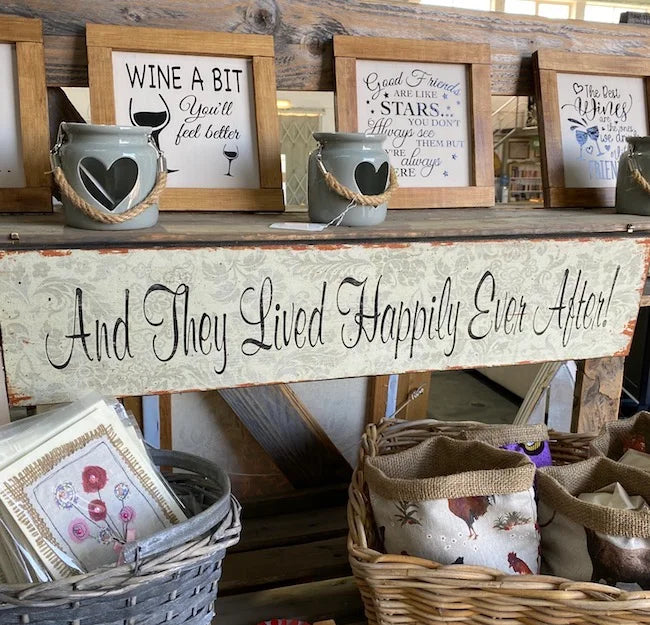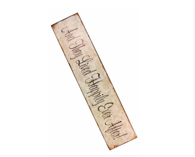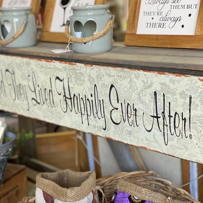 Uma grande placa de madeira “And They Lived Happily Ever After”. Lindamente decorada e com um acabamento shabby chic antigo e desgastado.