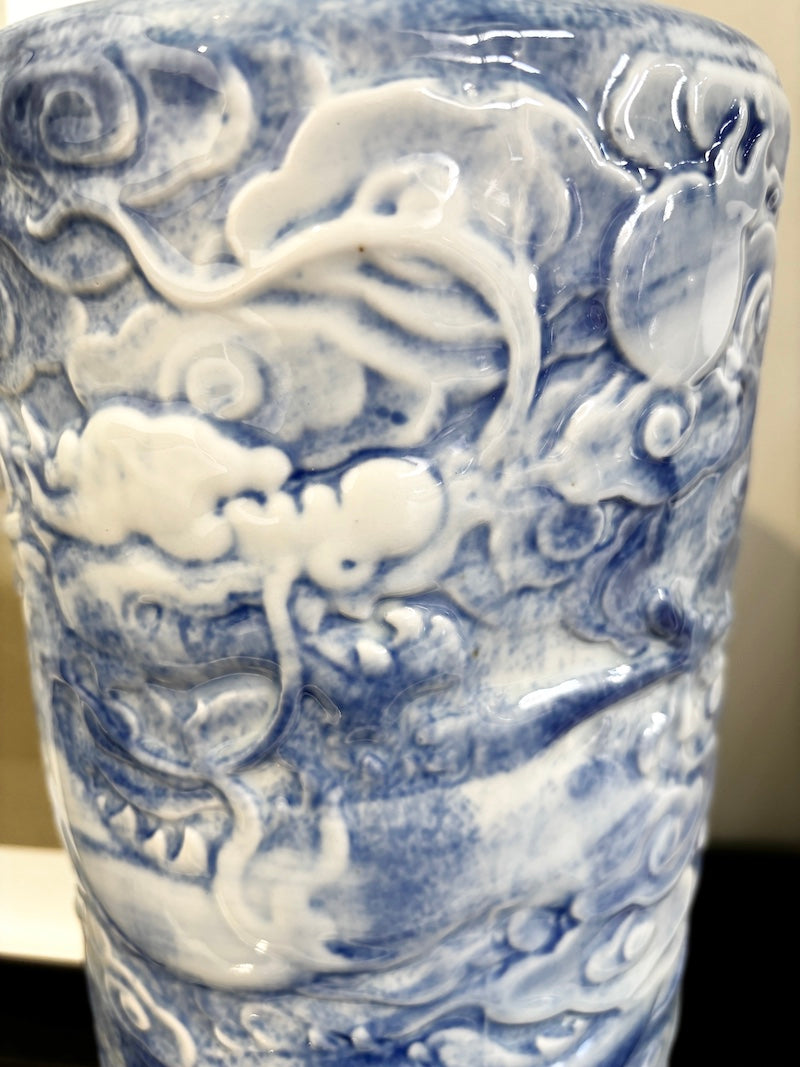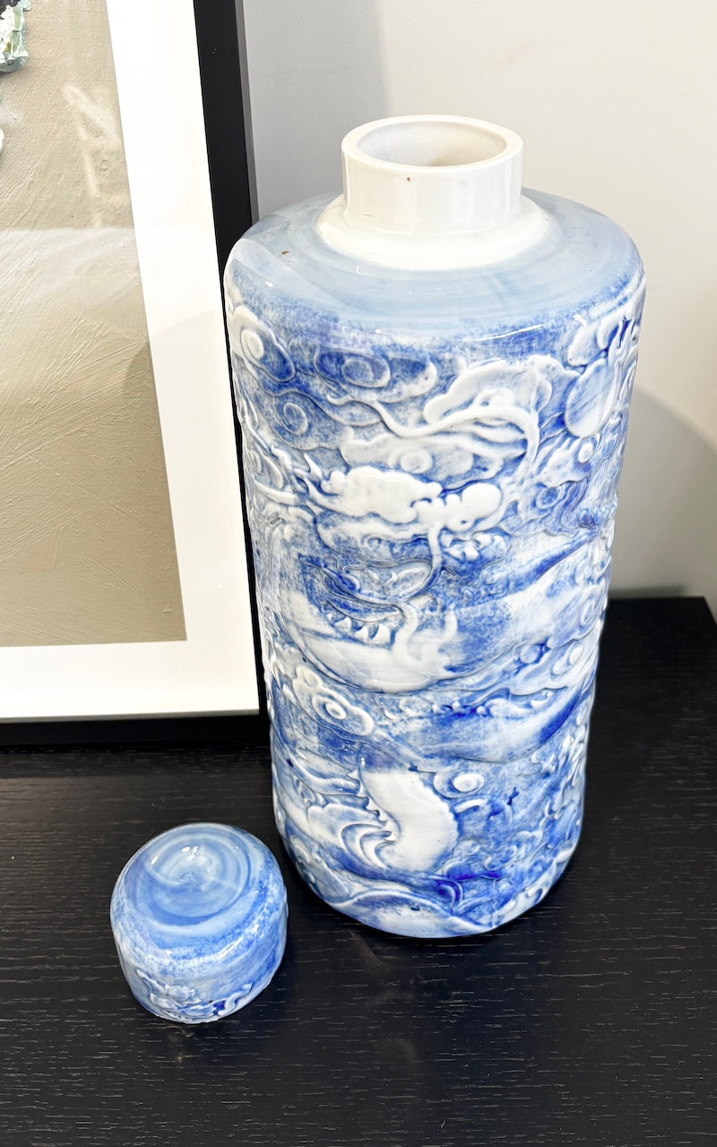 Este jarro de cerâmica não só foi pintado com um belo esmalte azul suave com um padrão, como também tem um relevo texturizado que combina com a pintura.