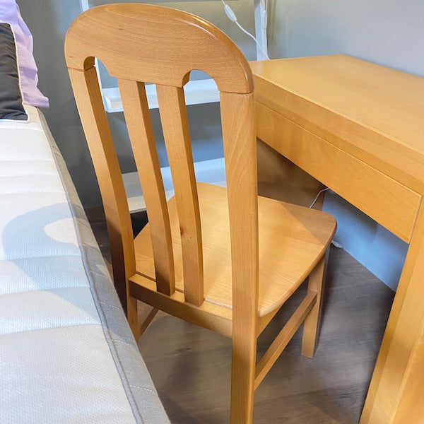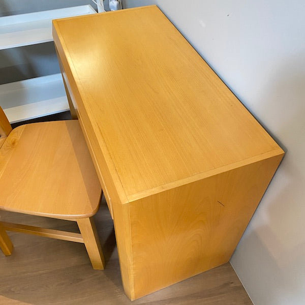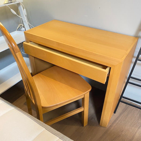 Secretária simples e robusta com acabamento liso estilo carvalho e uma gaveta para artigos de papelaria ou acessórios. Acompanha cadeira a condizer. Também pode ser utilizada como toucador, basta adicionar um espelho e está pronta.