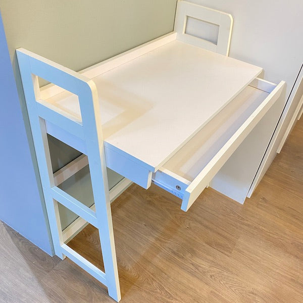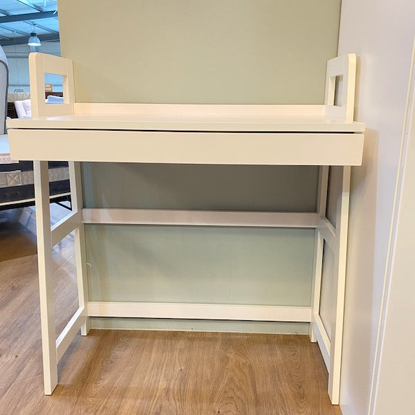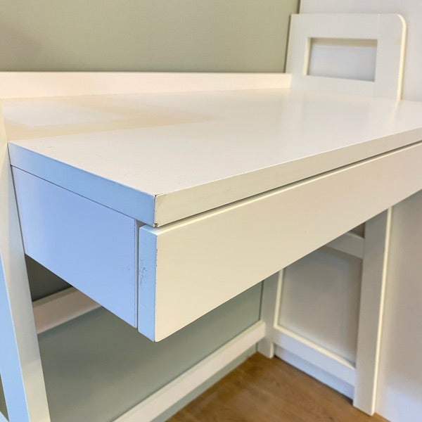 Uma secretária moderna e elegante, perfeita para espaços pequenos. Possui bordas elevadas para manter os objetos no lugar e uma gaveta com deslizamento suave para canetas, cabos e artigos essenciais.
