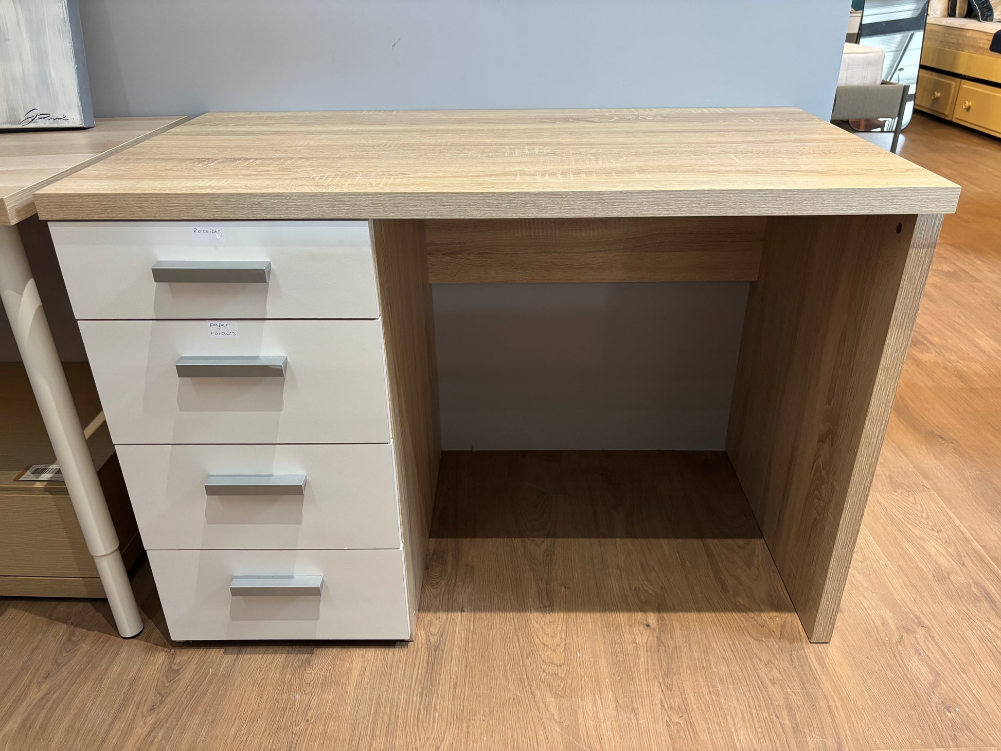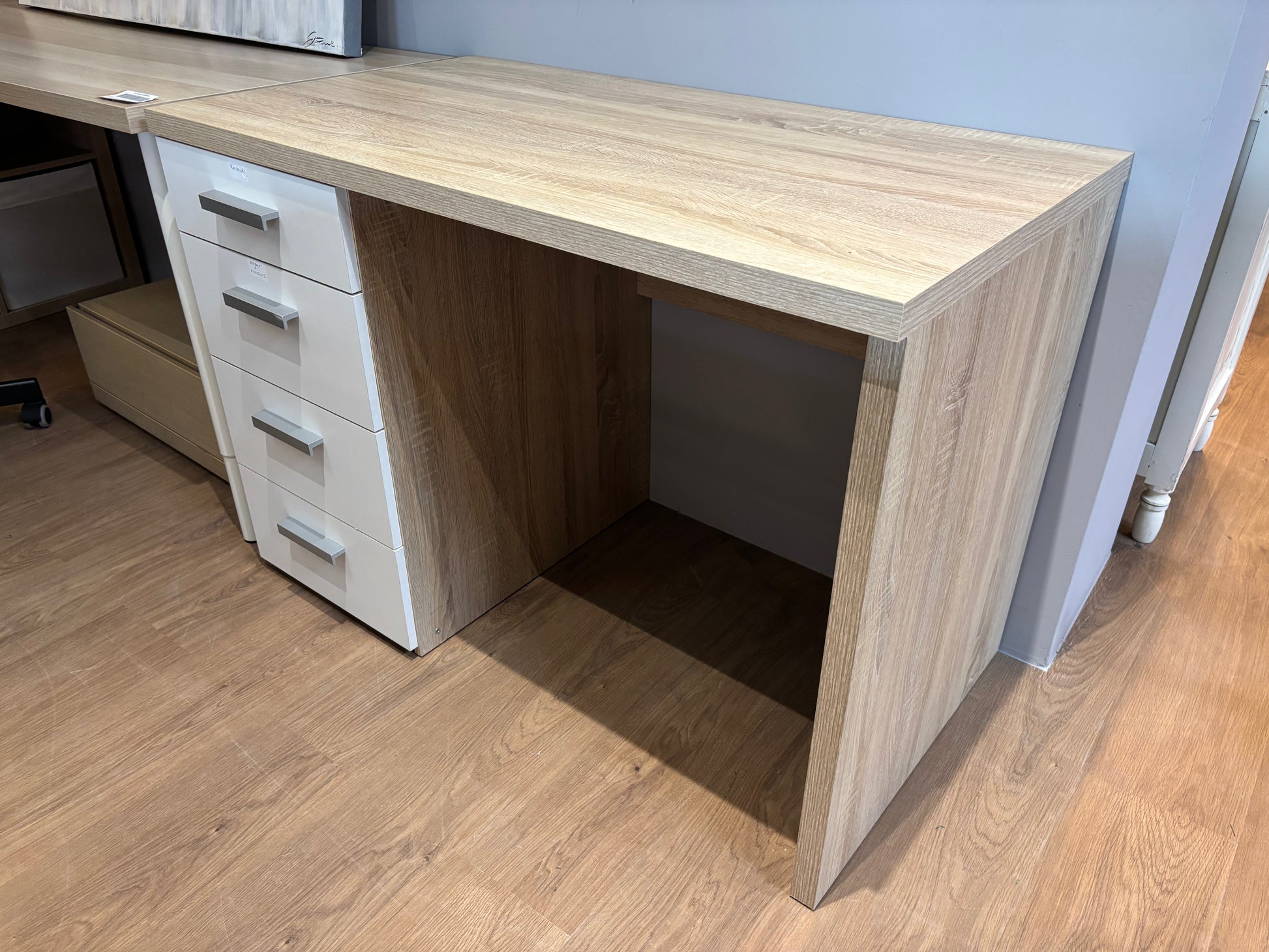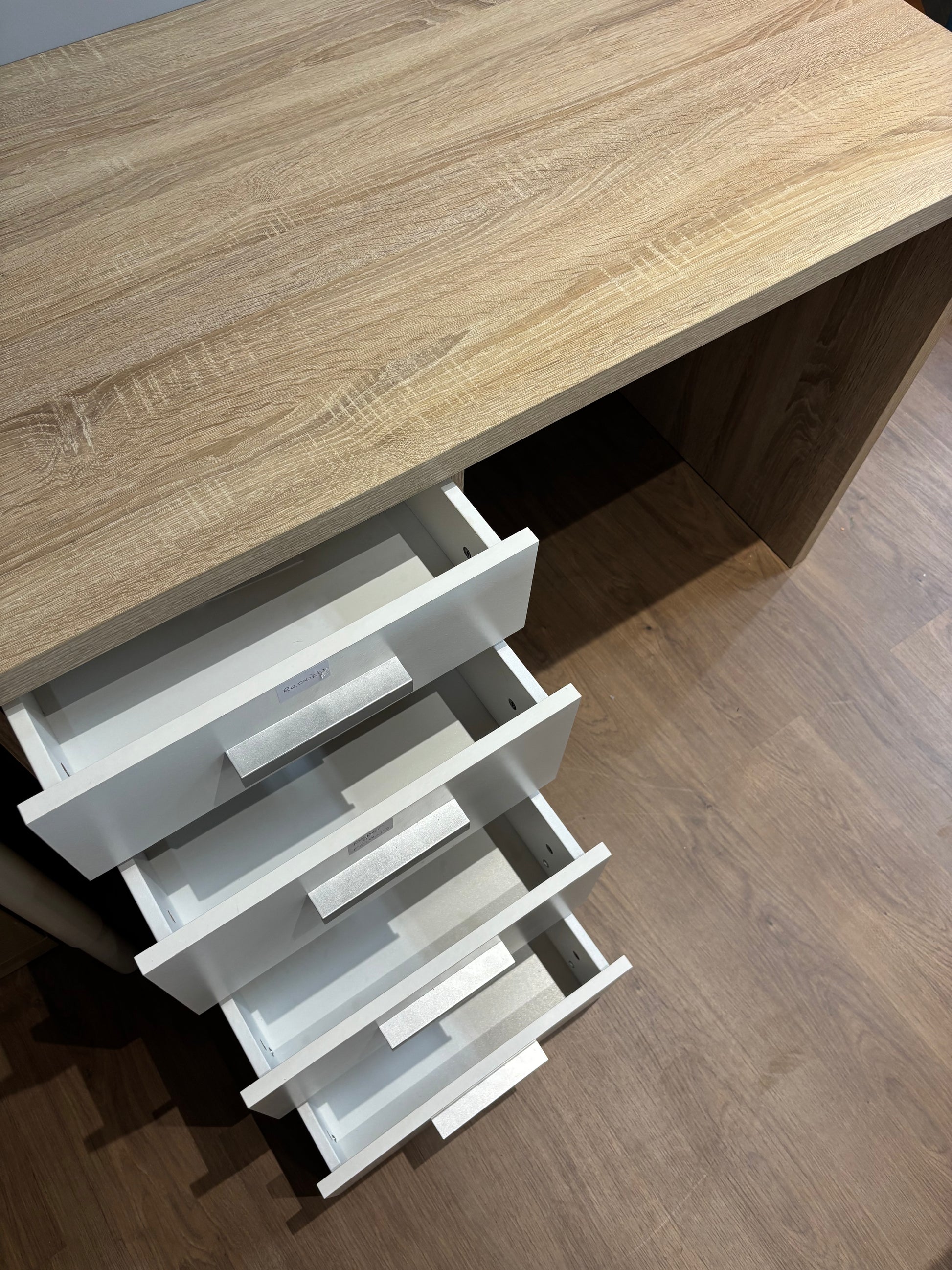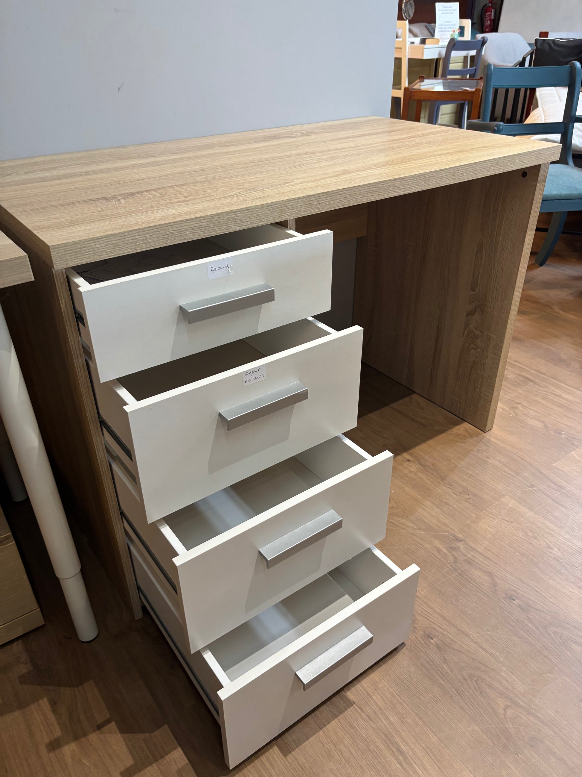 Prática secretária com acabamento em madeira folheada e quatro gavetas embutidas brancas, ideal para escritório em casa ou para estudo. Temos várias unidades disponíveis.