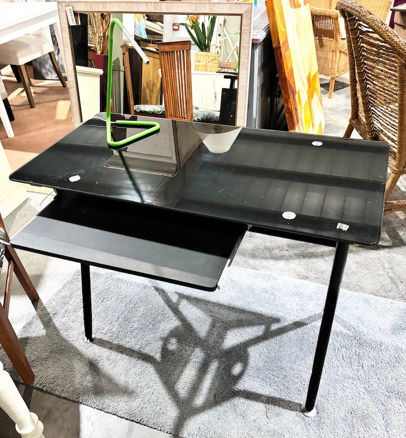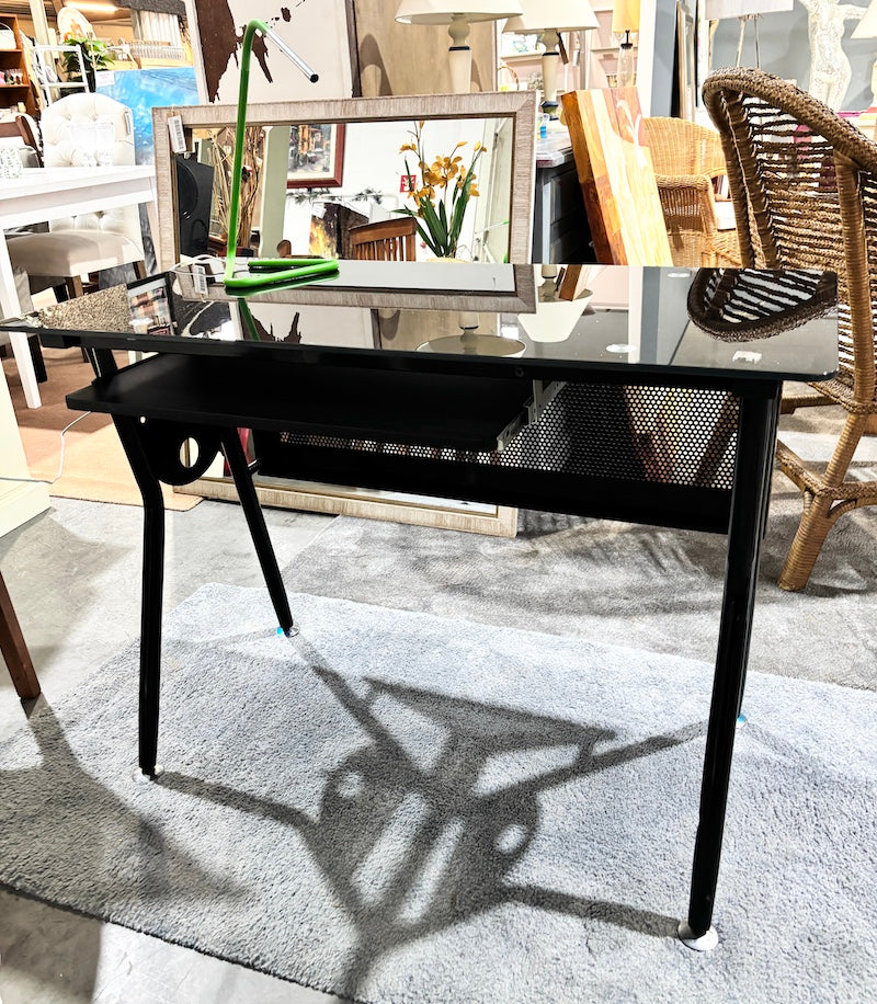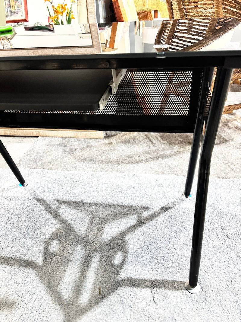 Uma secretária com estrutura em metal preto, tampo em vidro preto e uma prateleira deslizante para teclado.