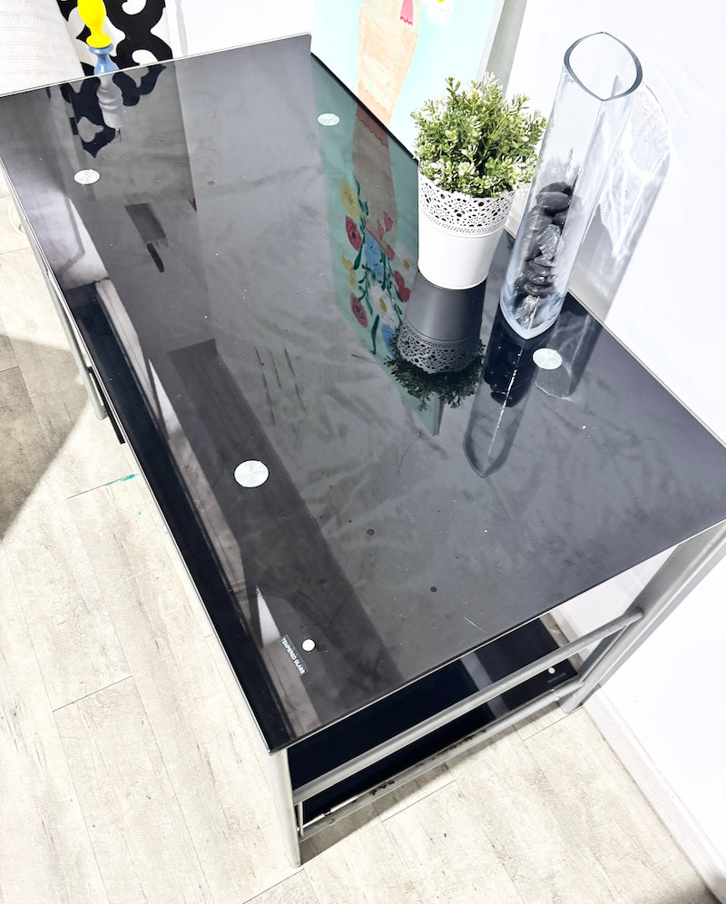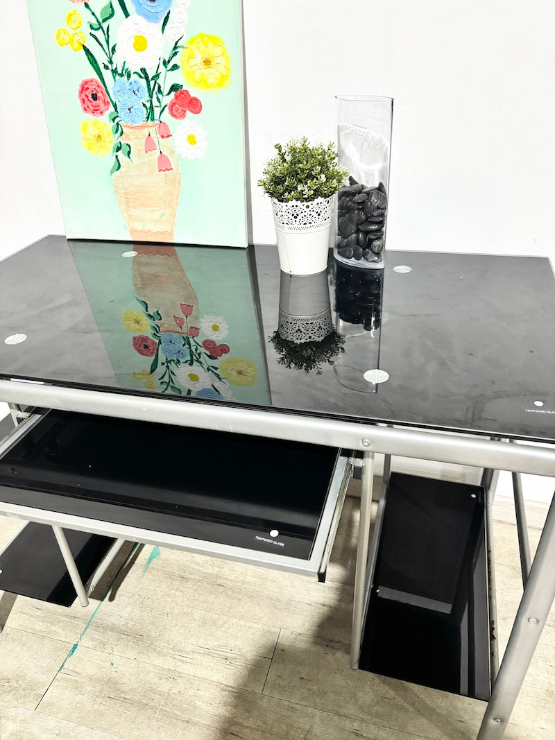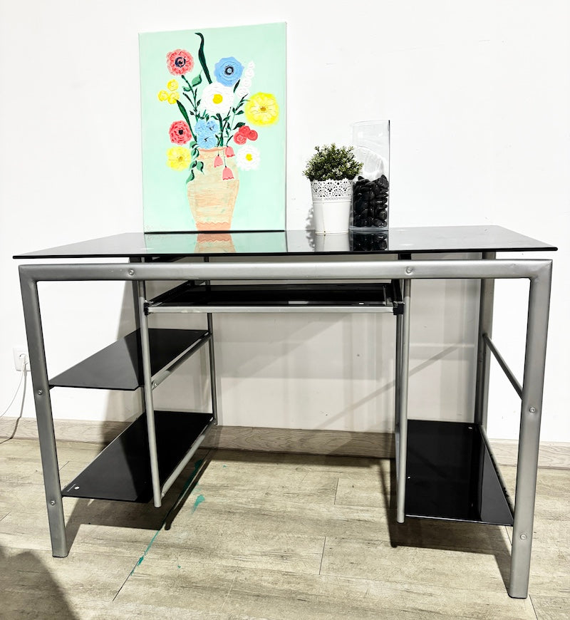 Este elegante móvel de escritório possui uma estrutura robusta em metal com tampo em vidro temperado preto. Três prateleiras espaçosas mantêm os seus artigos essenciais ao alcance das mãos, enquanto uma gaveta oculta para teclado desliza para fora sempre que precisar.