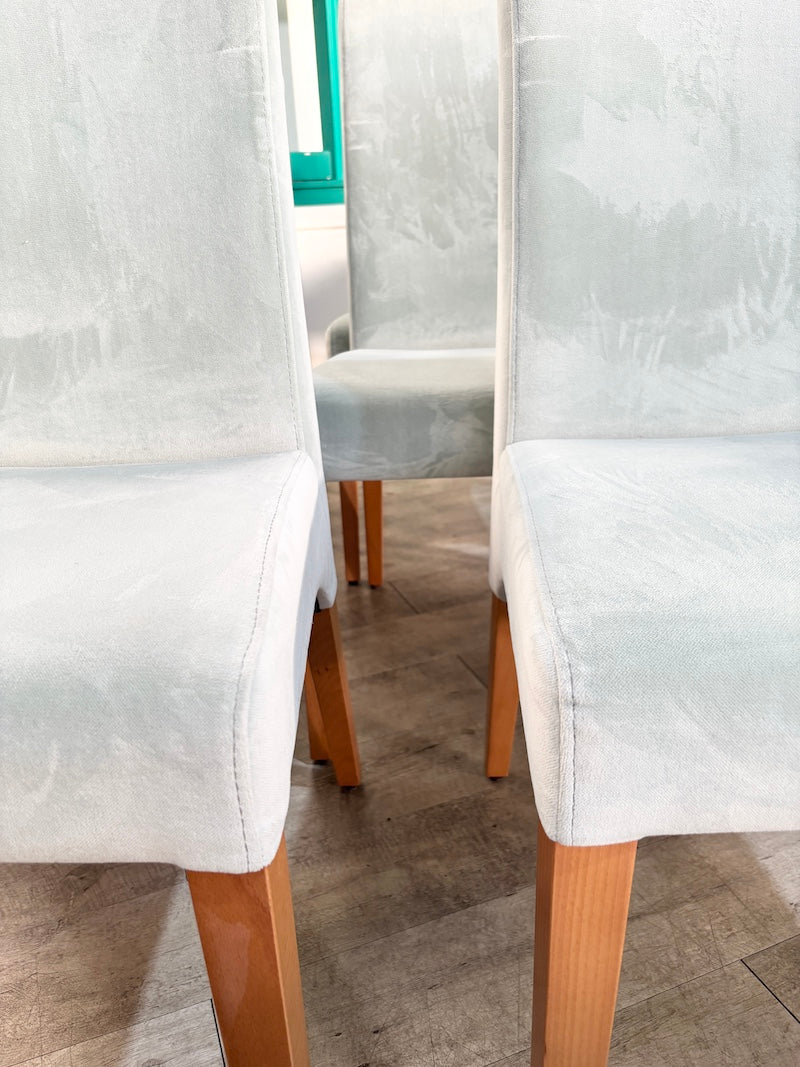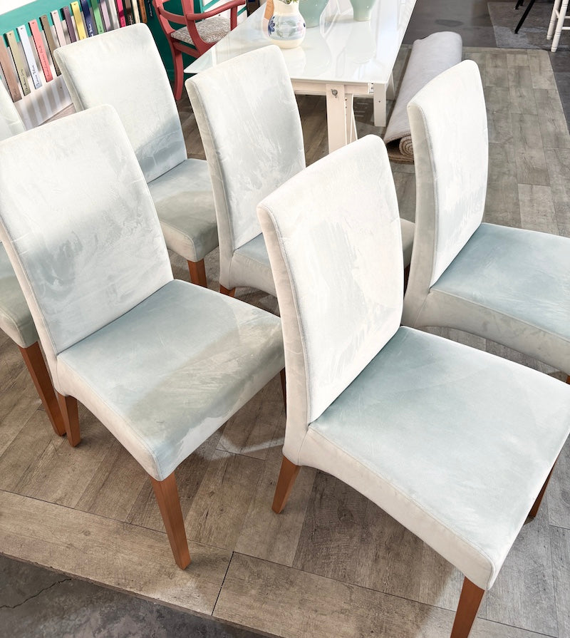 Este conjunto de seis cadeiras de jantar é estofado num luxuoso tecido aveludado azul-ovo-de-pato, tornando-as elegantes e confortáveis, além de combinarem na perfeição com a sua mesa de jantar.