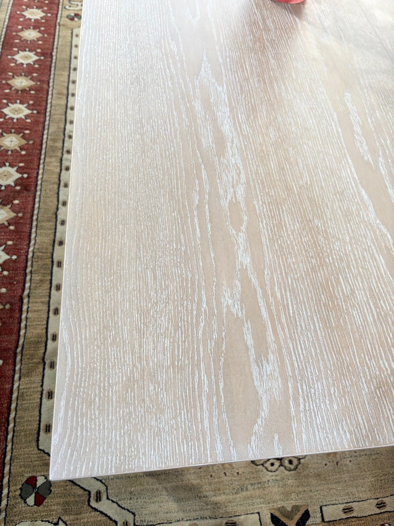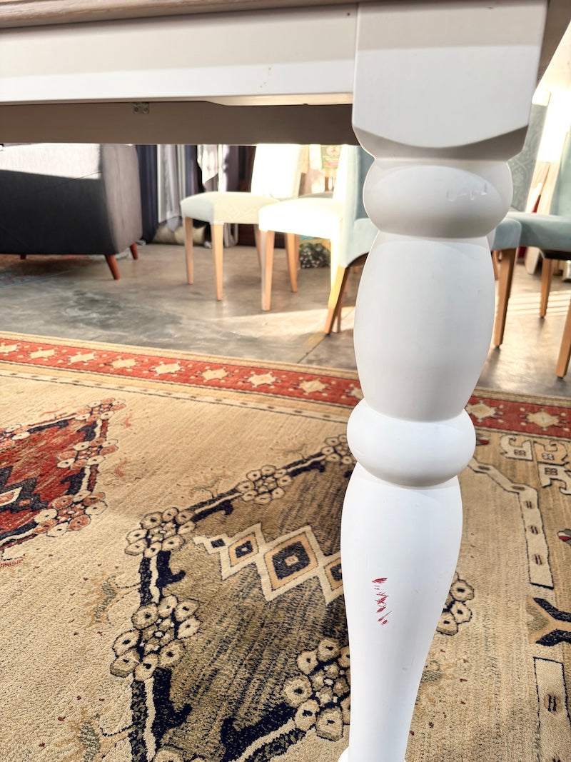 Uma mesa de jantar contemporânea, simples e elegante, de estilo campestre, feita em madeira maciça pintada de branco, com tampo em madeira natural encerada a cal.