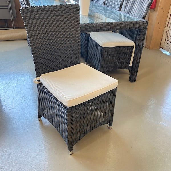 Concebido para maior durabilidade e estilo, este conjunto de jantar para exterior de 8 lugares da STATVS® apresenta um robusto entrançado de vime sintético e um tampo de vidro temperado. O design de linhas simples adapta-se a espaços exteriores modernos, enquanto os pés das cadeiras com ponteiras de alumínio conferem estabilidade e longevidade. Inclui 8 cadeiras com capas de almofada laváveis. Adequado para utilização no exterior durante todo o ano.