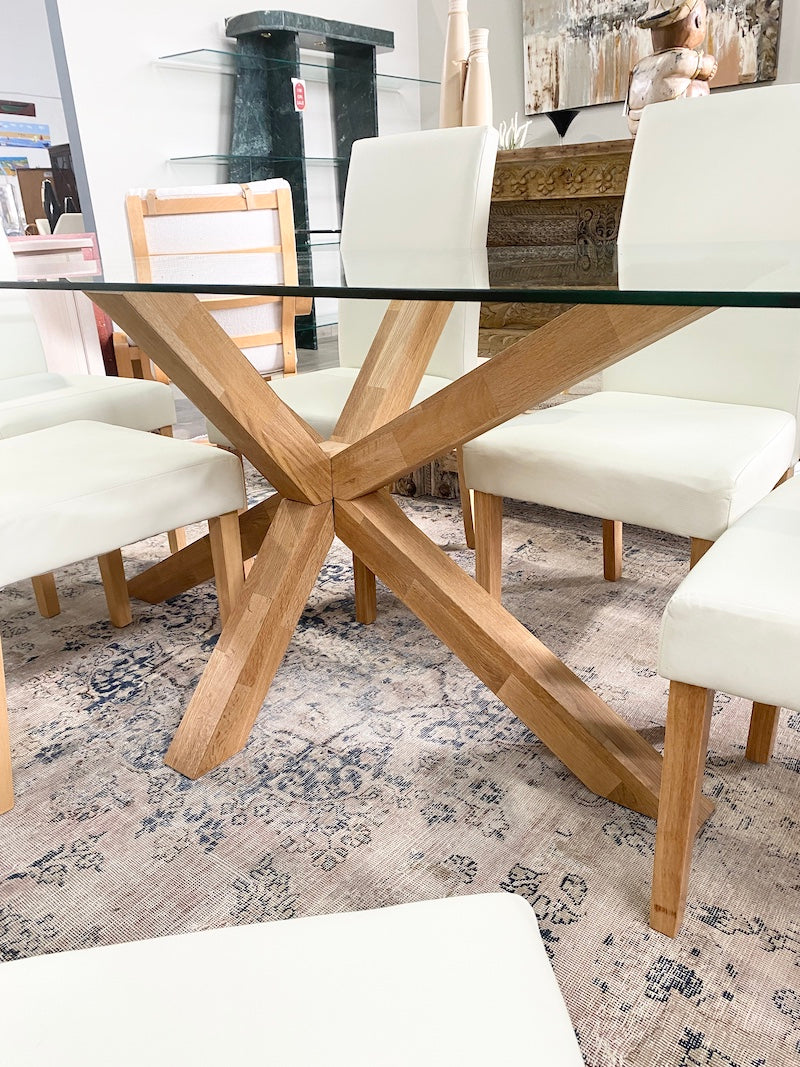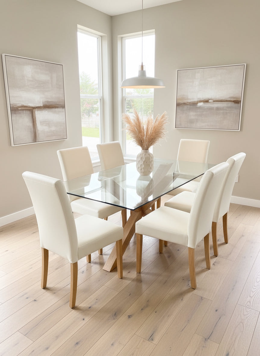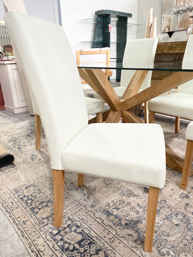 Reúna-se em torno desta peça deslumbrante! Um elegante tampo de vidro flutua sobre uma engenhosa estrutura de madeira de pinho, criando um centro de mesa perfeito para a sala de jantar. Sente-se numa das cadeiras a condizer — revestidas em pele branca com pés robustos de pinho — e prepare-se para refeições que se tornam um pouco mais especiais. Perfeito para transformar os jantares do dia a dia em ocasiões especiais. Uma das cadeiras apresenta algumas pequenas manchas; veja todas as fotos.