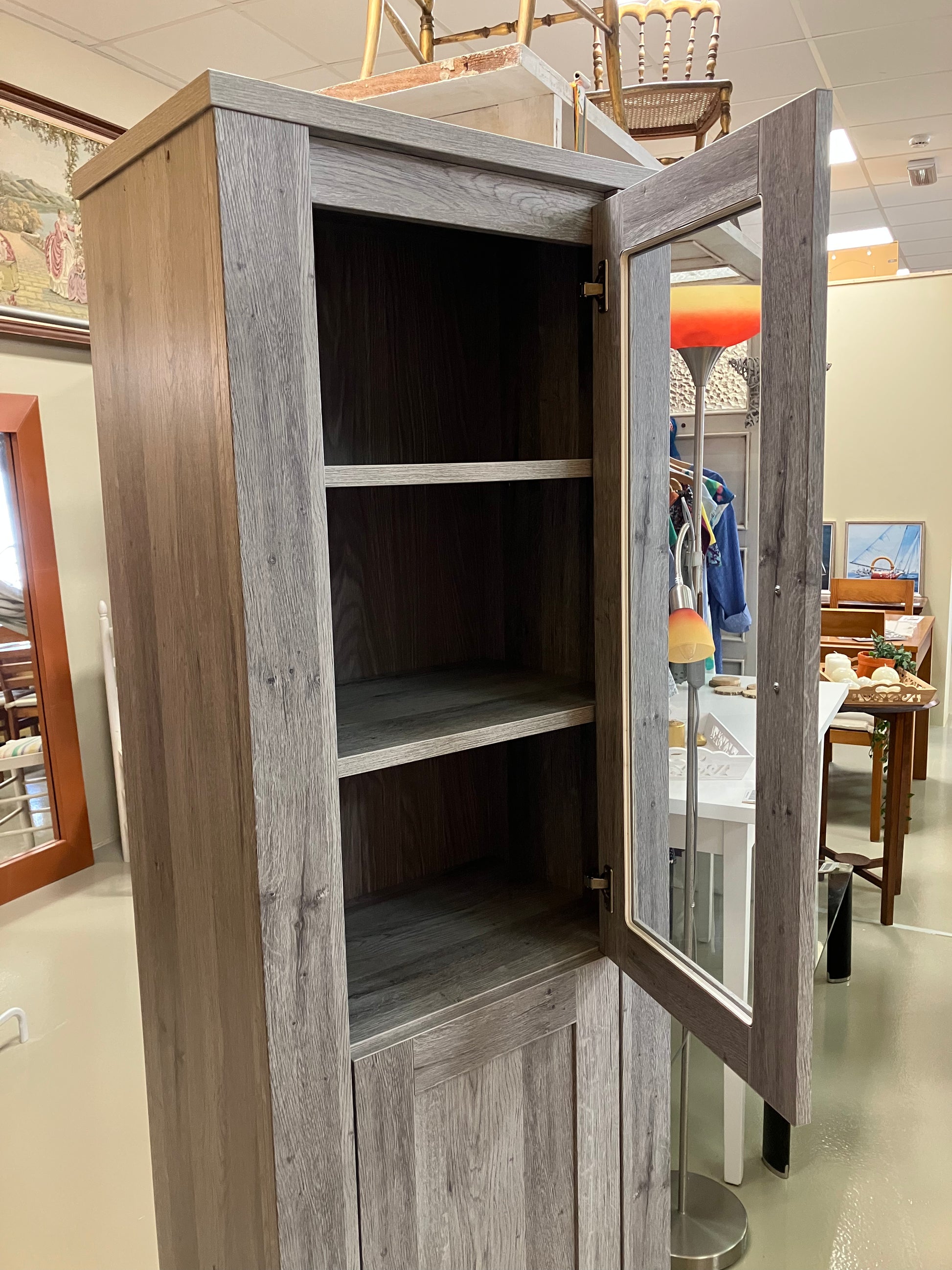 Armário expositor alto com acabamento moderno em madeira cinza, com duas portas, sendo a superior com painel em vidro. Possui prateleiras internas para arrumação e exposição elegantes — perfeitas para salas de jantar ou de estar.
