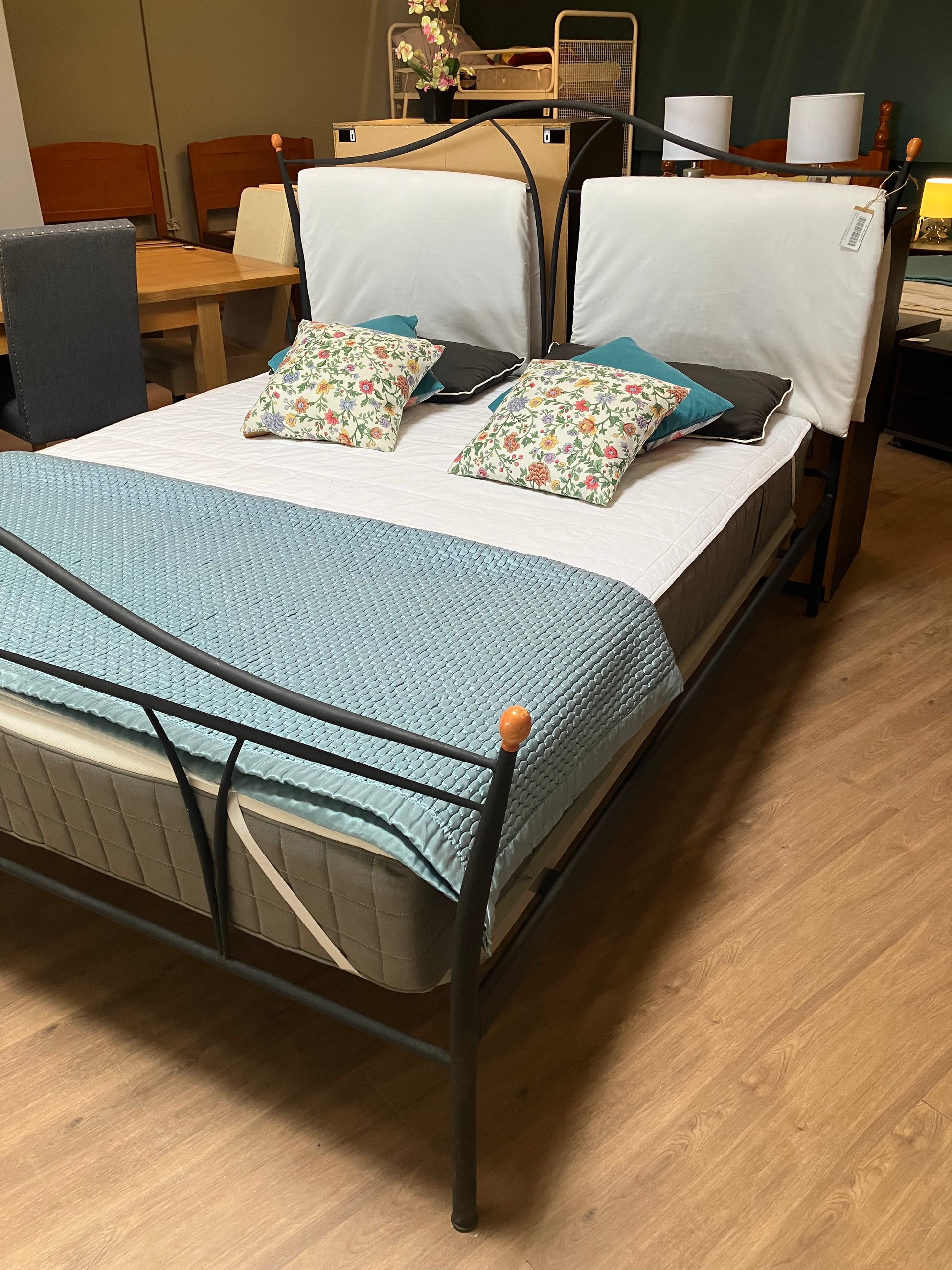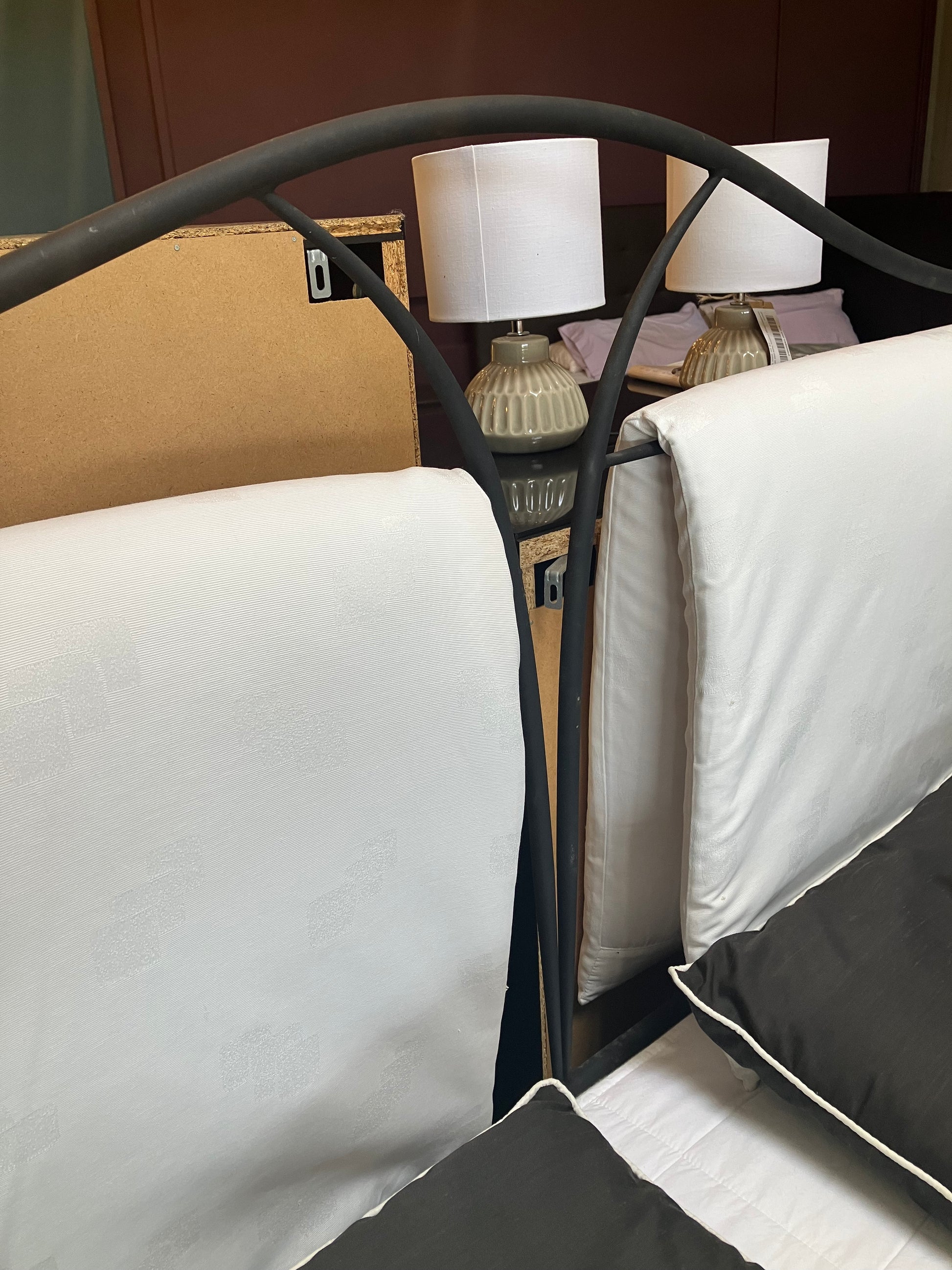 Esta elegante estrutura de cama em metal apresenta uma cabeceira com subtis detalhes em madeira e metal curvo. As secções acolchoadas da cabeceira podem ser removidas. Uma mistura encantadora de estilo moderno e clássico, perfeita para criar um quarto fresco e convidativo.