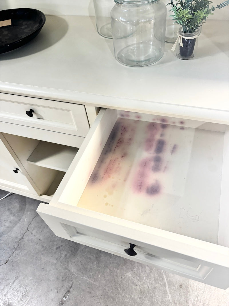 A cor clara desta cómoda significa que não irá sobrecarregar o ambiente, mesmo sendo muito grande. Numa sala de jantar ou cozinha, irá satisfazer todas as suas necessidades de arrumação, com bastante espaço na superfície, prateleiras e gavetas. A peça é composta por duas partes separadas, facilitando o transporte e a instalação. Note que, apesar do resto da cómoda estar em perfeitas condições, o interior das gavetas apresenta alguns sinais de desgaste.