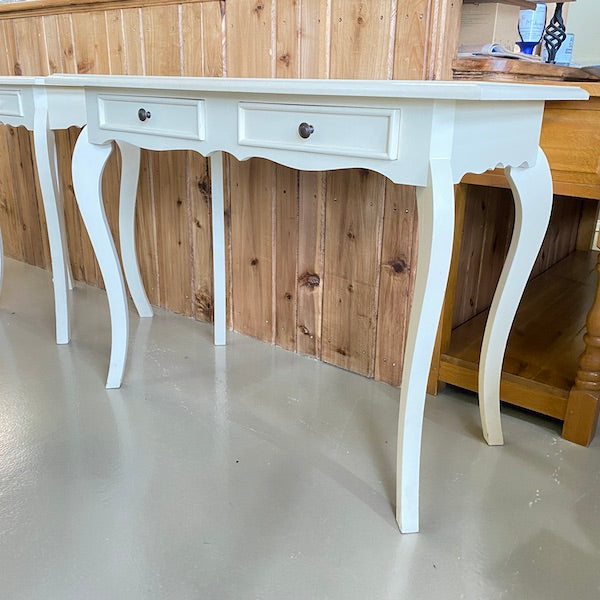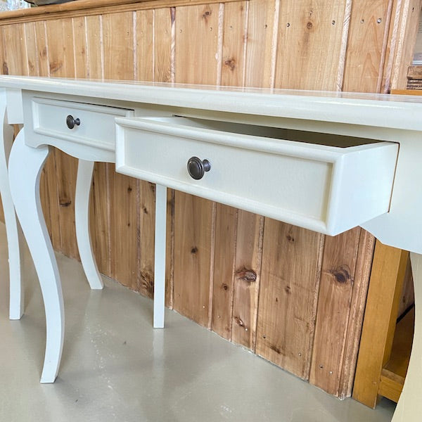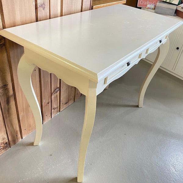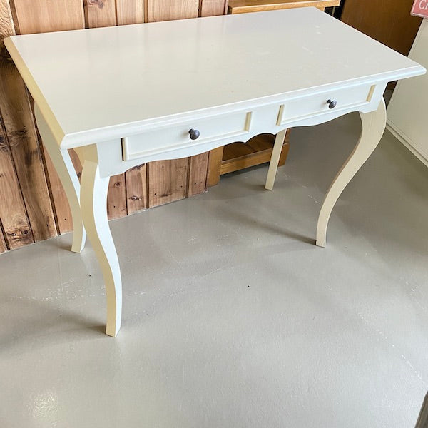 Uma penteadeira clássica, pintada em creme, com pernas elegantes. Possui duas gavetas de bom tamanho para guardar diversos artigos de toucador. É bastante leve, fácil de mover.