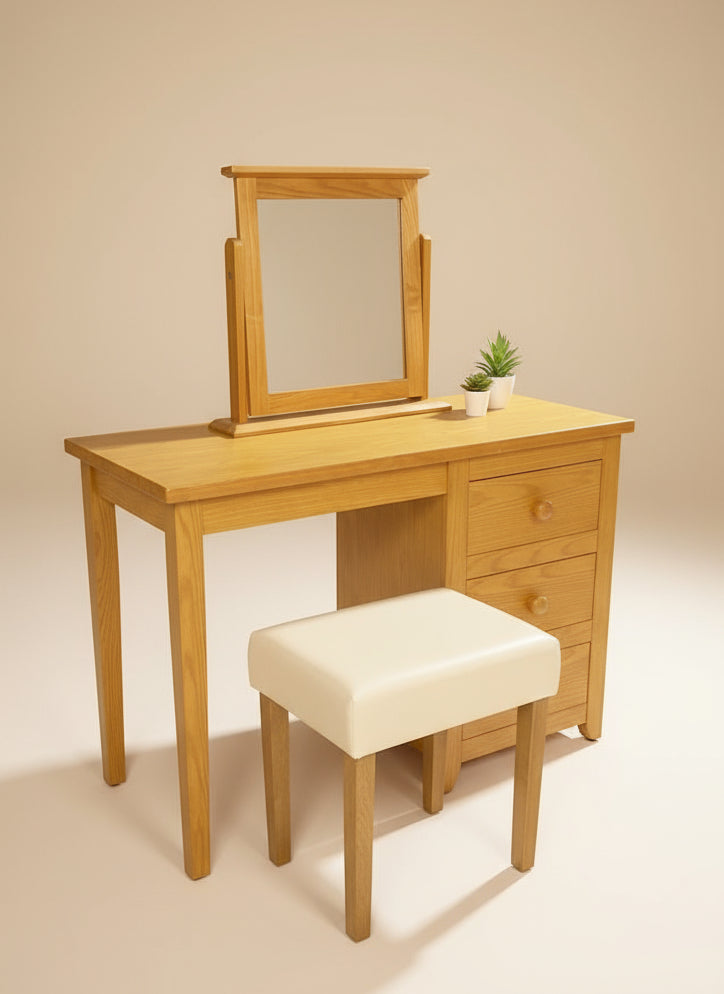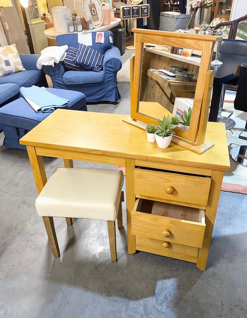 Um toucador simples em madeira de pinho, com um espelho de chão a condizer. Possui três práticas gavetas. Atenção: o banco é vendido em separado.
