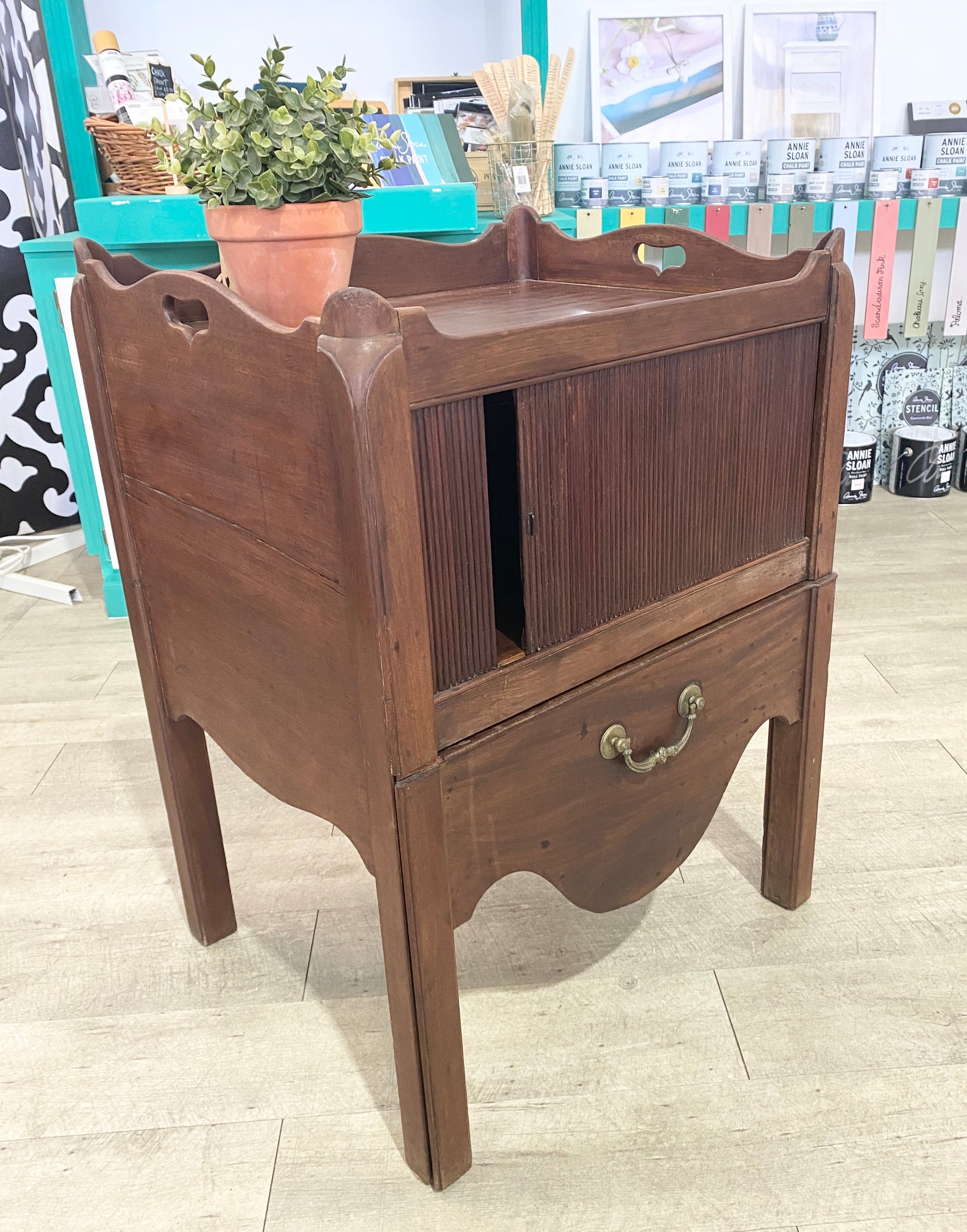 Deceptively compact, this vintage wood cabinet features internal storage that can be slid open and shut, for bottles or glasses, and a hidden pull-out seat underneath. A clever and charming piece, perfect for entertaining in small spaces.
