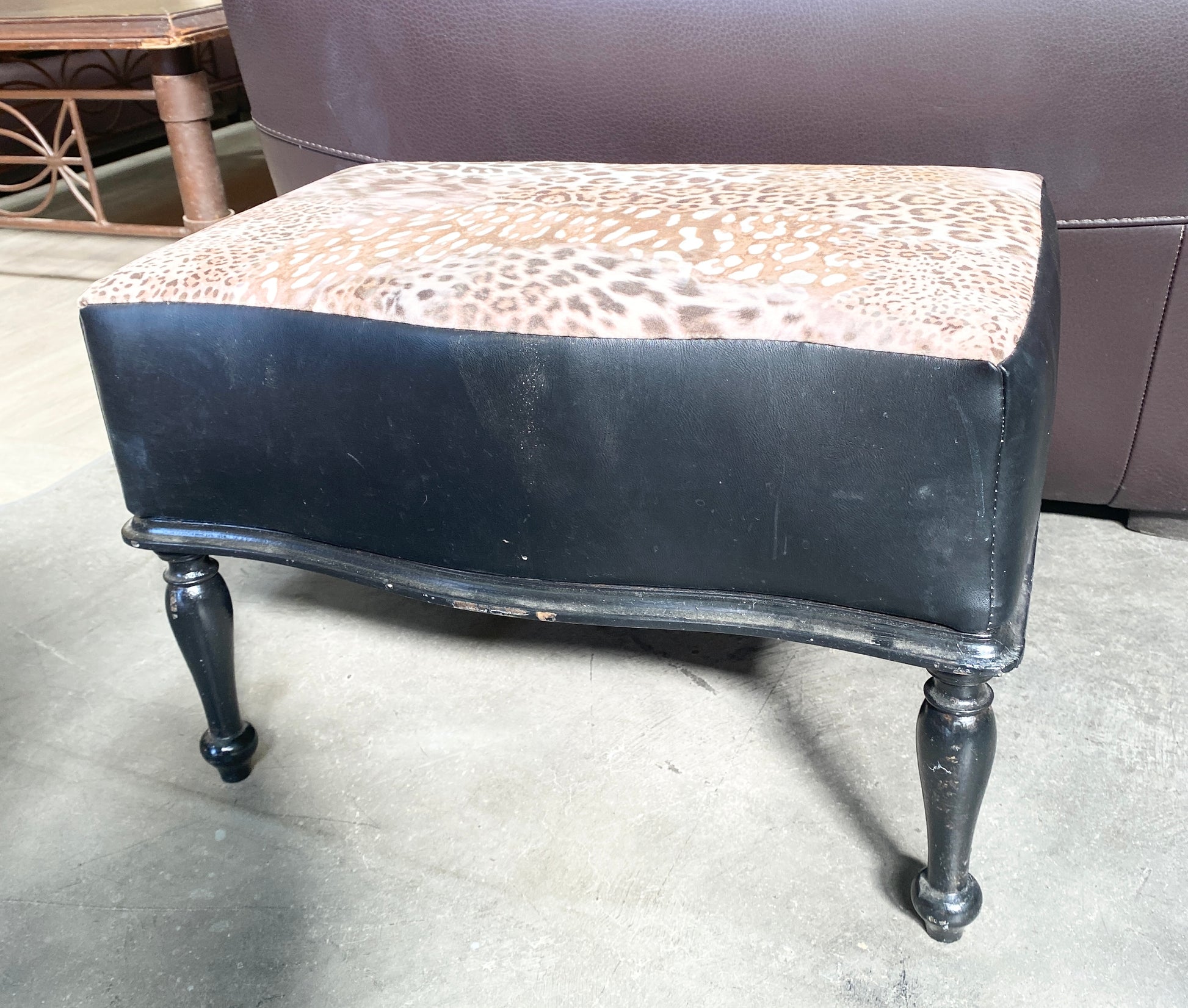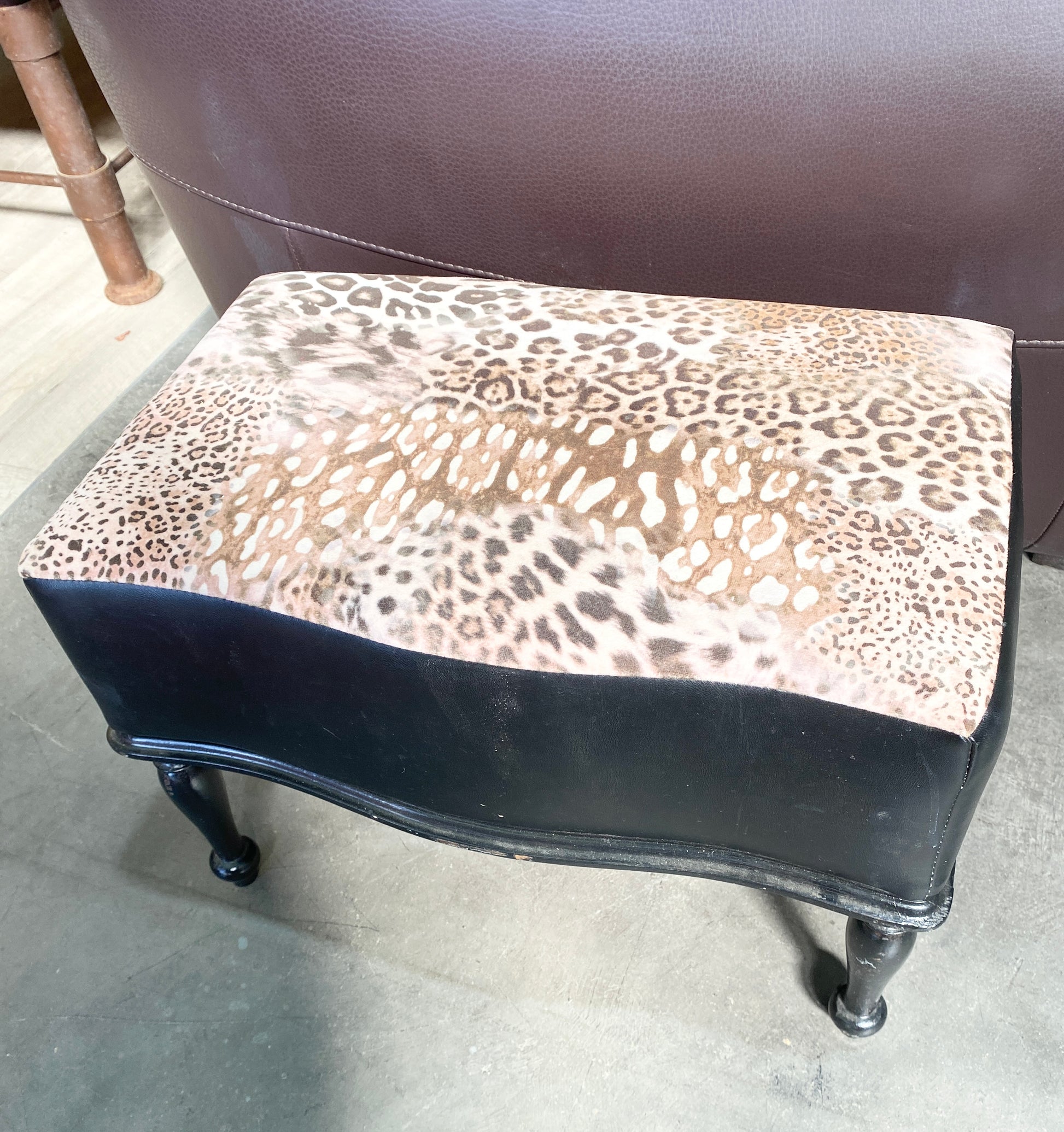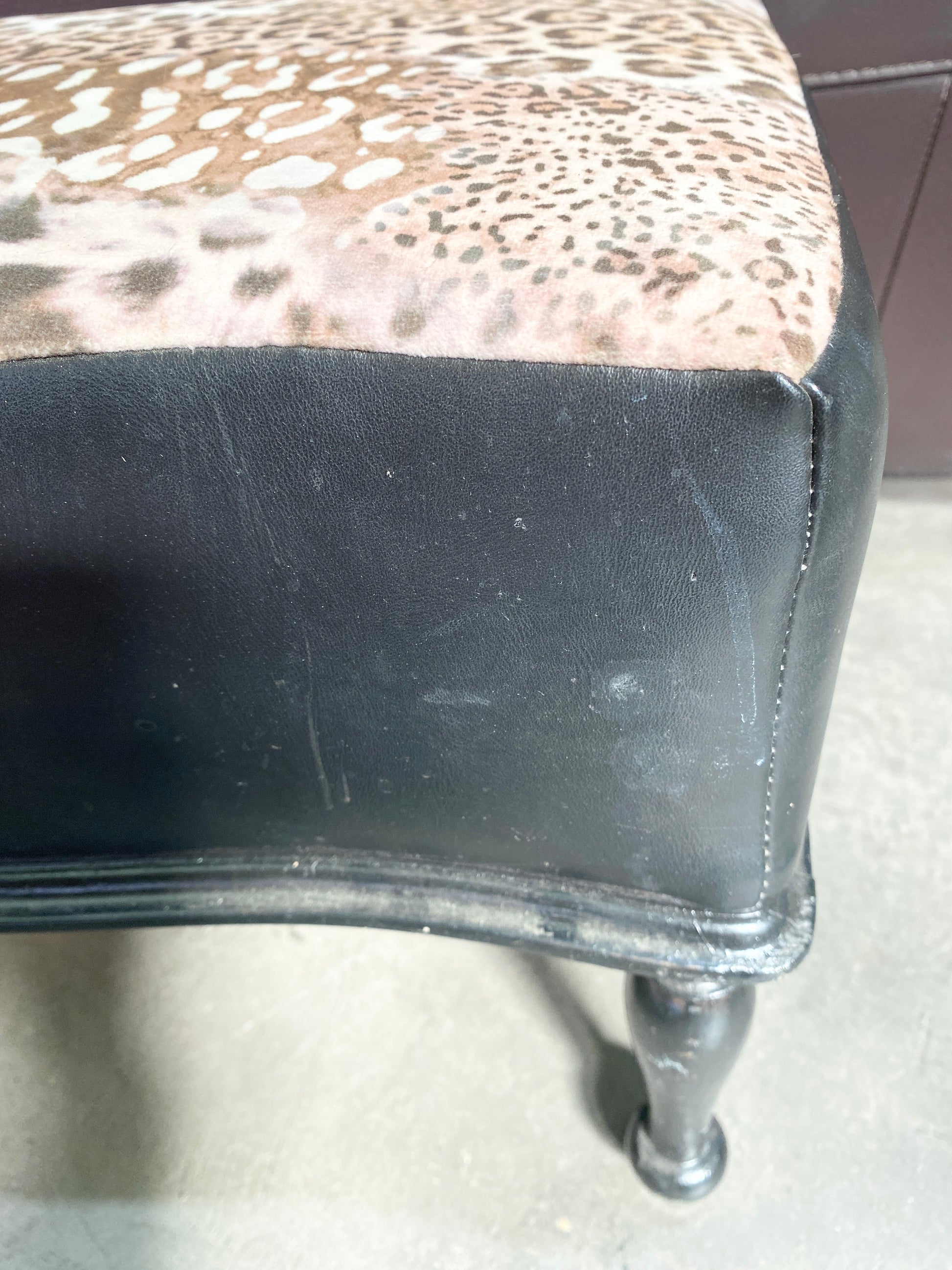 Um pufe cool com padrão animal, laterais em pele sintética preta e pernas pretas esculpidas.
