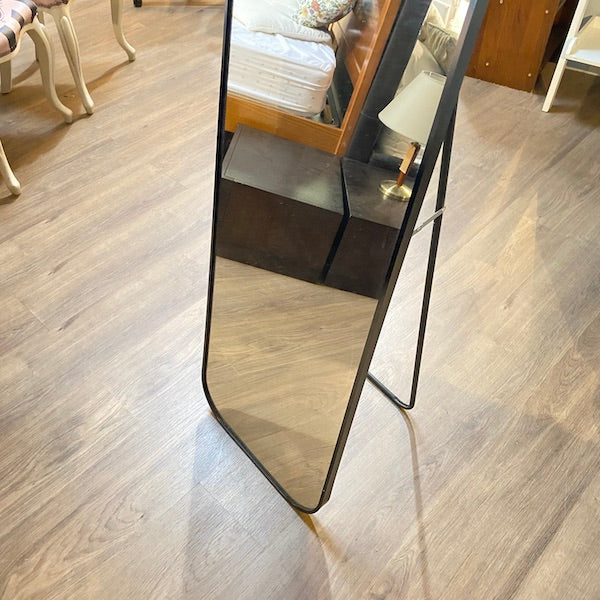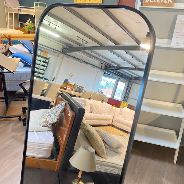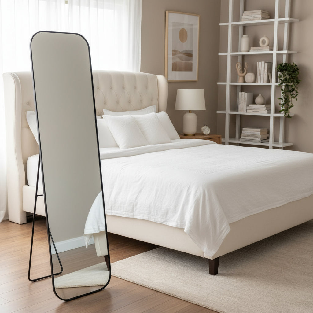 Um espelho de corpo inteiro elegante e moderno, com bordas suavemente arredondadas e uma moldura fina de metal preto.