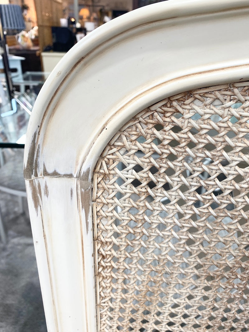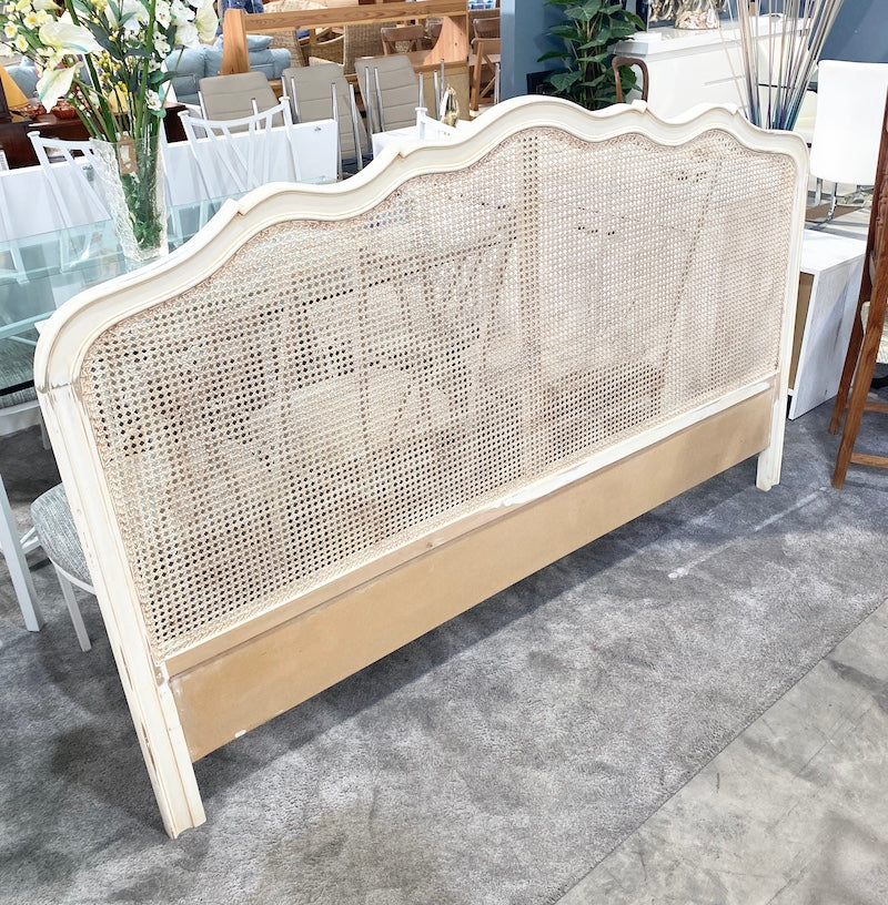 Uma cabeceira de cama em madeira feita à medida, pintada em tons de creme e com centro em trama de junco.