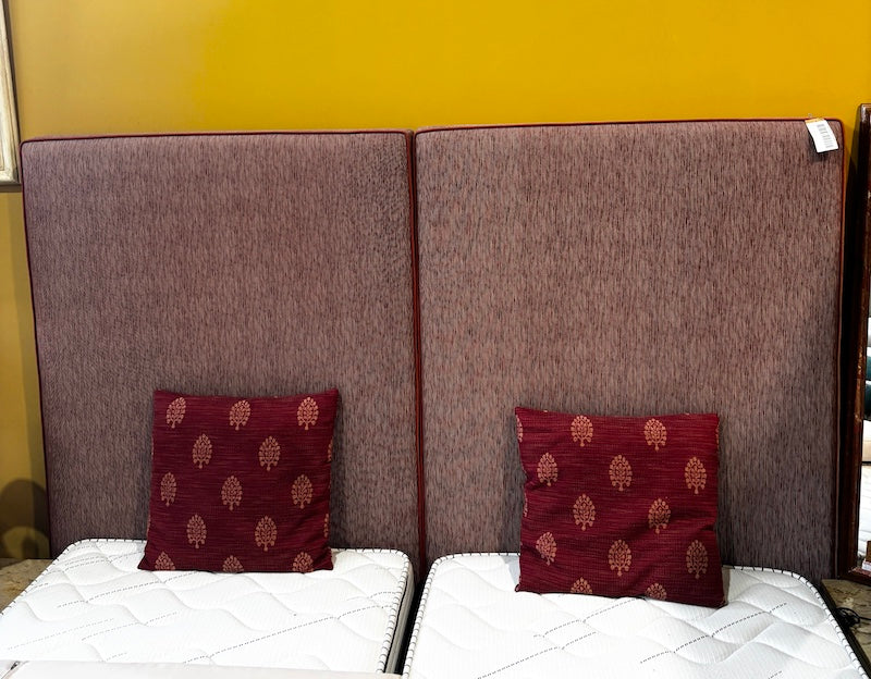 Um par de cabeceiras altas de solteiro, estofadas em tecido listrado vermelho escuro, com detalhes em debrum vermelho.