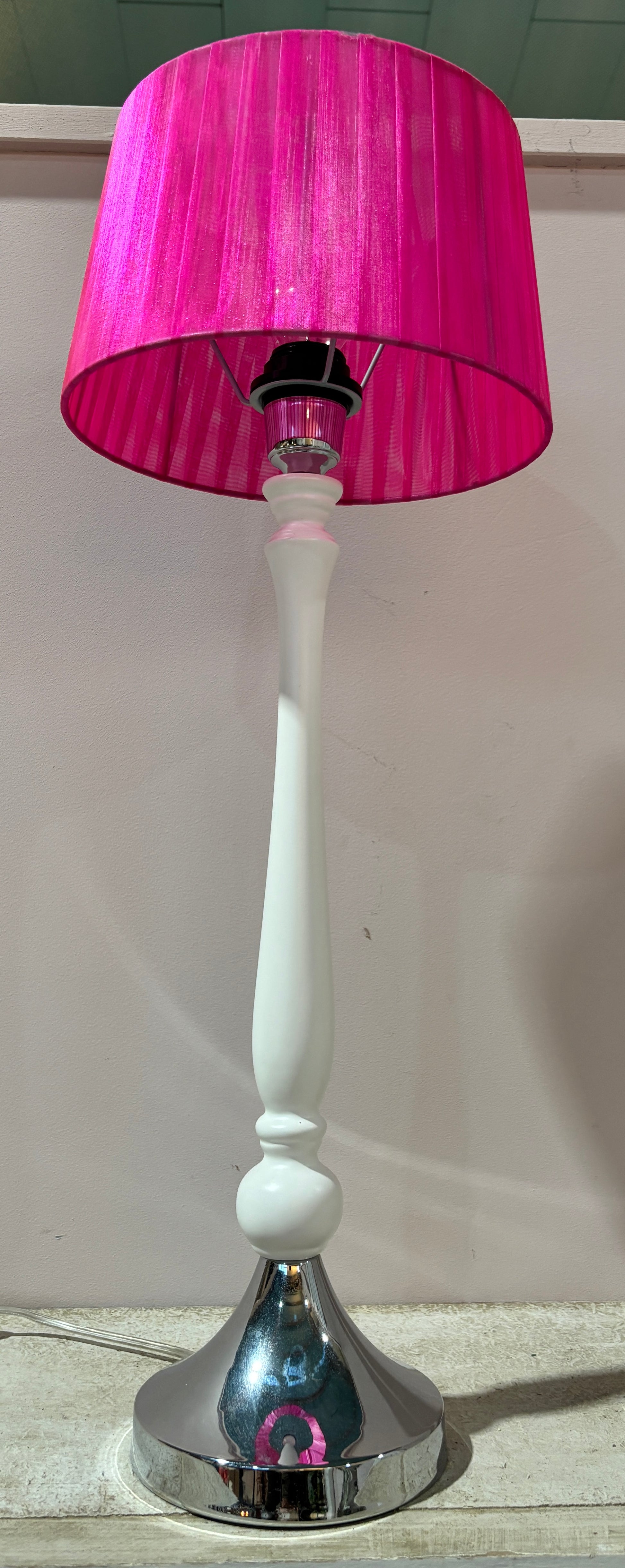 Um candeeiro de mesa moderno com um candeeiro rosa vibrante, perfeito para o quarto de uma menina. A base cromada brilhante e a haste de madeira branca criam uma combinação moderna e clássica.