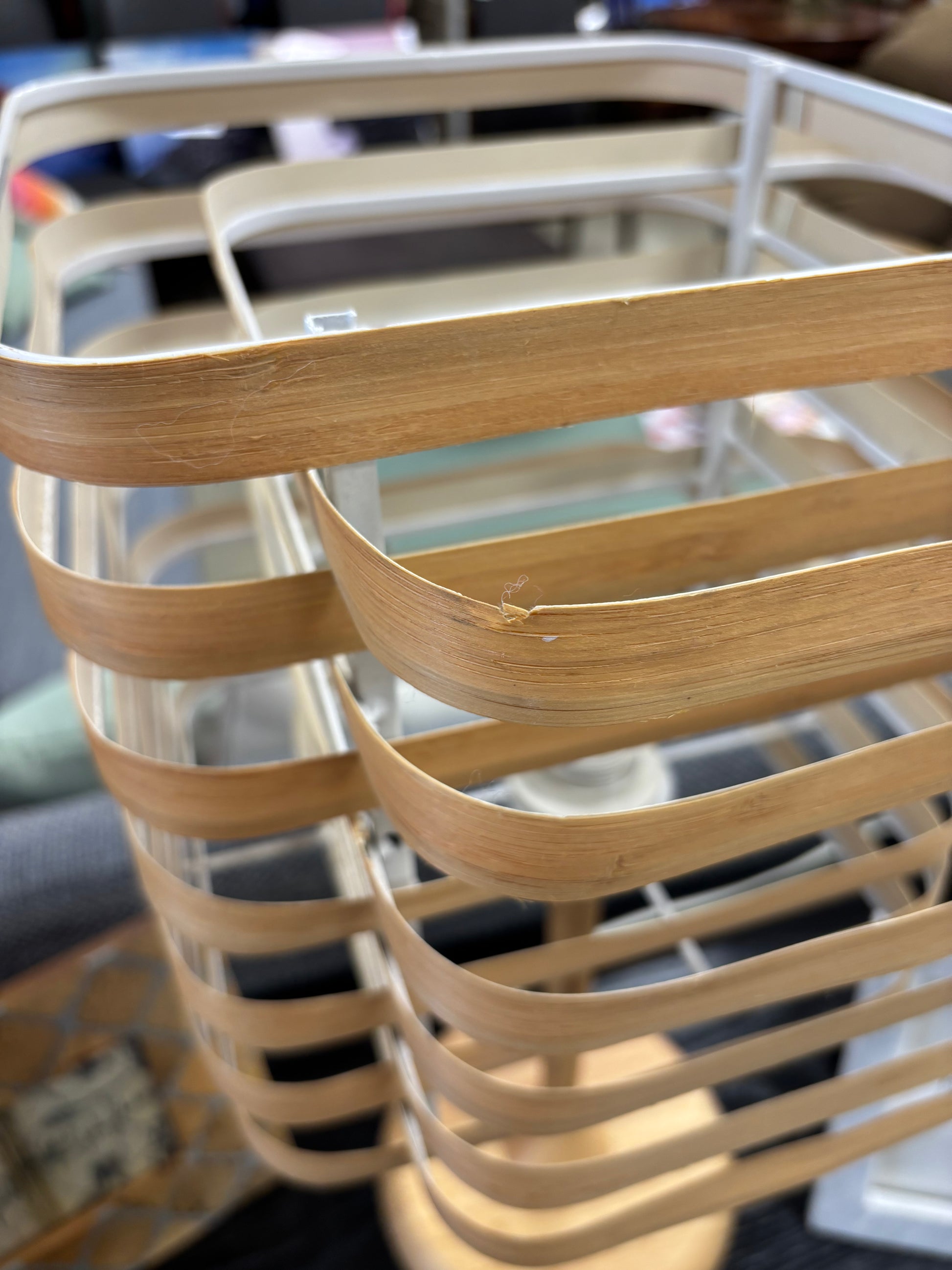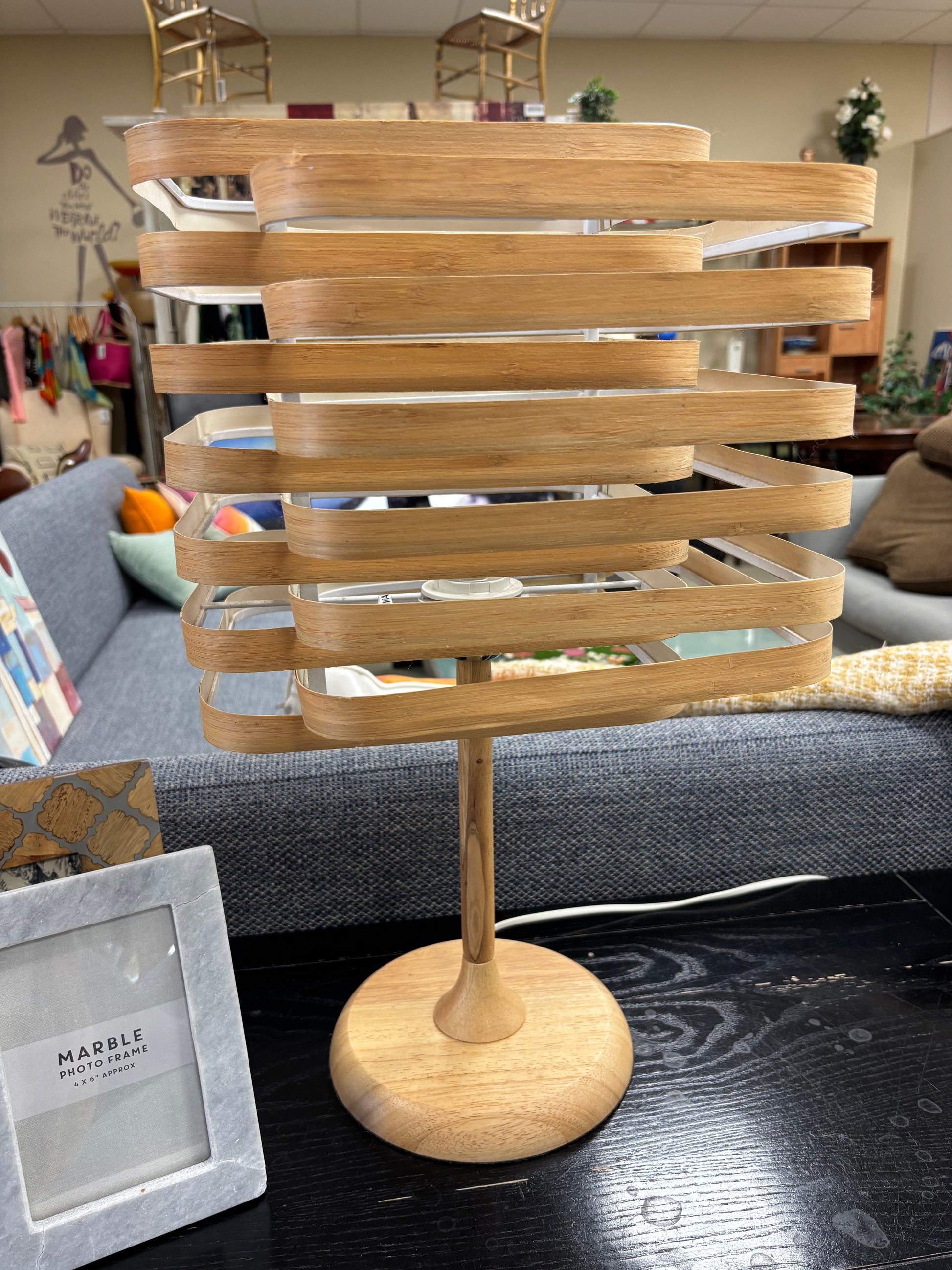 Candeeiro de madeira com um design exclusivo em camadas e um visual atraente. Uma peça marcante que acrescenta aconchego e personalidade a qualquer ambiente. Note que o plugue é padrão do Reino Unido.
