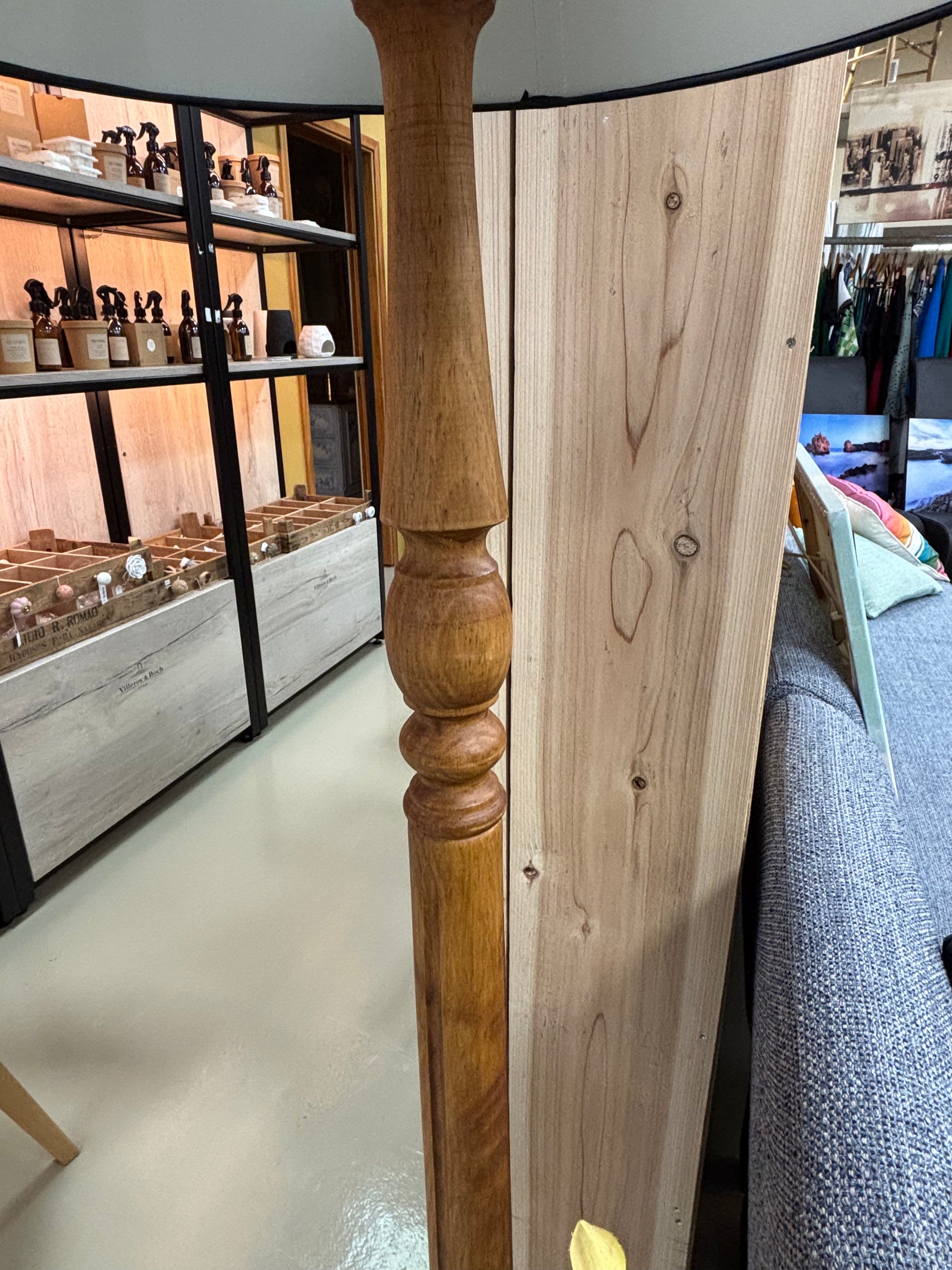 Candeeiro de pé minimalista com elegante cúpula preta e base de madeira em tom quente. Perfeita para interiores modernos ou contemporâneos.