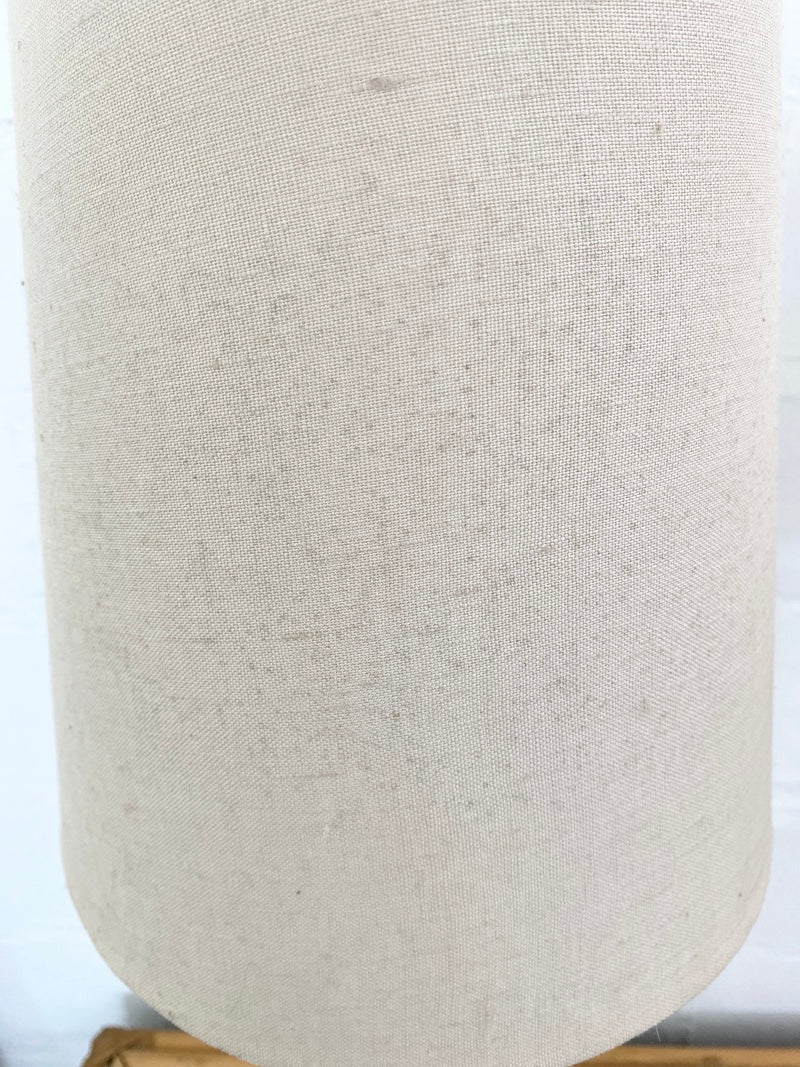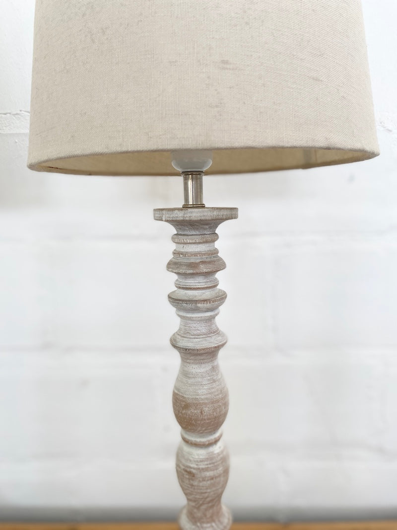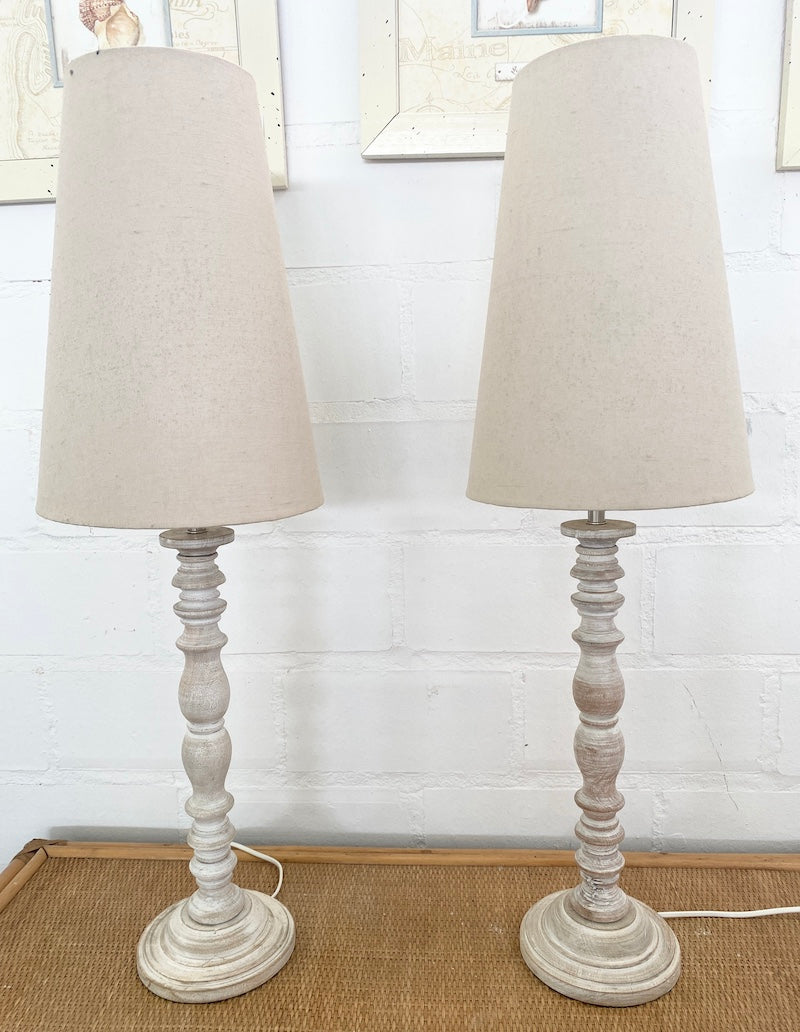 Este par de candeeiros de mesa altos tem suportes de madeira torneados que foram pintados com uma camada de creme e cúpulas altas cónicas de cor creme.