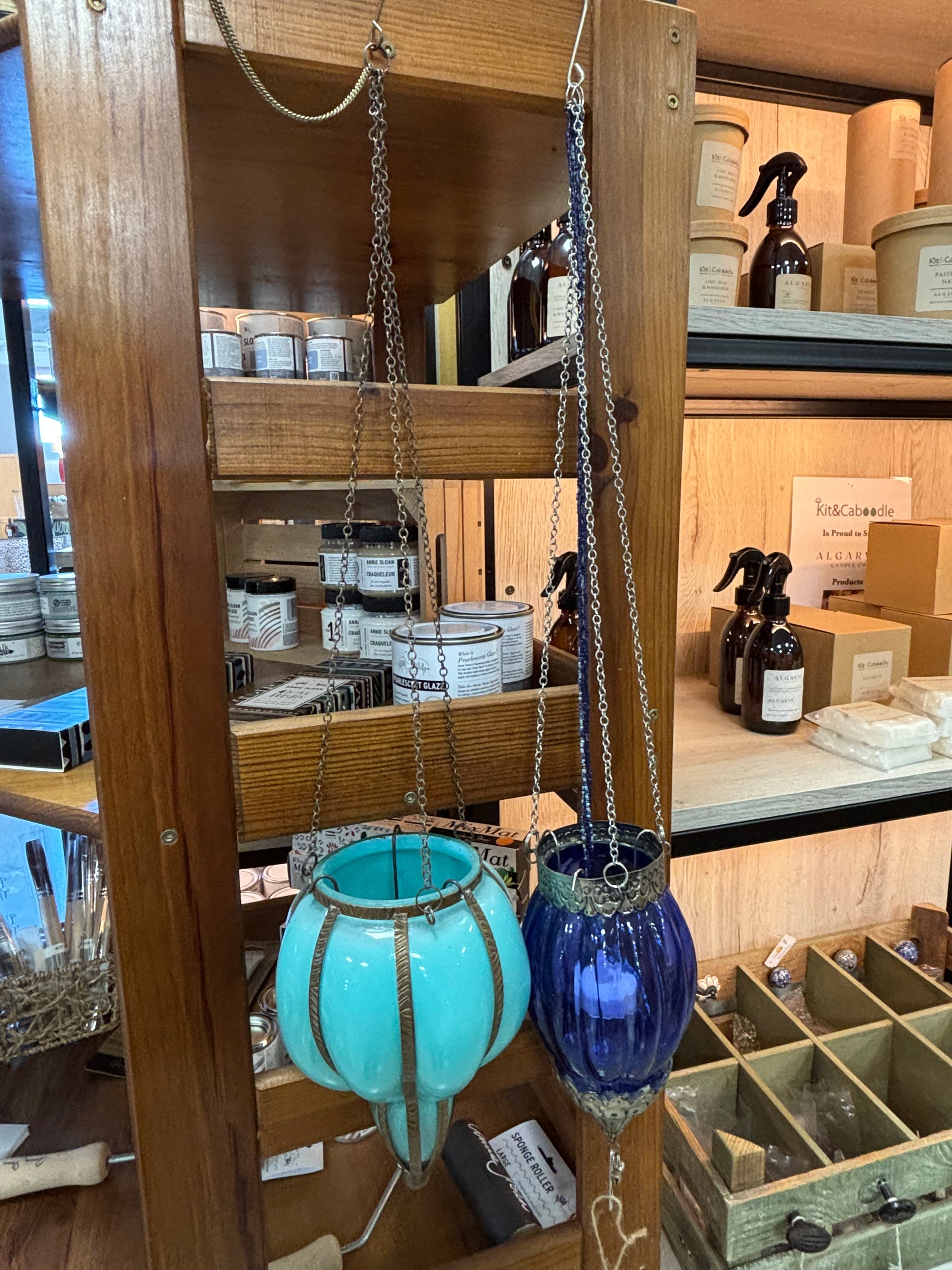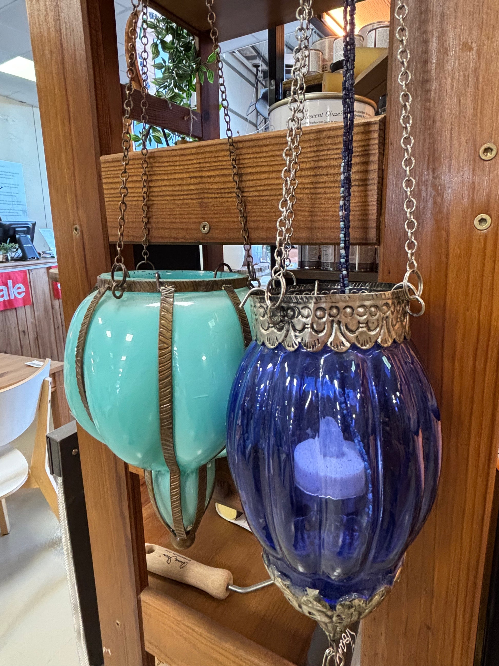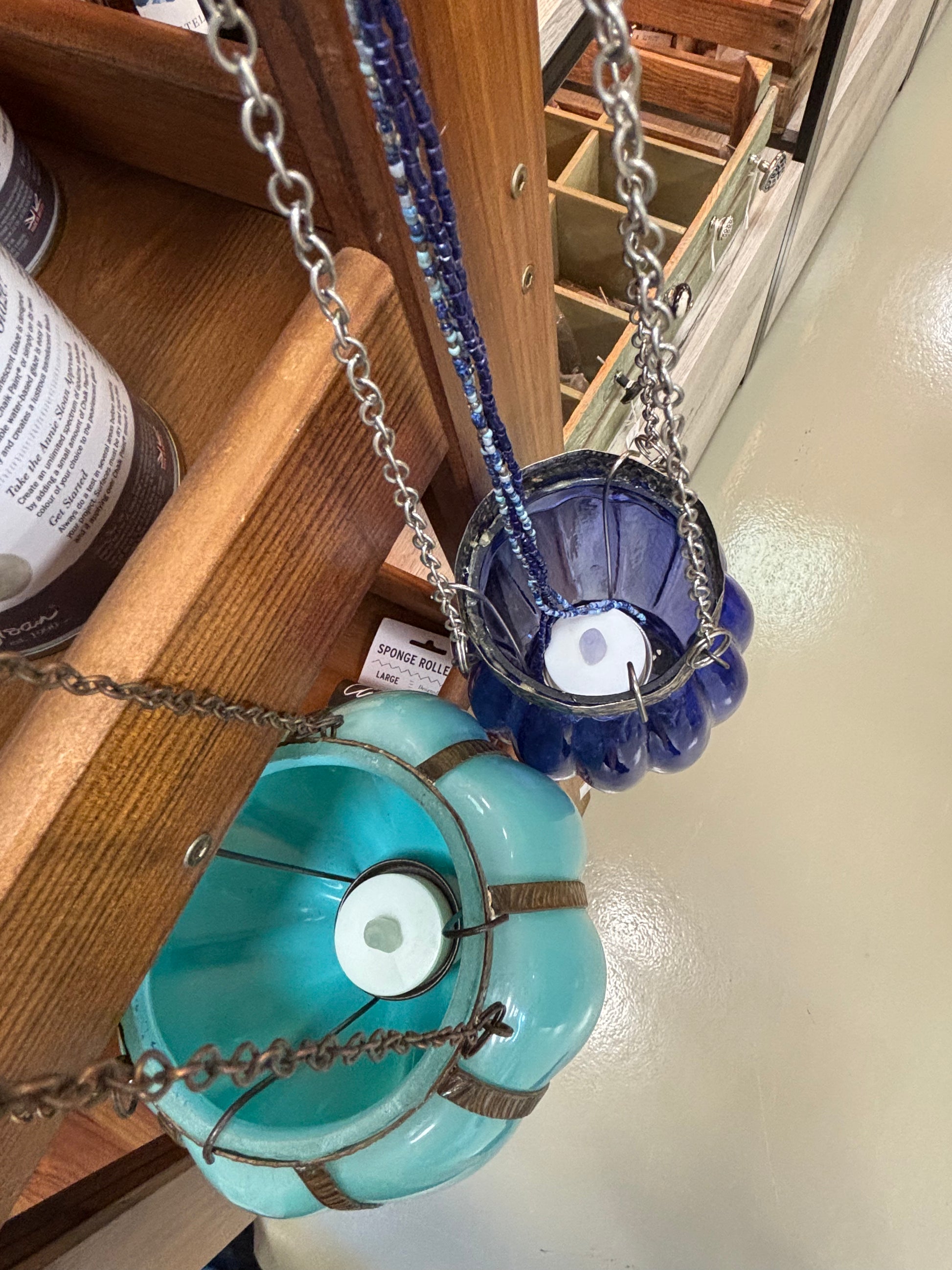 Bonitas lanternas suspensas em vidro azul com correntes em metal. Perfeitas para dar cor e aconchego a ambientes interiores ou varandas cobertas.