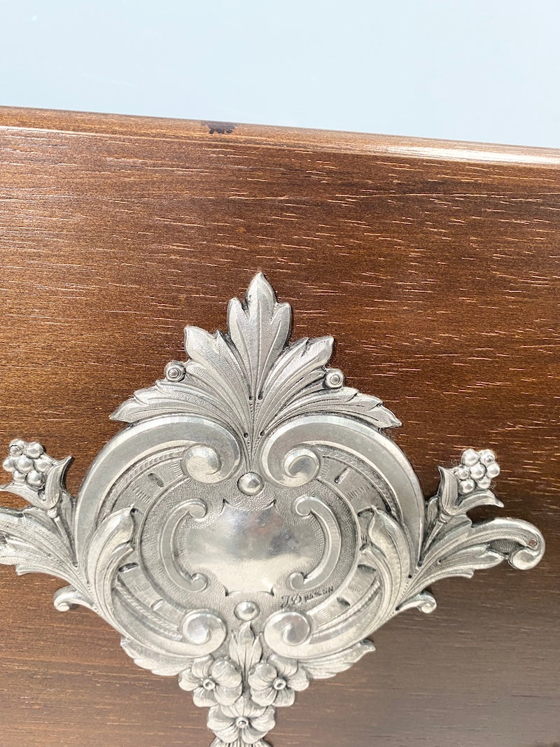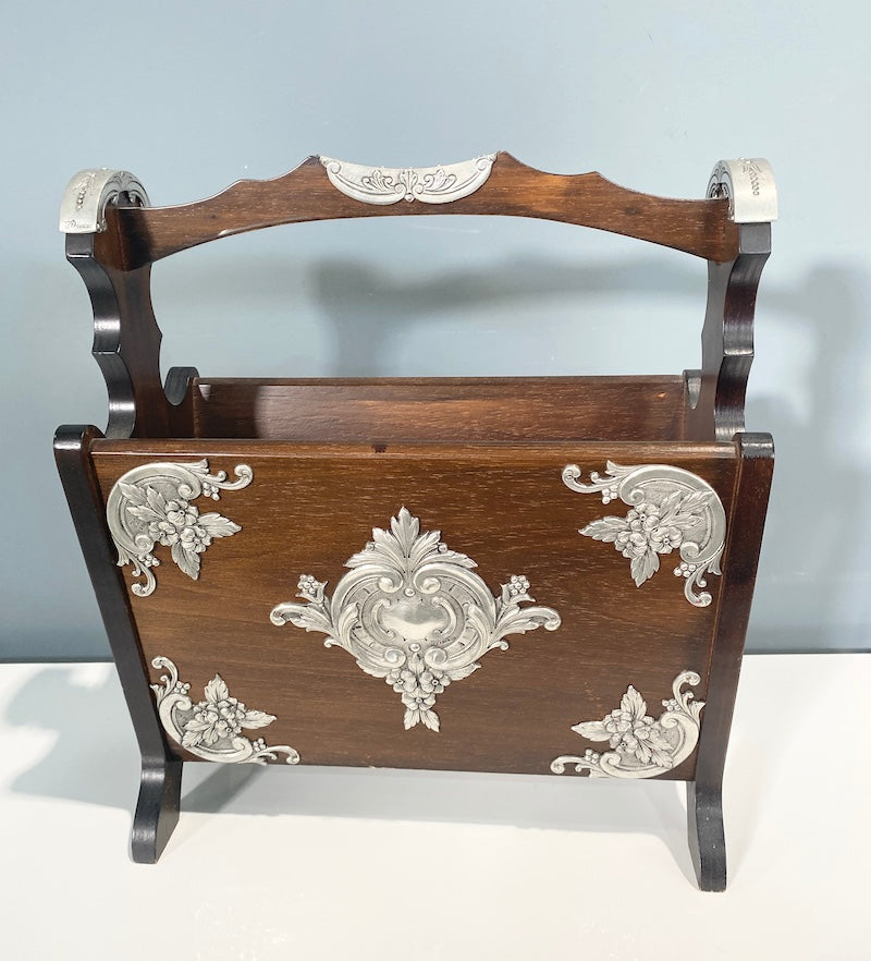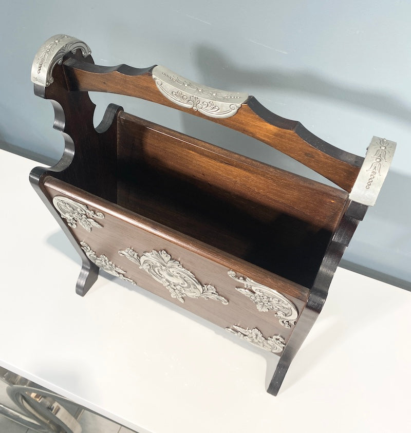 Este encantador porta-revistas vintage exibe uma bonita madeira esculpida com sofisticados detalhes prateados.