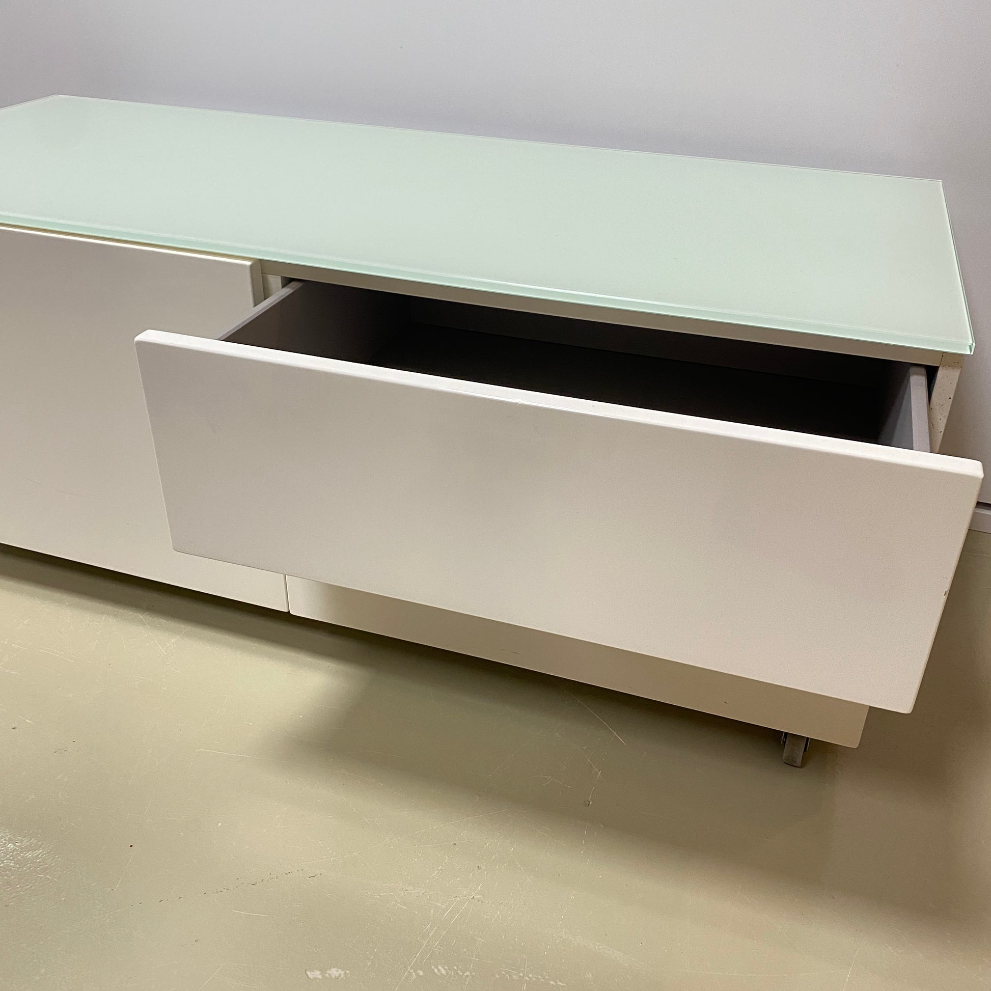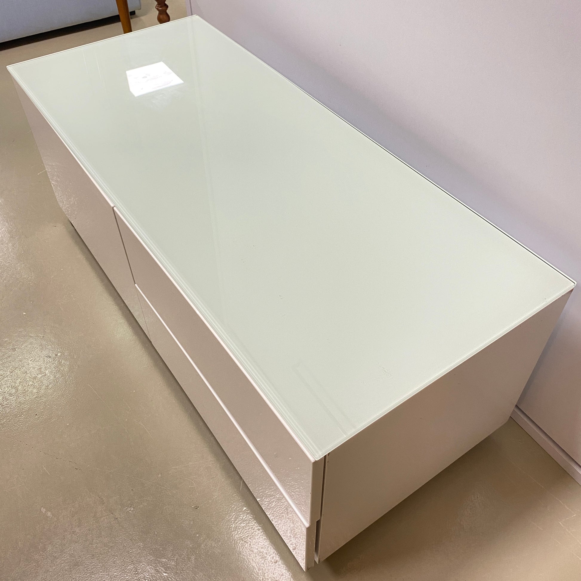 Sleek white media unit with glass top that combines minimalist design with functional sophistication. Great for minimalist living rooms or offices.