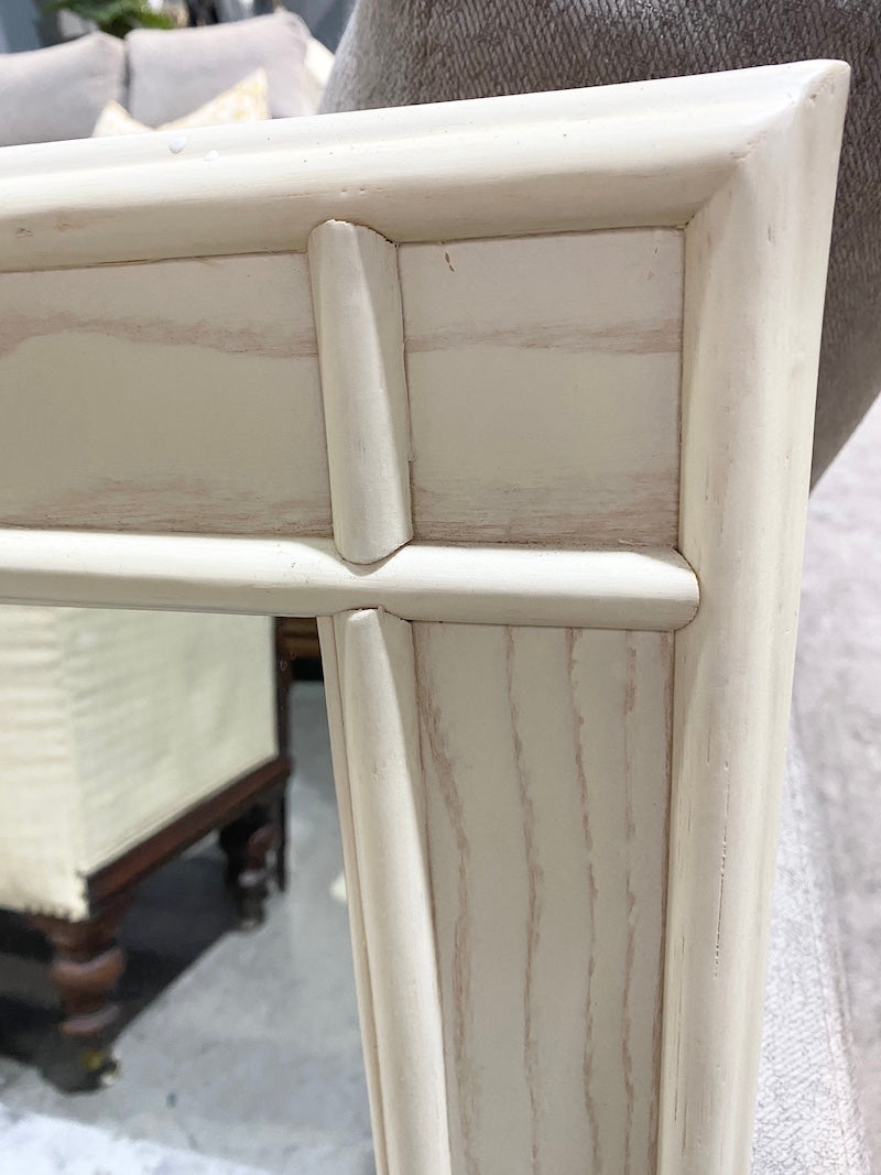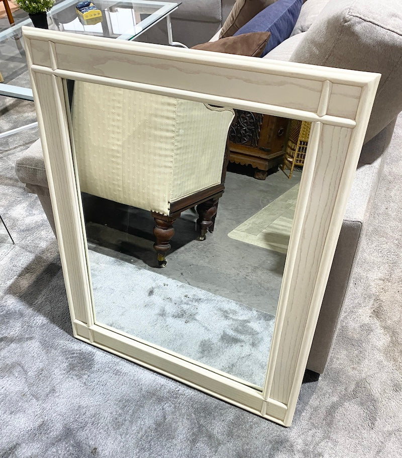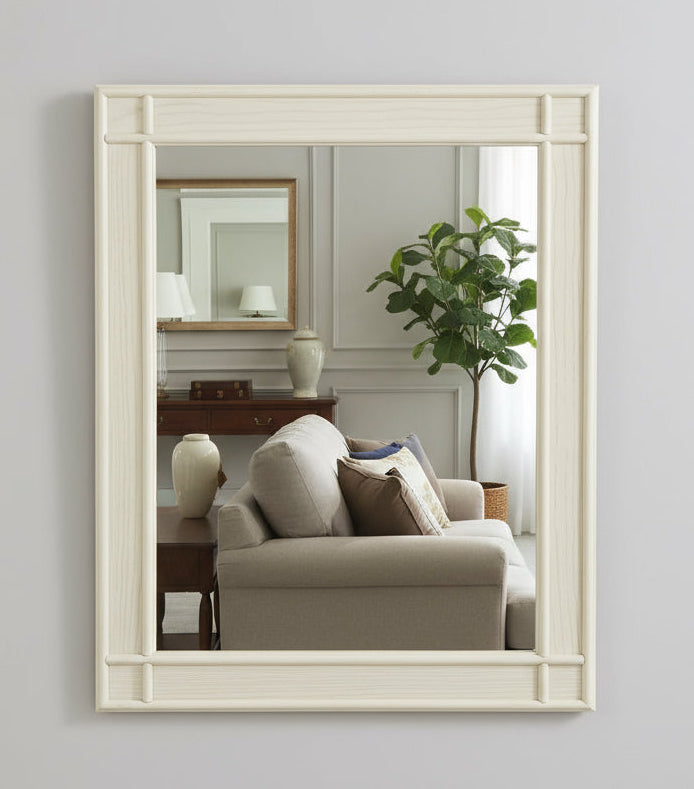 Um grande espelho emoldurado por uma elegante moldura creme.