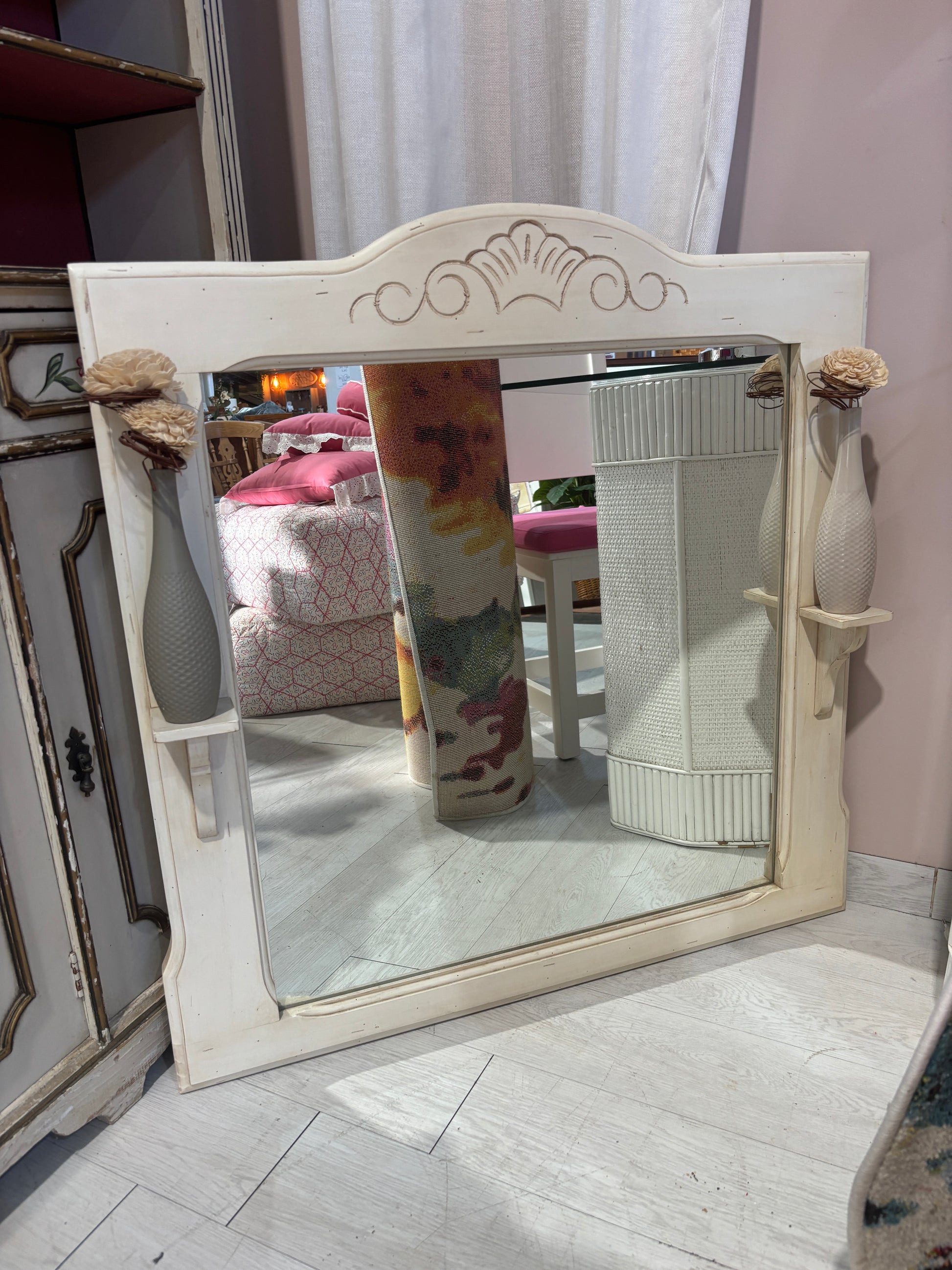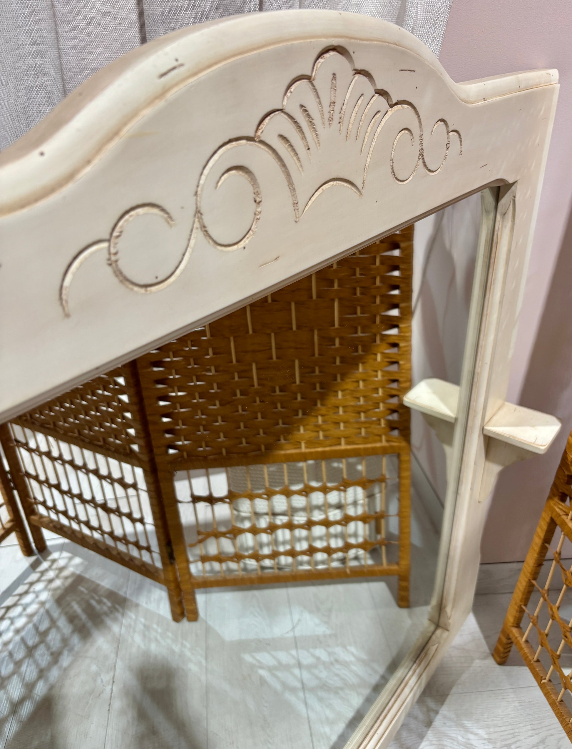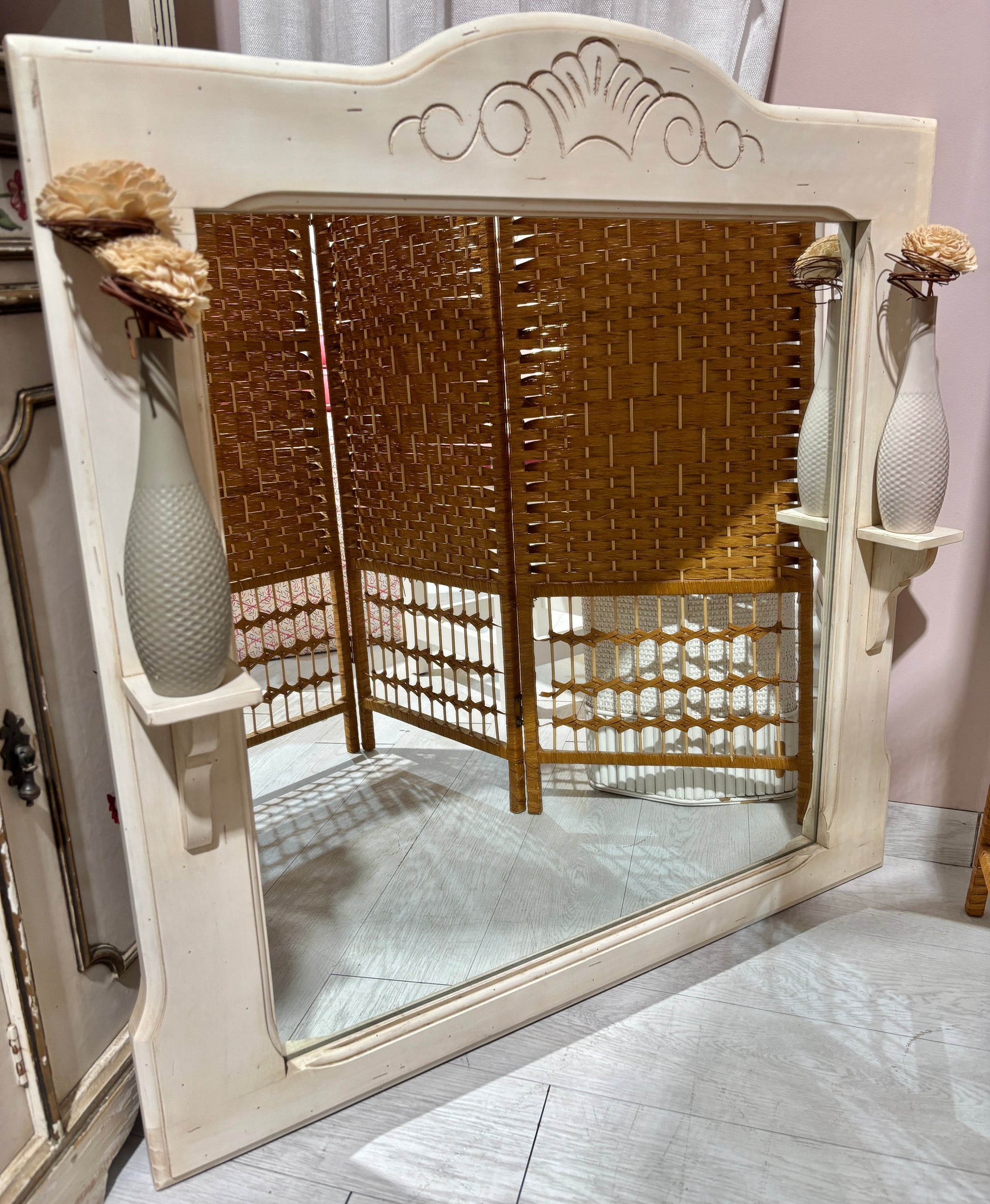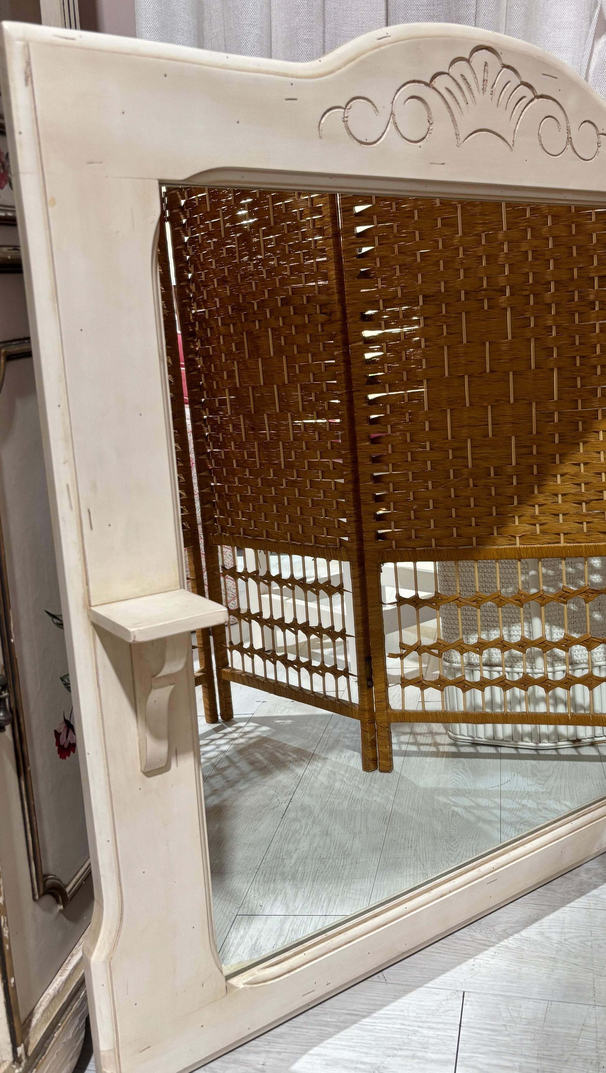 Este espelho com moldura de madeira pintada de creme possui um detalhe único: dois apliques de parede em cada lado, que ficariam perfeitos em velas de verdade ou de LED, ou ainda em potes decorativos com um cordão de luzes de fada.