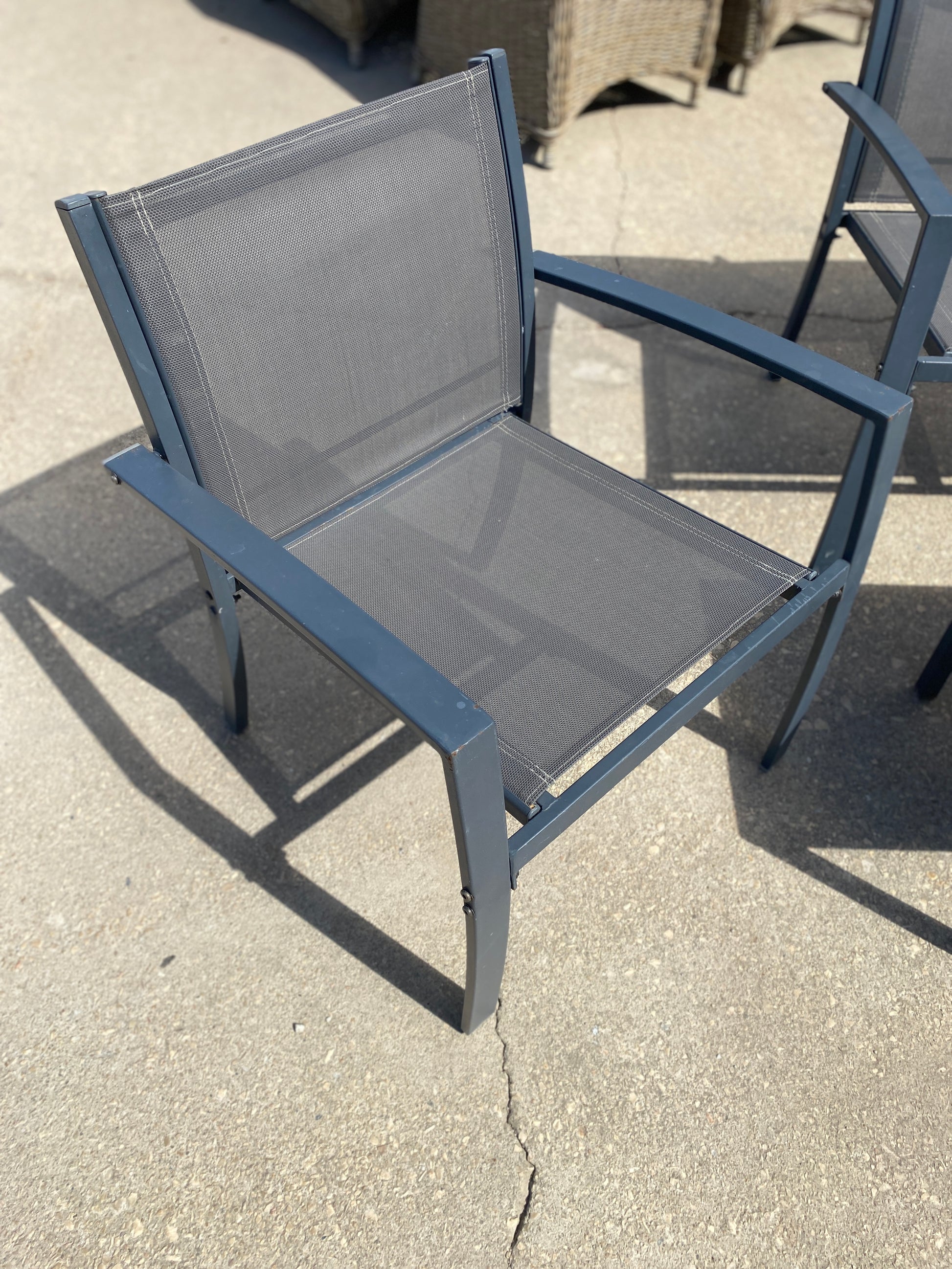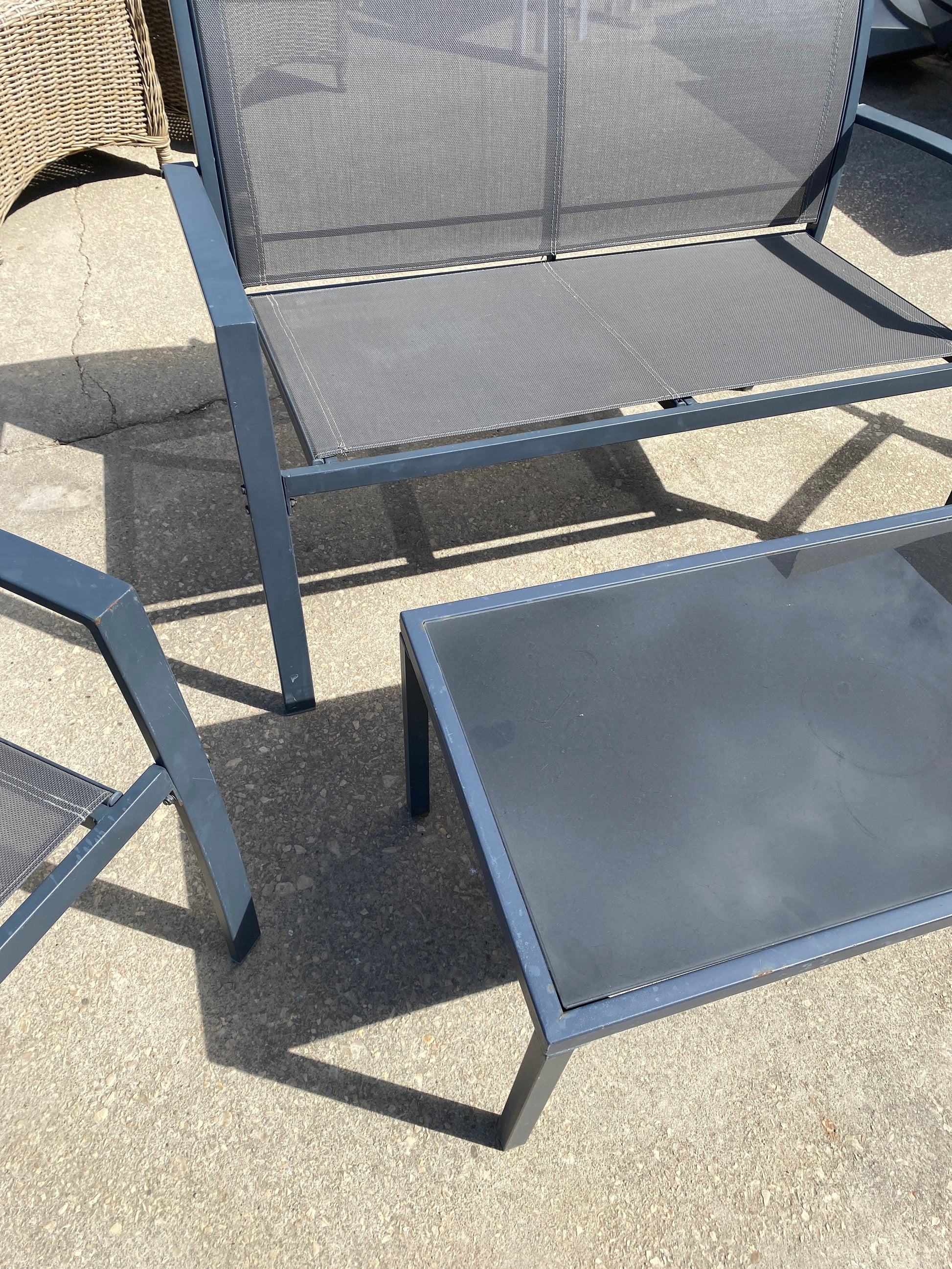 Este é um conjunto robusto de mobiliário para exteriores, feito de metal durável com um design em tela, perfeito para utilização durante todo o ano. Construído para resistir às intempéries e oferecer um aspeto elegante e prático, este conjunto é uma ótima opção para qualquer jardim, pátio ou varanda.