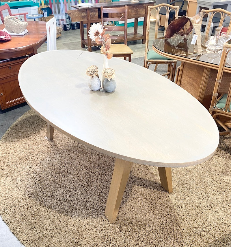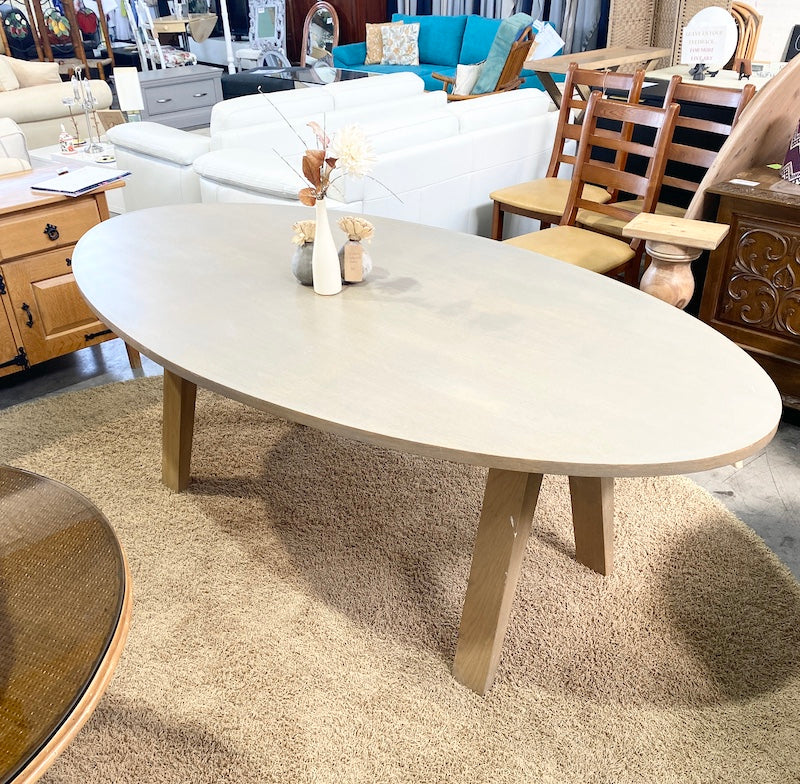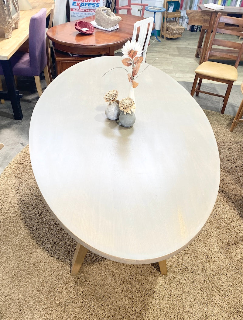Esta mesa de jantar oval feita à medida, com acabamento num suave tom cinza-claro, traz um toque de charme e elegância a qualquer divisão. Desenhada e produzida artesanalmente no Porto, conceituado pela sua tradição no fabrico de mobiliário, as suas curvas suaves convidam a jantares animados e a conversas aconchegantes, tornando cada refeição numa ocasião especial.