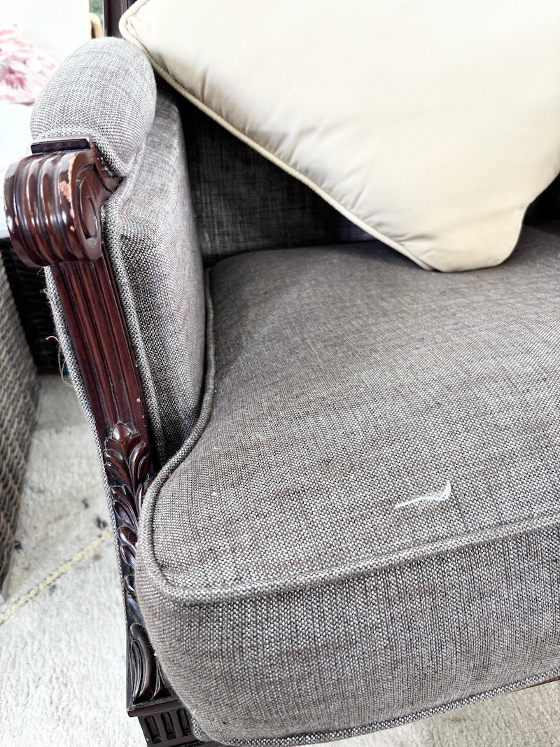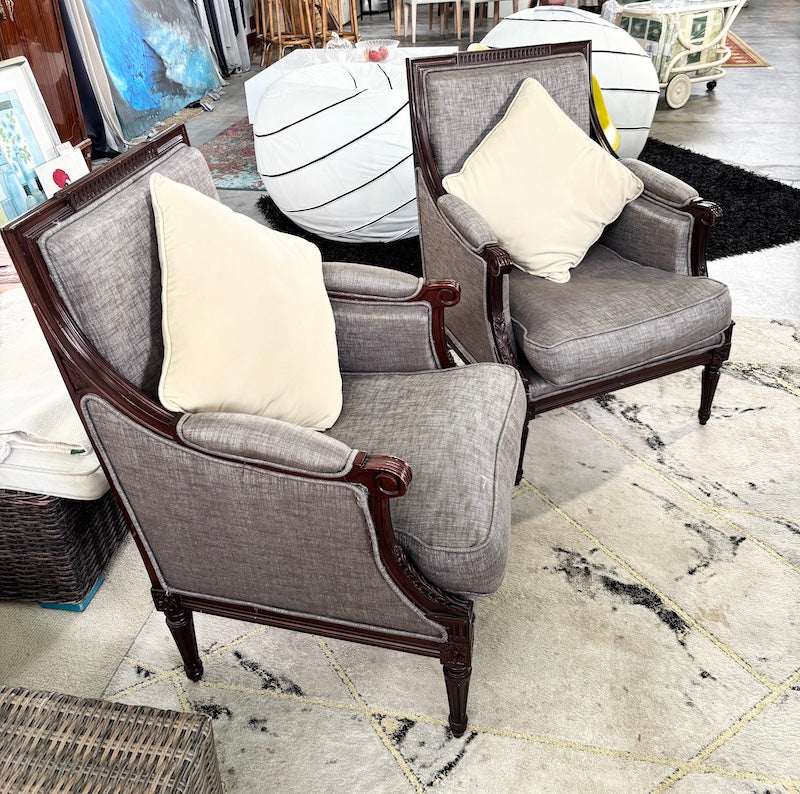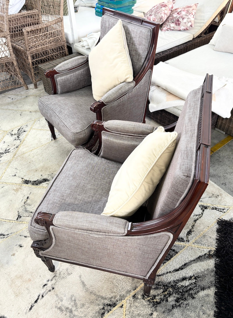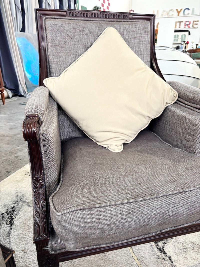 Esta é uma elegante poltrona neoclássica com um design tradicional e uma forte influência do estilo Luís XVI. Possui uma estrutura em madeira maciça escura com detalhes esculpidos nos braços e pernas, conferindo-lhe um aspeto requintado e ligeiramente antigo. O estofamento é em tecido cinza suave com uma textura subtil, que contrasta harmoniosamente com os ricos tons da madeira. Apresenta braços delicadamente curvados, encosto alto e confortável e assento profundo e acolchoado para maior conforto.