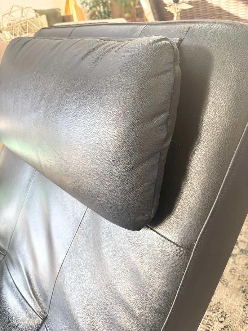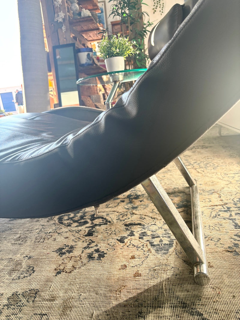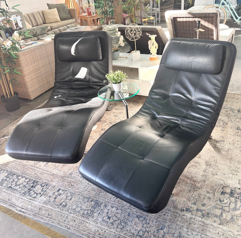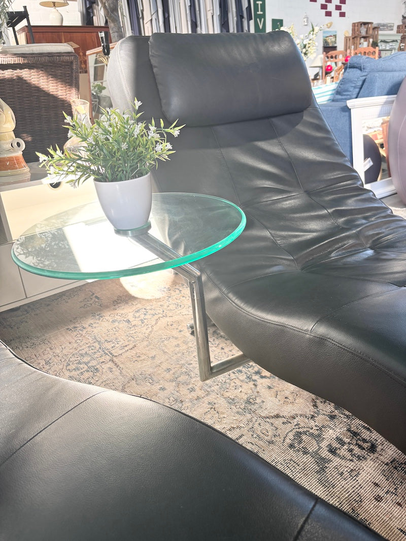 Um par de espreguiçadeiras pretas em pele sintética para uso interior, cada uma com a sua própria almofada integrada. Uma delas tem uma mesa lateral redonda de vidro acoplada num dos lados. Perfeitas para sestas à tarde! Note que o couro sintético apresenta alguns sinais de desgaste.